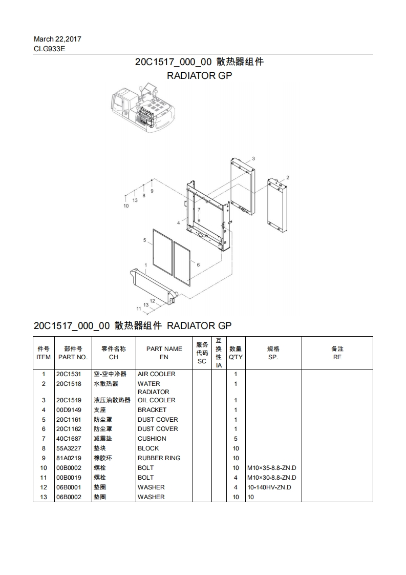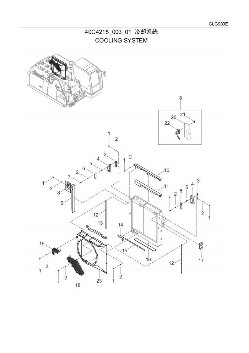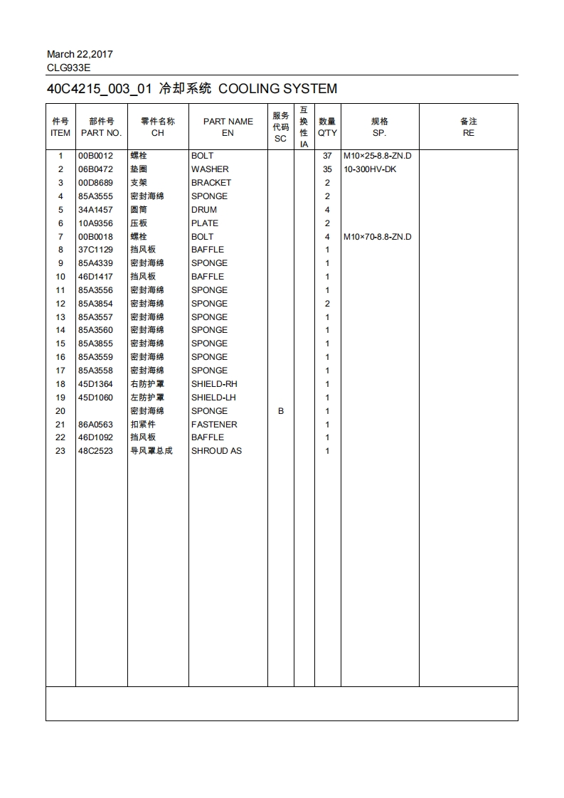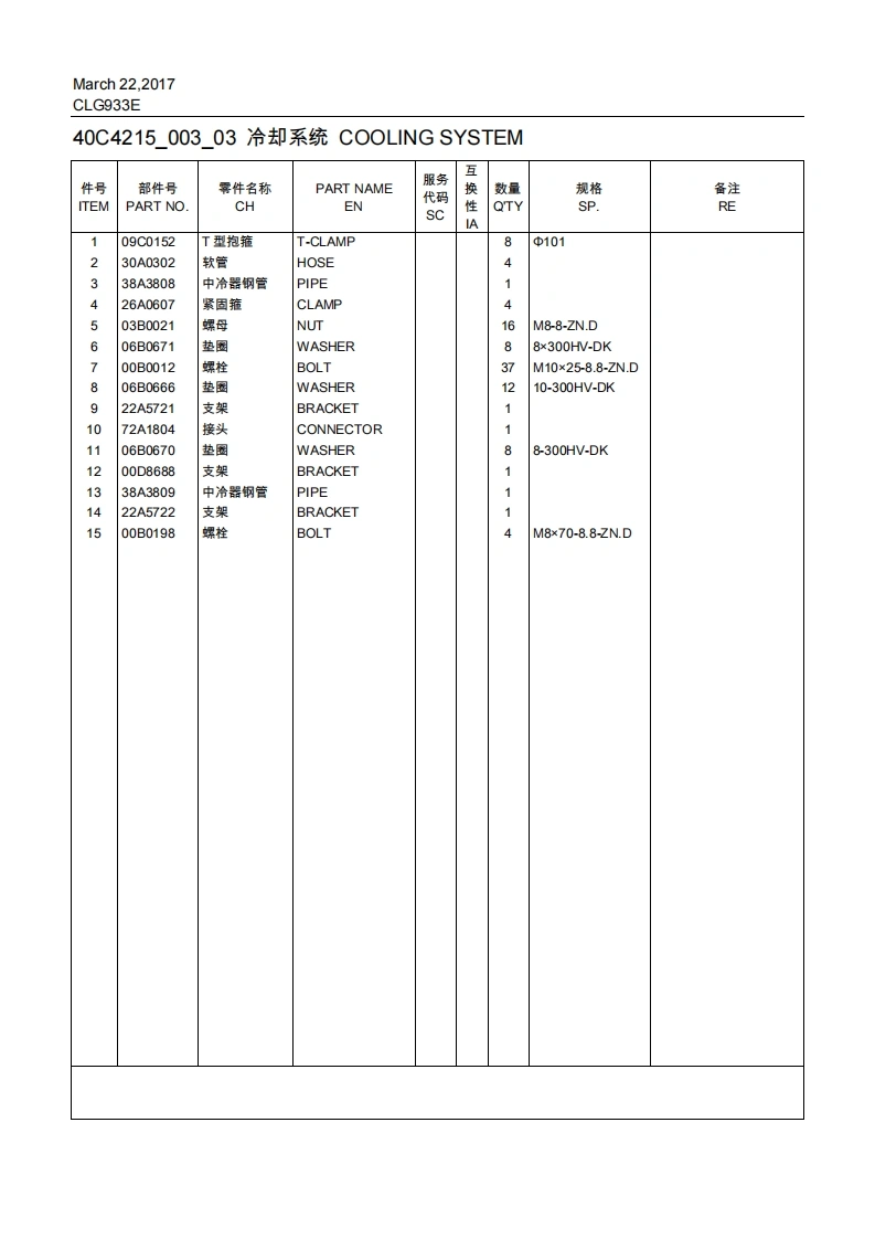 CLG933E动力系统POWER SYSTEM00Y0401000_00柴油机系统ENGINE SYSTEM互件号部件号霁件名称PART NAME服务数量规格备注ITEMPART NOCHEN代码s性QTYSP.REA140C2581柴油机DIESEL ENGINE1F-CLG930E-6CTAA40C4215希却系统COOLINGCSYSTEM40C6165发动机安装ENGINECMOUNTING40C6166燃油系统FUEL SYSTEMC140C7006进排气系统INTAKE ANDEXHAUSTSYSTEM柴油机系统骨ENGINEA架SYSTEM-SKEL