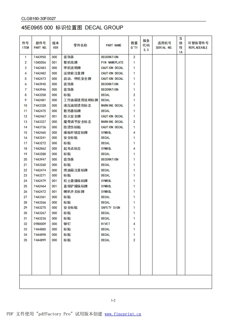 柳工Liugong_CLGB160零部件目录手册图册找手册网5天前发布关注私信10.77MB378页038柳工Liugong_CLGB160零部件目录手册图册此内容为付费资源,请付费后查看¥29¥31黄金会员免费钻石会员免费登录购买付费资源 第1页 / 共378页 第2页 / 共378页 第3页 / 共378页 第4页 / 共378页 第5页 / 共378页 第6页 / 共378页 第7页 / 共378页 第8页 / 共378页 第9页 / 共378页 第10页 / 共378页 试读已结束,还剩368页,您可下载完整版后进行离线阅读 THE END柳工/临工/龙工/台励福/常林/成工 文本预览 CLGB160-30F0027标志牌DECAL45E0965000标识位置图DECAL GROUP9●”。2:工。2二81-1PDF文件使用"pdfFactory Pro”试用版本创建ww.fineprint..cn 查看更多 收起部分 喜欢就支持一下吧收藏