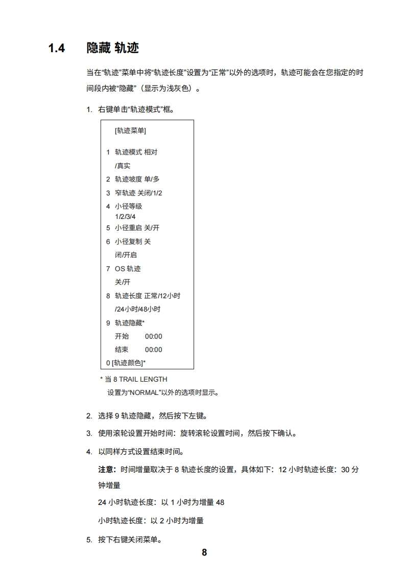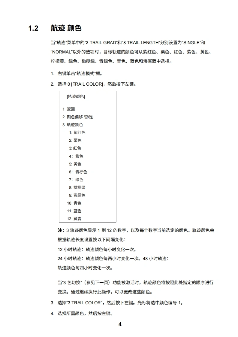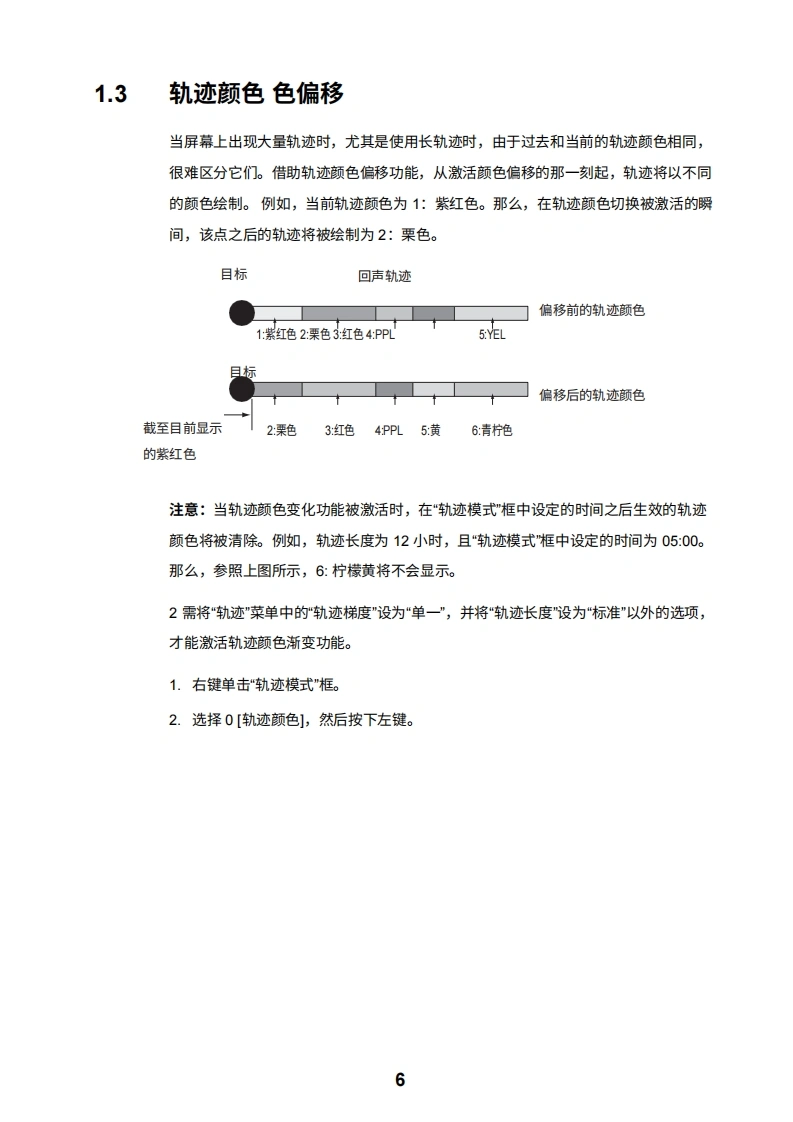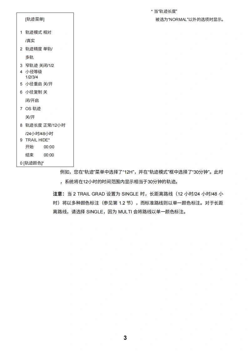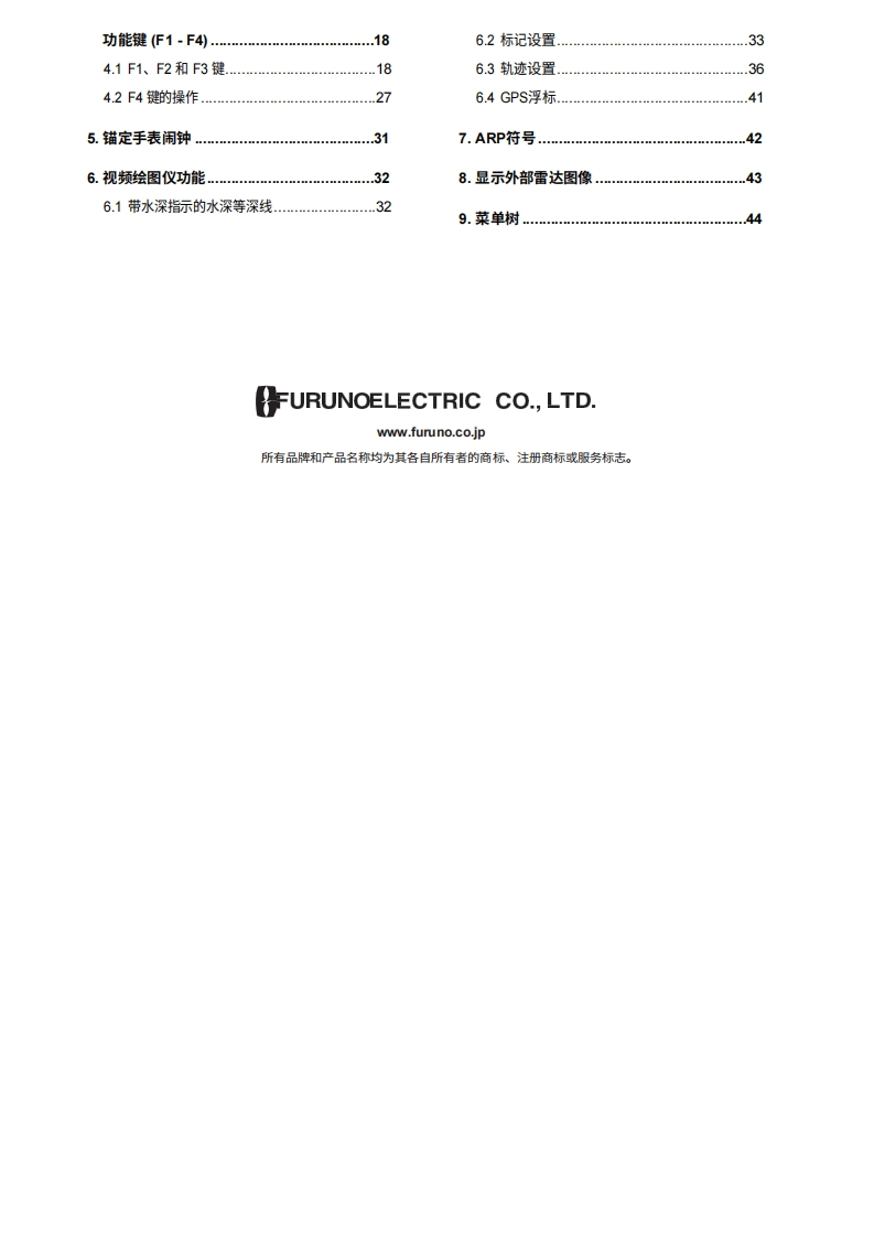MARINE RADARFAR-2107/FAR-2807系列操作手册。渔船专用型号本手册旨在提供FAR-2107FAR-2807系列雷达渔船规格型号(50kW和60kW型号)可用功能的操作程序。本手册是《操作手册》的补充,后者涵盖了该雷达系列所有雷达的通用功能。规格类型在安装过程中设定。详情请咨询FURUNO代理商或经销商。通过菜单进行操作时,需旋转滚轮选择菜单项或选项,然后按下滚轮或左键以确认选择。为简洁起见,当您旋转滚轮进行选择时,我们将写为“选择XXX”(仪XX=菜单项名称);当您确认选择时,则写为“按下左键”。目录1.目标轨迹功能,.23.5VRM,光标单元171.1长距离路线23.6弹出式指引.171.2路线颜色34。1.3小径颜色变化..41.4隐藏轨迹.51.5路径擦除61.6狭窄小径.71.7防止真实海面杂波轨迹72.光标.82.1十字准星光标大小.....82.2网络光标..92.3光标数据显示。..112.4方位角刻度格式.123.其他功能……。..133.1回波显示区域.133.2开启/佚闭屏幕框143.3雷达图像颜色.153.4轴承参考.16