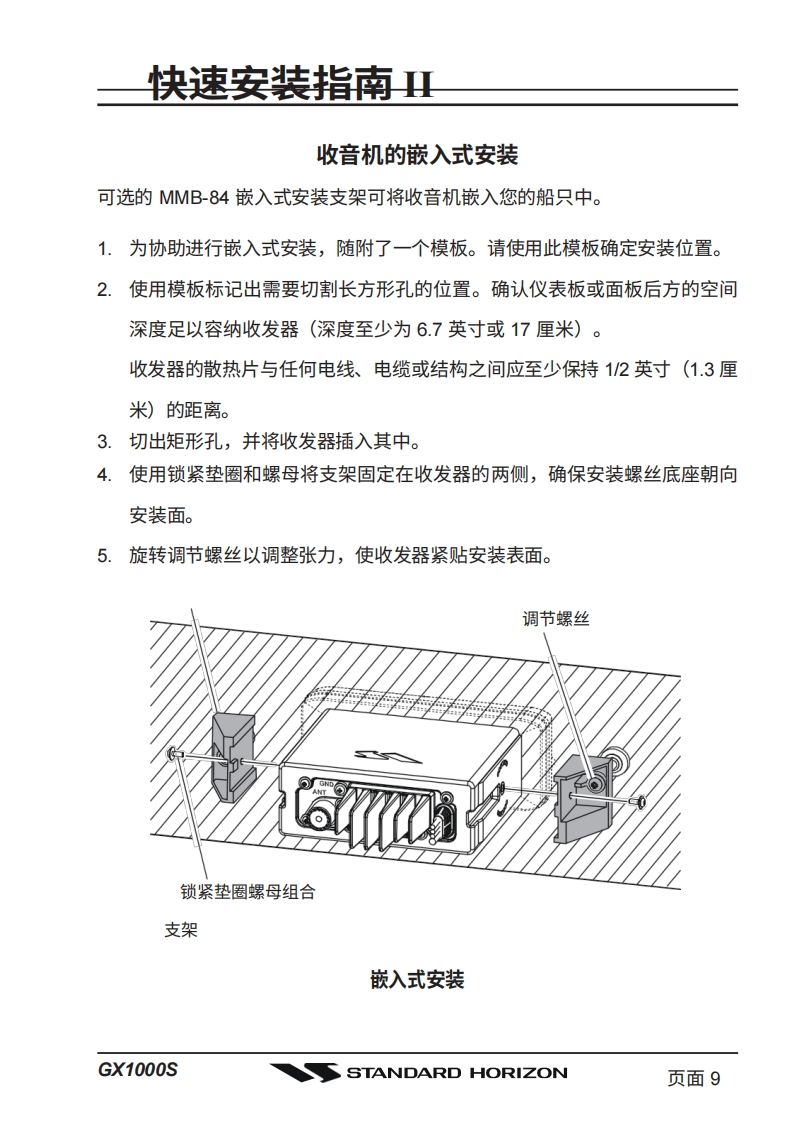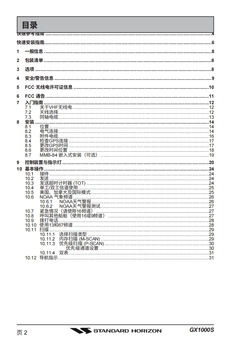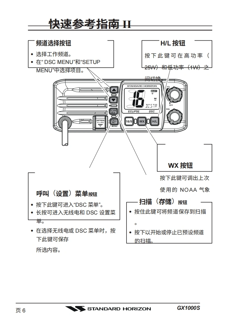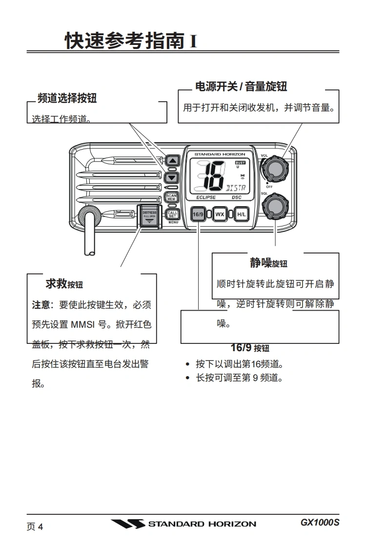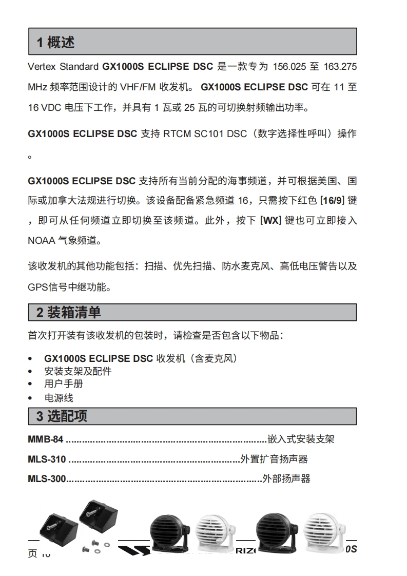 STARDARD-HORION-GX1000S-操作说明书手册-20260408中文版找手册网3天前发布关注私信4.63MB102页046STARDARD-HORION-GX1000S-操作说明书手册-20260408中文版此内容为付费资源,请付费后查看¥19¥21黄金会员免费钻石会员免费登录购买付费资源 第1页 / 共102页 第2页 / 共102页 第3页 / 共102页 第4页 / 共102页 第5页 / 共102页 第6页 / 共102页 第7页 / 共102页 第8页 / 共102页 第9页 / 共102页 第10页 / 共102页 试读已结束,还剩92页,您可下载完整版后进行离线阅读 THE ENDStandard-horizon 文本预览 STANDARD HORIZONECLIPSE DSC GX1000S25瓦VHF/FMDSC船用收发机用户手册●经济实惠的超紧凑型固定安装VHF电台1PX7级防水前面板SC-101DSC(数字选择性呼叫)带位置报告和请求功能0可编程扫描、优先级扫描和双监听●显示屏可选择显示频道名称或GPS经纬度※●操作简便●所有美国/国际及加拿大海事频道NOAA气象频道,带气象警报X需连接GPS接收器 查看更多 收起部分 喜欢就支持一下吧收藏