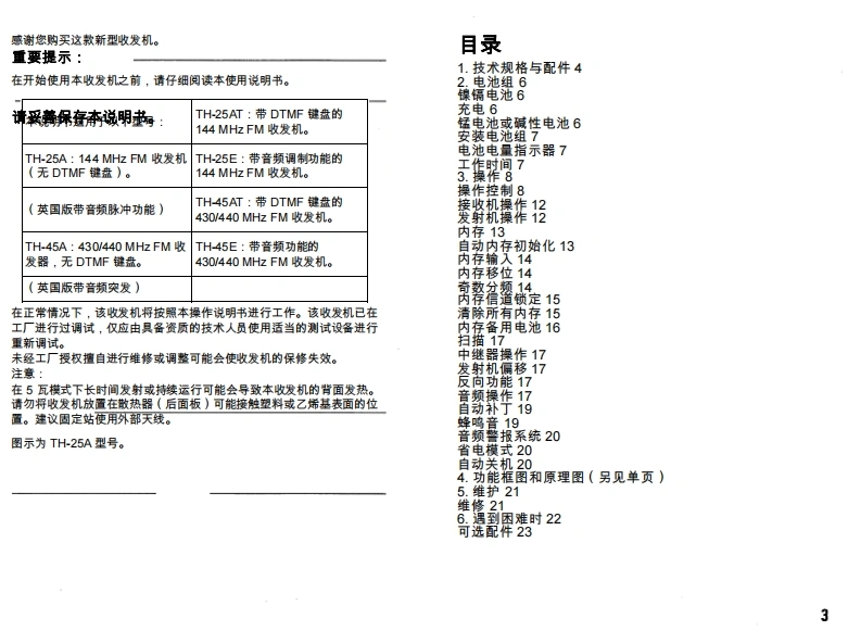 建武th25-45-series_使用说明书手册中文版找手册网3天前发布关注私信3.24MB24页043建武th25-45-series_使用说明书手册中文版此内容为付费资源,请付费后查看¥19¥21黄金会员免费钻石会员免费登录购买付费资源 第1页 / 共24页 第2页 / 共24页 第3页 / 共24页 第4页 / 共24页 第5页 / 共24页 第6页 / 共24页 第7页 / 共24页 第8页 / 共24页 第9页 / 共24页 第10页 / 共24页 试读已结束,还剩14页,您可下载完整版后进行离线阅读 THE END建武 文本预览 TH-25系列TH-45系列144MHz、430/440 MHz FM收发机使用说明书KENWOOD©日本印刷B50-8260-000(T)89/12111098765432188/1211109876543 查看更多 收起部分 喜欢就支持一下吧收藏