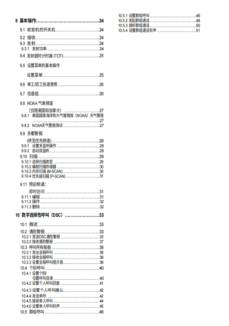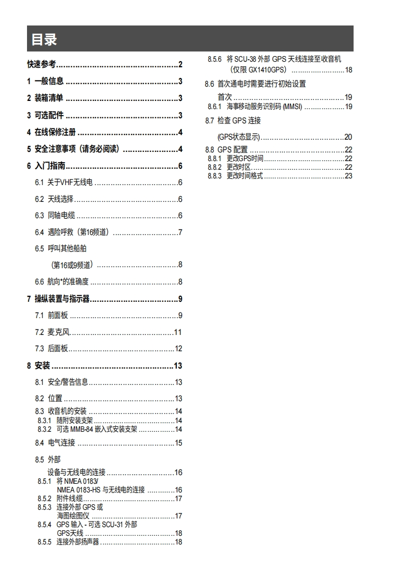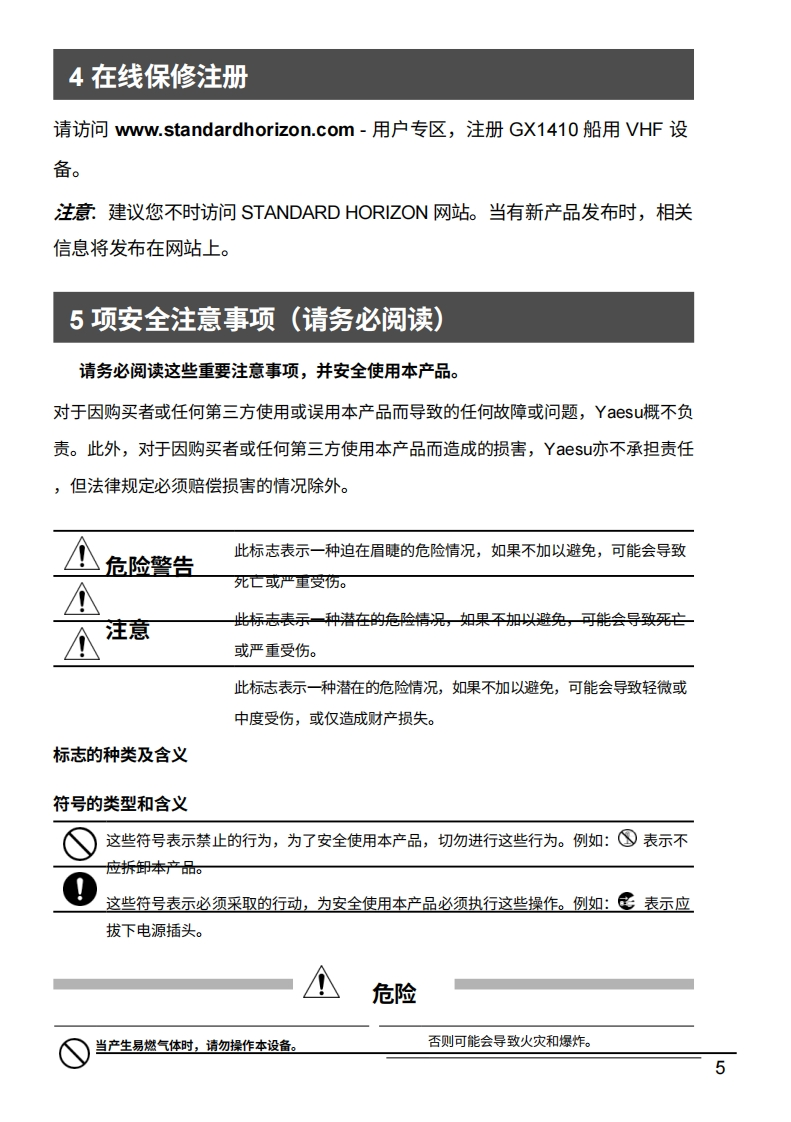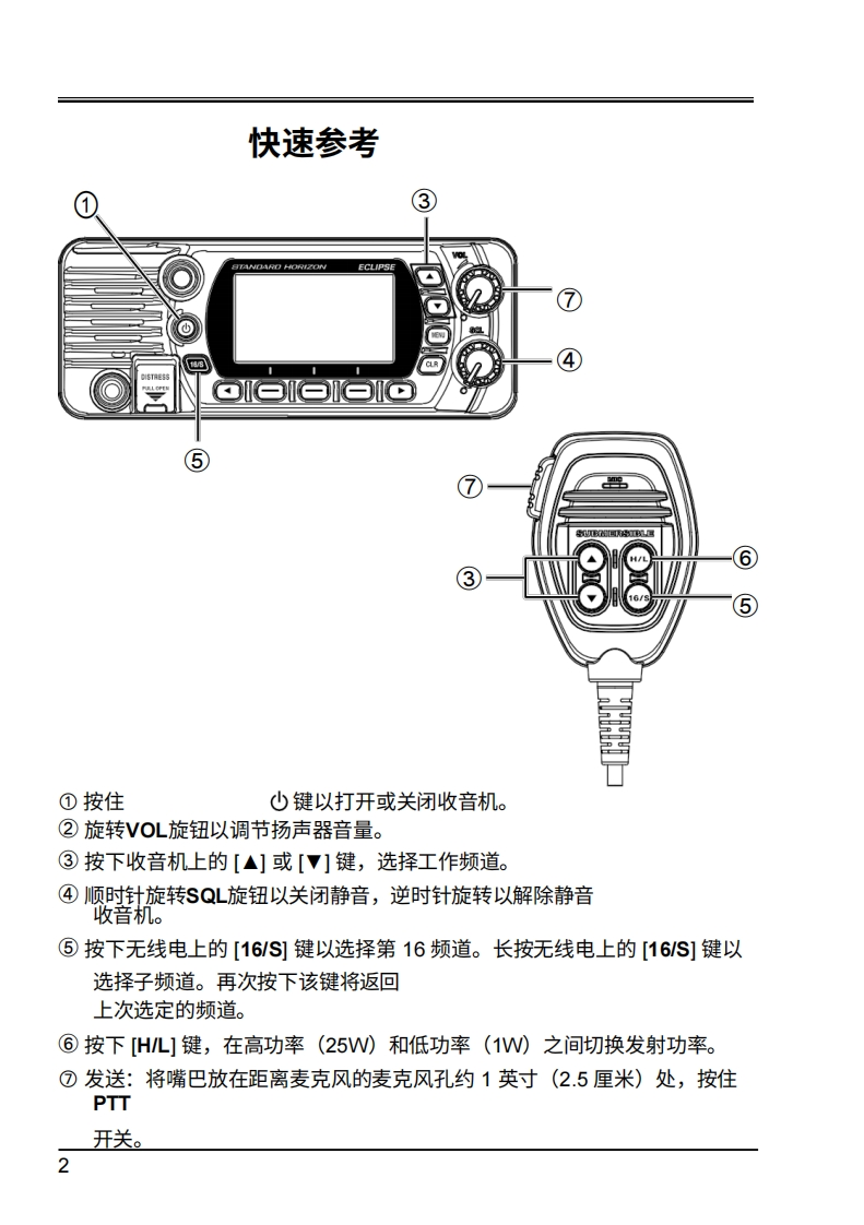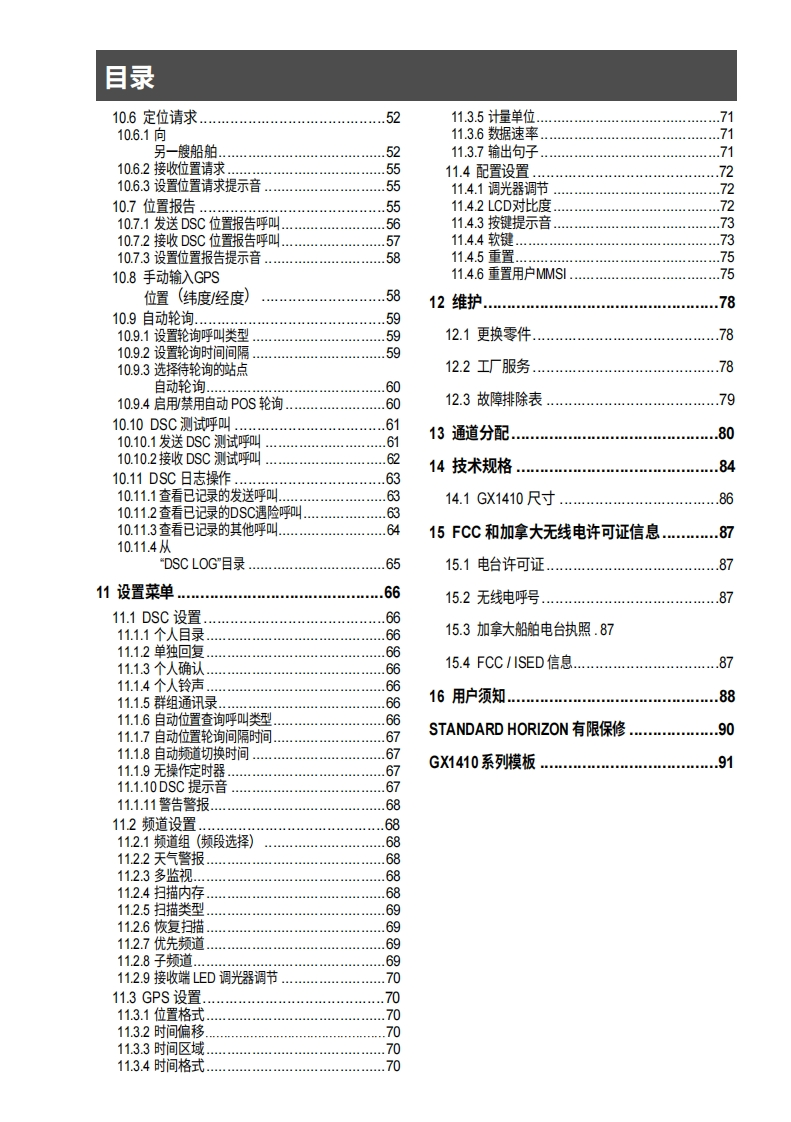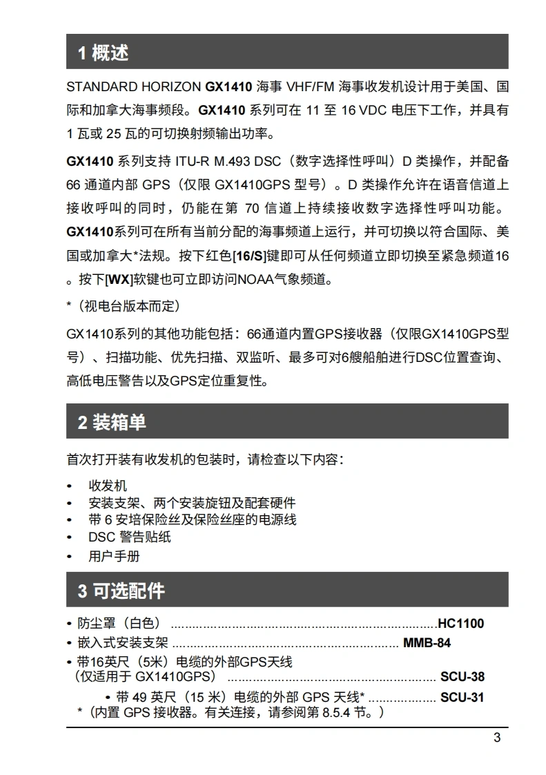 用户手册ECLIPSE GPSGX1410GPSECLIPSEGX1410●符合ITU-RM.493-16D类DSC(数字选择性呼叫)标准●可向兼容NMEA0183的设备输入和输出GPS信息●内置66通道GPS接收器(仅限GX1410GPS)●内置独立接收器用于CH70(接收DSC呼叫)●可自动轮询多达6艘船舶的GPS位置·自动DSC频道选择及DSC测试呼叫●DSC遇险呼叫、单船呼叫、群组呼叫、全船呼叫、位置请求及位置报告●大尺寸可视显示屏,安装简便,PX8级防水(可在1.5米水深中持续使用30分钟)●带频道切换功能的降噪麦克风,配备16/S和HL按键●GPS位置和时间显示在全点阵显示屏上*●预设键,可调用多达10个常用频道·可编程扫描、优先扫描及多监听(双监听或三监听)●带频道切换、16/S及HL键的降噪麦克风*GX1410需配备外部GPS设备。3郭瓶16移超圈STANDARD HORIZONNothing takes to water like Standard Horizon