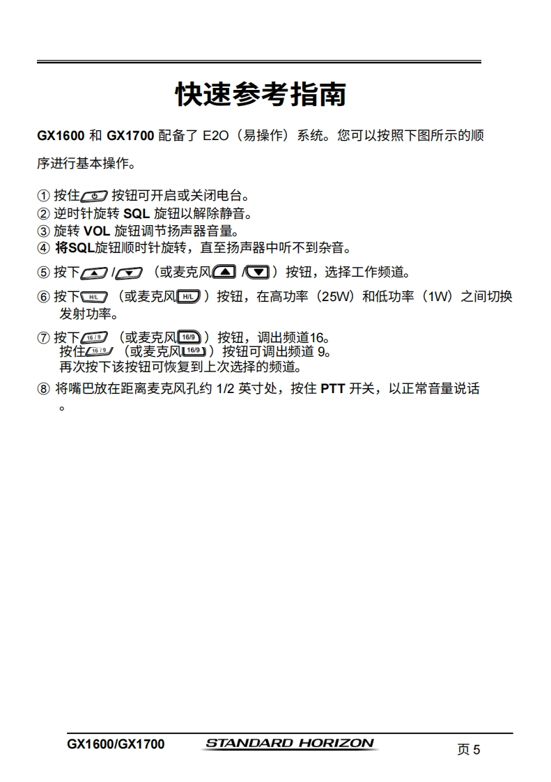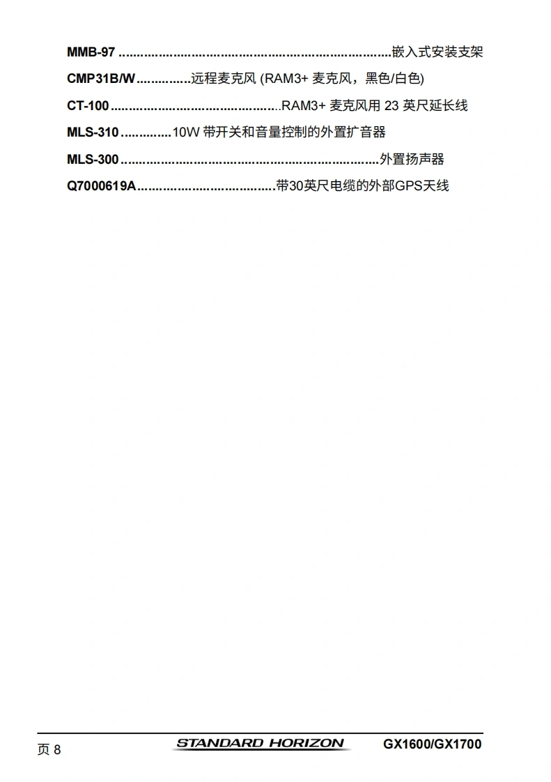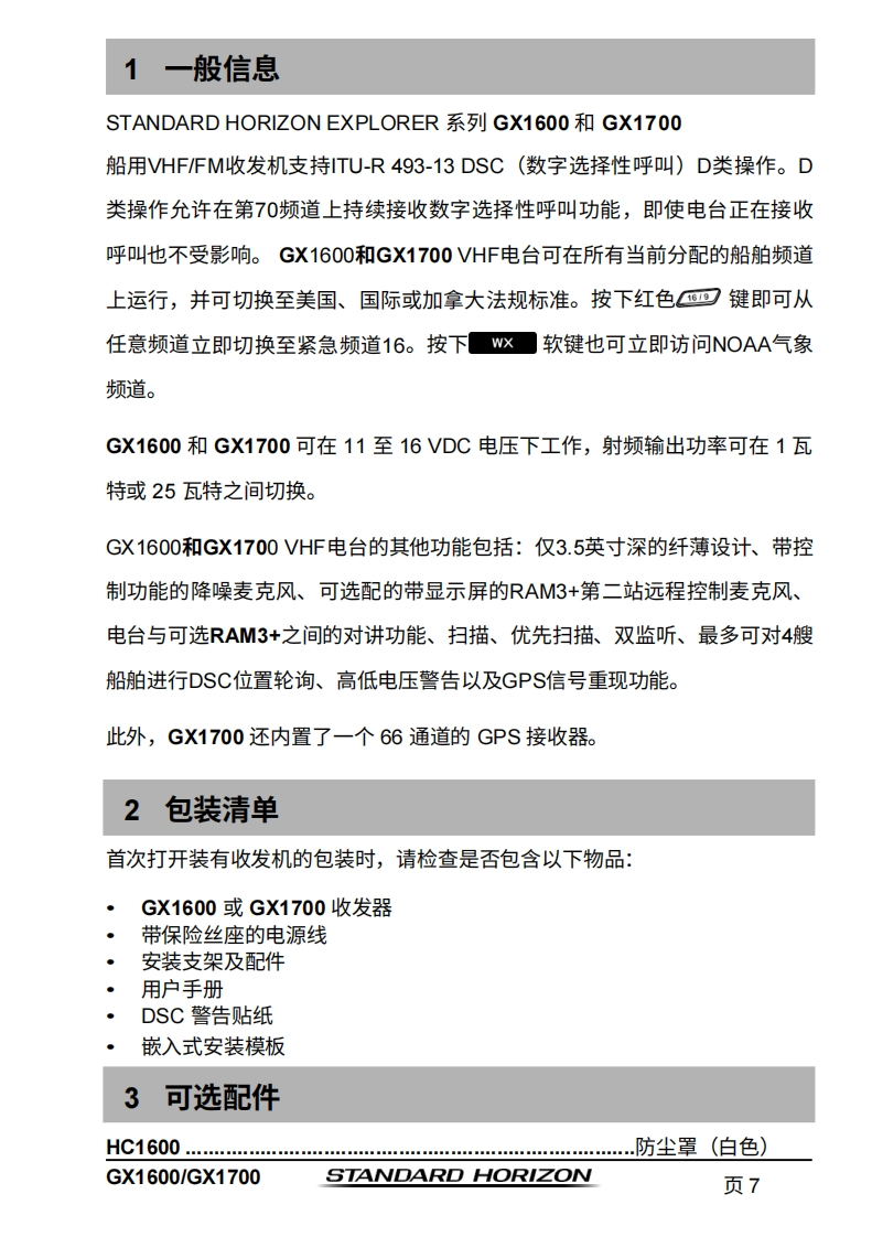 STANDARD HORIZONNothing takes to water like Standard HorizonEXPLORER系列GX1600和GX170025瓦VHF/FM船用收发机用户手册●超薄紧凑的后壳设计(深度3.5英寸)●符合ITU-RM493-13D类DSC(数字选择性呼叫)标准●内置66通道NAAS GPS接收器(GX1700)●前面板内置GPS天线,无论采用支架安装还是嵌入式安装,均可接收信号(GX1700)●带罗盘页面的DSC遇险呼叫导航●DSC测试呼叫和自动DSC频道切换选择01使用DSC自动采集最多4艘船舶的GPS位置●在“罗盘”页面输入、保存并导航至航点*●导航(纬度/经度、船速及航向)信息显示在屏幕上*●防水深度达1.5米(4.92英尺),持续30分钟带信道选择、16/9及HL键的降噪麦克风带警报功能的NOAA气象频道选择●可编程扫描、优先扫描及双监听●预设键可存储多达10个常用频道,并具备扫描功能·超大点阵显示屏,支持自定义频道名称及GPS罗盘显示●通过NMEA接口输入GPS信息,并可将数据传输至其他兼容NMEA的设备可编程软键●可连接至第二站远程访问麦克风CMP31●压铸机箱●尺寸:5.9英寸宽×3.4英寸高×3.6英寸深●嵌入式安装孔:5.4英寸宽×2.8英寸高×2.6英寸深●3年防水保修*连接GX1600的可选GPS时出m】