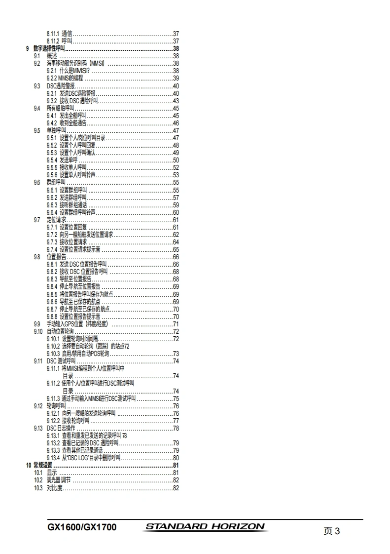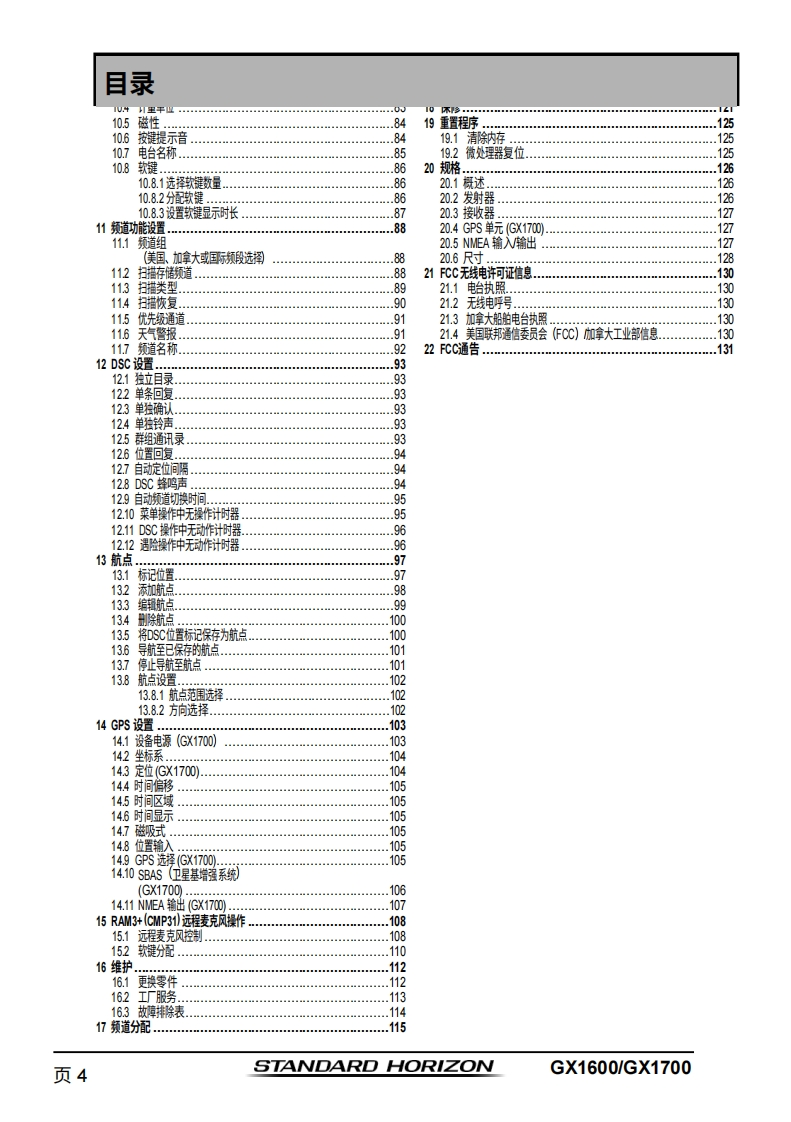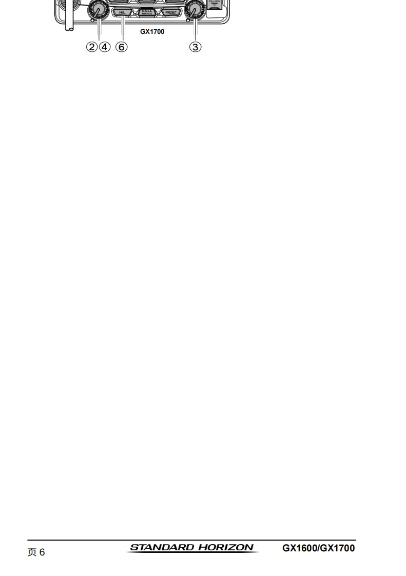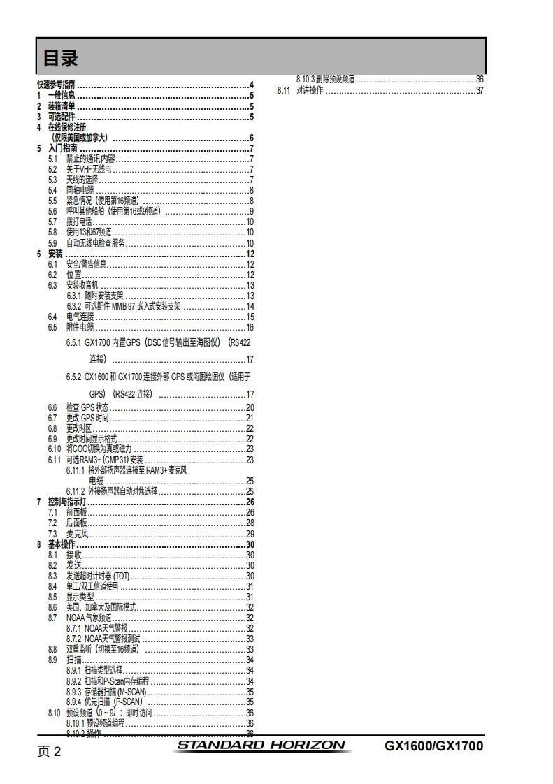 STANDARD HORIZONNothing takes to water like Standard HorizonEXPLORER系列GX1600和GX170025瓦VHF/FM船用收发机用户手册●超薄紧凑的后壳设计(深度3.5英寸)●符合ITU-RM493-13D类DSC(数字选择性呼叫)标准●内置66通道NAAS GPS接收器(GX1700)●前面板内置GPS天线,无论采用支架安装还是嵌入式安装,均可接收信号(GX1700)●带罗盘页面的DSC遇险呼叫导航●DSC测试呼叫和自动DSC频道切换选择01使用DSC自动采集最多4艘船舶的GPS位置●在“罗盘”页面输入、保存并导航至航点*●导航(纬度/经度、船速及航向)信息显示在屏幕上*●防水深度达1.5米(4.92英尺),持续30分钟带信道选择、16/9及HL键的降噪麦克风带警报功能的NOAA气象频道选择●可编程扫描、优先扫描及双监听●预设键可存储多达10个常用频道,并具备扫描功能·超大点阵显示屏,支持自定义频道名称及GPS罗盘显示●通过NMEA接口输入GPS信息,并可将数据传输至其他兼容NMEA的设备可编程软键●可连接至第二站远程访问麦克风CMP31●压铸机箱●尺寸:5.9英寸宽×3.4英寸高×3.6英寸深●嵌入式安装孔:5.4英寸宽×2.8英寸高×2.6英寸深●3年防水保修*连接GX1600的可选GPS时出m】
