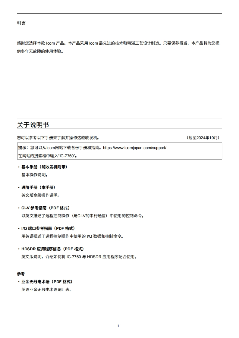 艾可慕IC-7760_操作说明书手册-Advanced20260331中文版找手册网2天前发布关注私信18.37MB166页048艾可慕IC-7760_操作说明书手册-Advanced20260331中文版此内容为付费资源,请付费后查看¥19¥21黄金会员免费钻石会员免费登录购买付费资源 第1页 / 共166页 第2页 / 共166页 第3页 / 共166页 第4页 / 共166页 第5页 / 共166页 第6页 / 共166页 第7页 / 共166页 第8页 / 共166页 第9页 / 共166页 第10页 / 共166页 试读已结束,还剩156页,您可下载完整版后进行离线阅读 THE END艾可慕 文本预览 icom高级手册HF/50MHz收发机1高级连接I77●2高级操作3示波器操作(进阶)4SD卡USB闪存盘(高级)5录音机功能6语音传输存储功能7存储器操作8扫描9天线调谐器操作(高级)10时钟与定时器(进阶)11其他功能本手册介绍了高级功能和操作说明。12维护(高级)有关注意事项和基本操作,请参阅随收发器附带的《基本手册》。13更新固件 查看更多 收起部分 喜欢就支持一下吧收藏