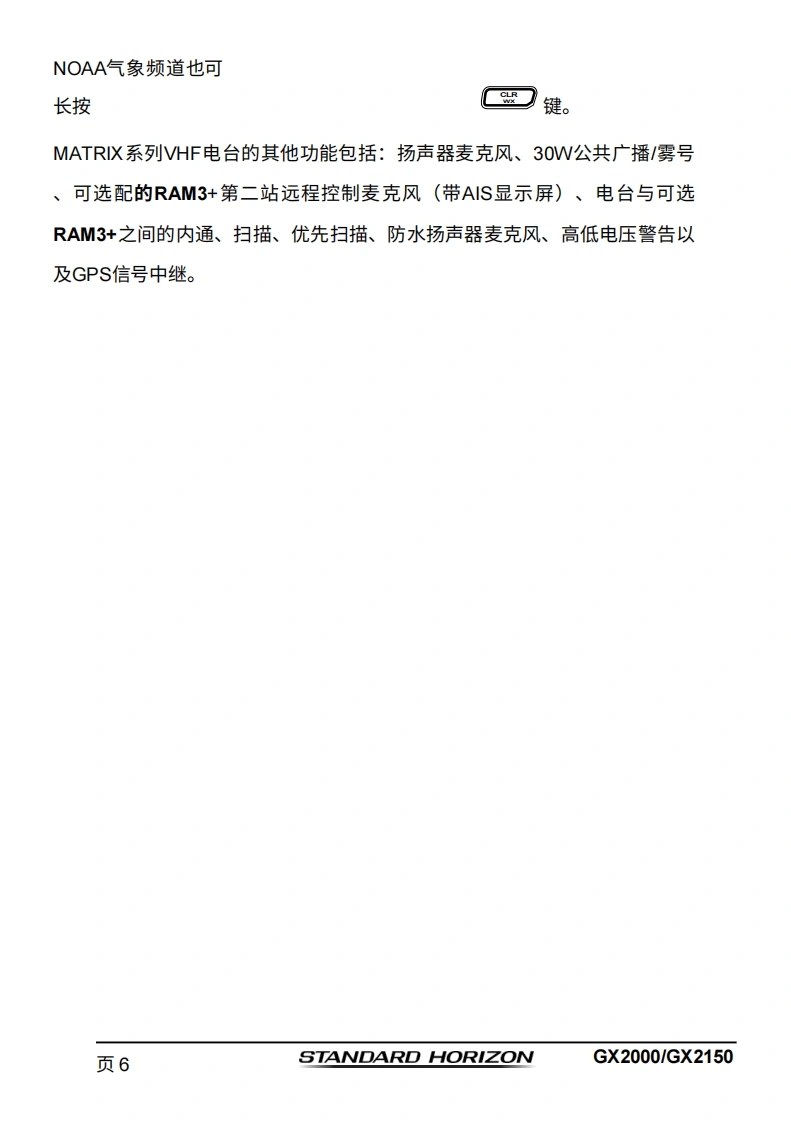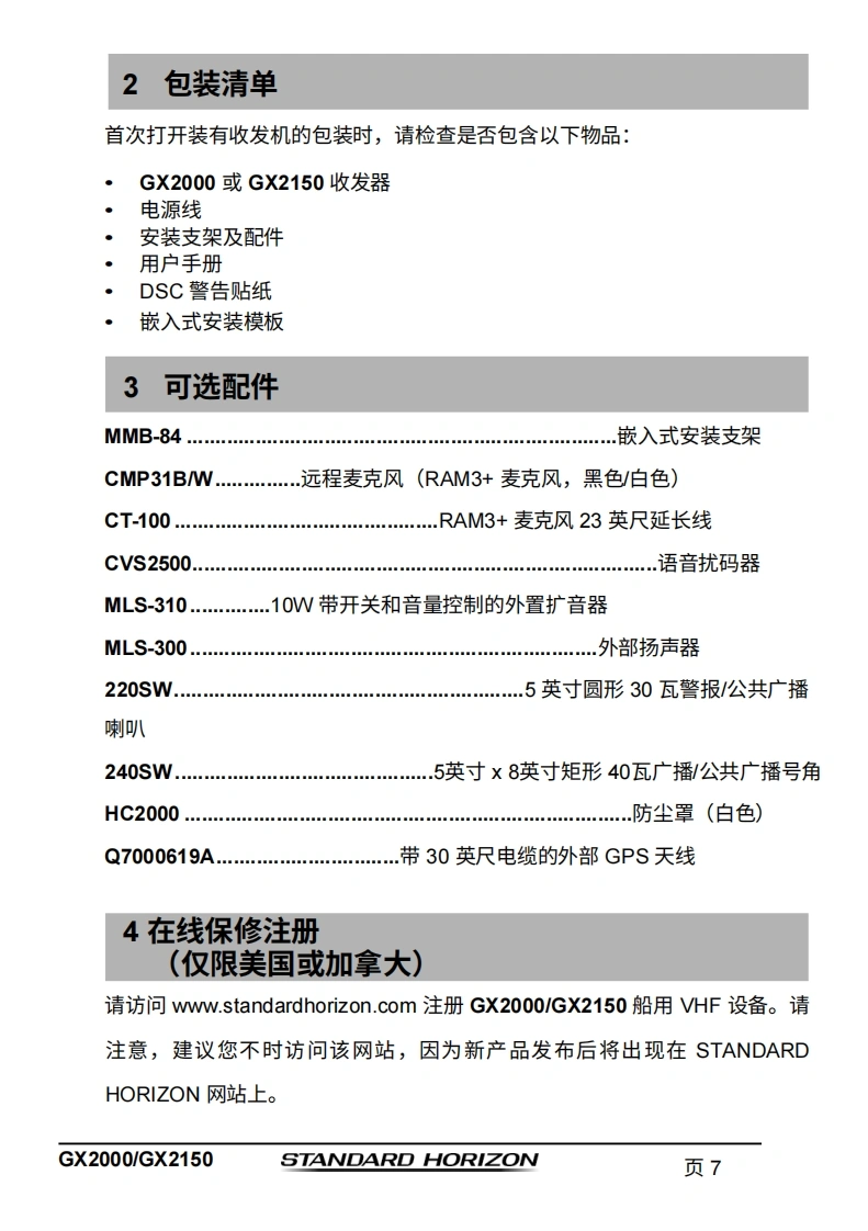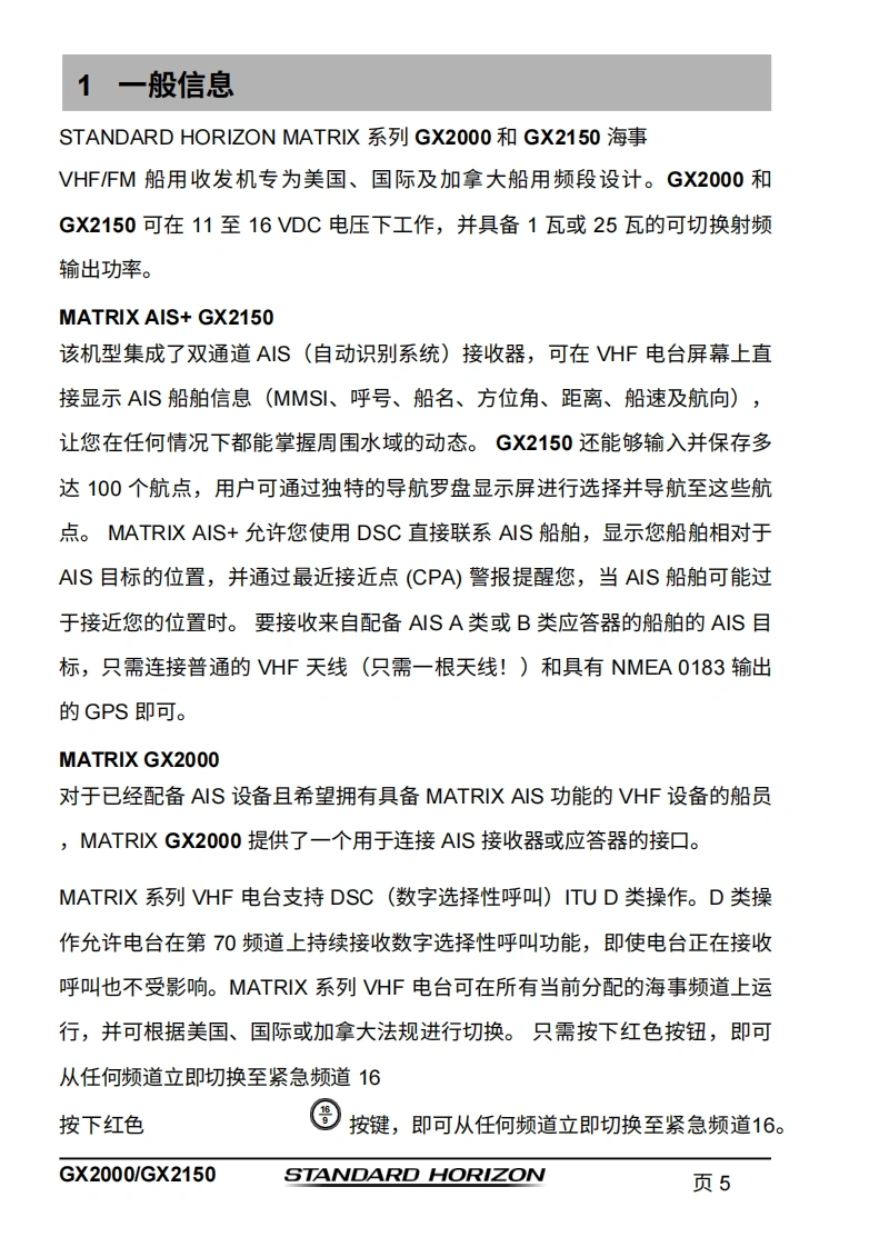 STANDARD HORIZONNothing takes to water like Standard HorizonMATRIX系列GX2000和GX215025瓦VHF/FM船用收发机用户手册GX2000:通过外接AIS接收器或应答器支持A1S●GX2150:集成双通道A1S(自动识别系统)接收器●GX2150:针对带1个NMEA端口的绘图仪,可选择4800或38400NMEA波特率GX2150:在A1S显示屏上可使用PA或雾号信号AIS显示屏上的真航向和磁航向选择※AIS目标显示包括MMSL、呼号、船名、方位角、距离、船速及航向※通过DSC※与A类或B类AIS船舶建立联系可编程的CPA或TCPA防撞警报※ITUD类DSC(内置独立70频道接收器)导航信息(纬度/经度、船速、航向)显示在屏幕上导航至DSC遇险位置通过罗盘页面输入、保存并导航至航点80dB商用级接收器向多达4艘独立船舶发送自动DSC位置查询请求配备E20(易于操作)菜单系统,电台设有用户可编程软键GPS罗盘、航点及GPS状态页面x防水等级达JIS7IPX-7标准(3.3英尺深度,持续30分钟)GX2150:30瓦功率放大器/扩音器,内置预设雾号及监听回放功能ClearVoice降噪麦克风,带频道选择器和16/9键●可连接第二台CMP31远程访问麦克风对讲机与RAM3+麦克风之间的对讲功能多功能用户可编程扫描、优先级扫描和双监听●超大旋钮式频道旋钮(按压进入),带背光显示屏和按键●语音加密器(可选)本地/远距离衰减器※GX2150需连接外部GPS或GX2000需连接外部GPS及AIS接收机或应答器816922