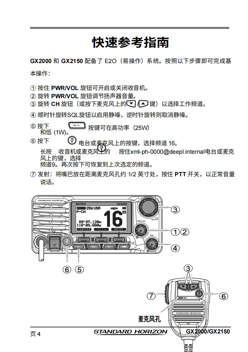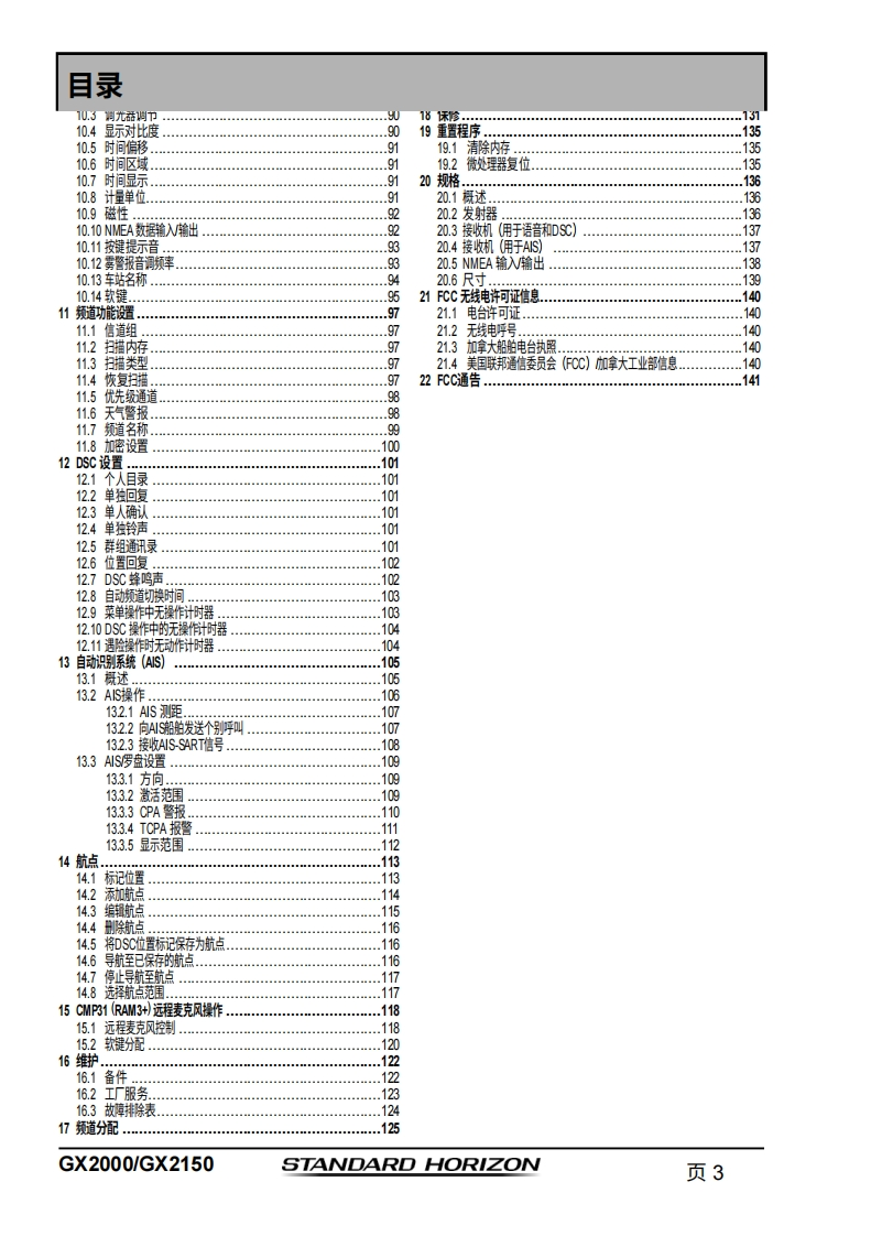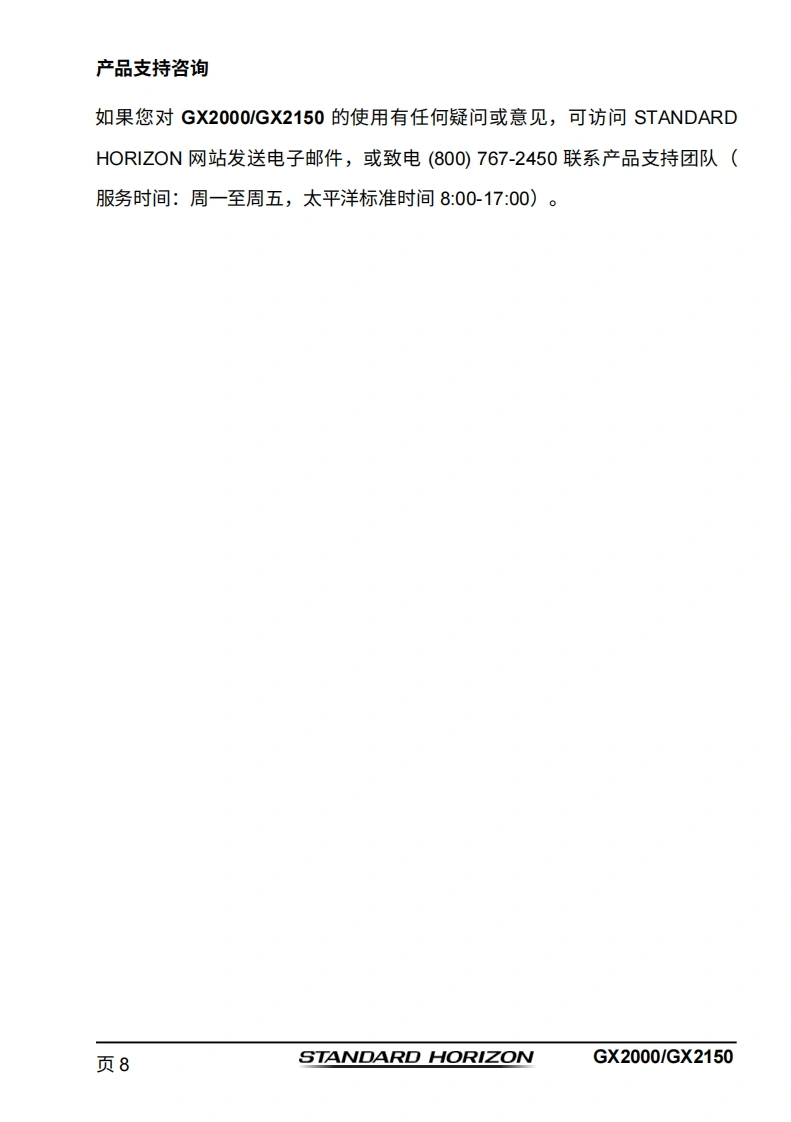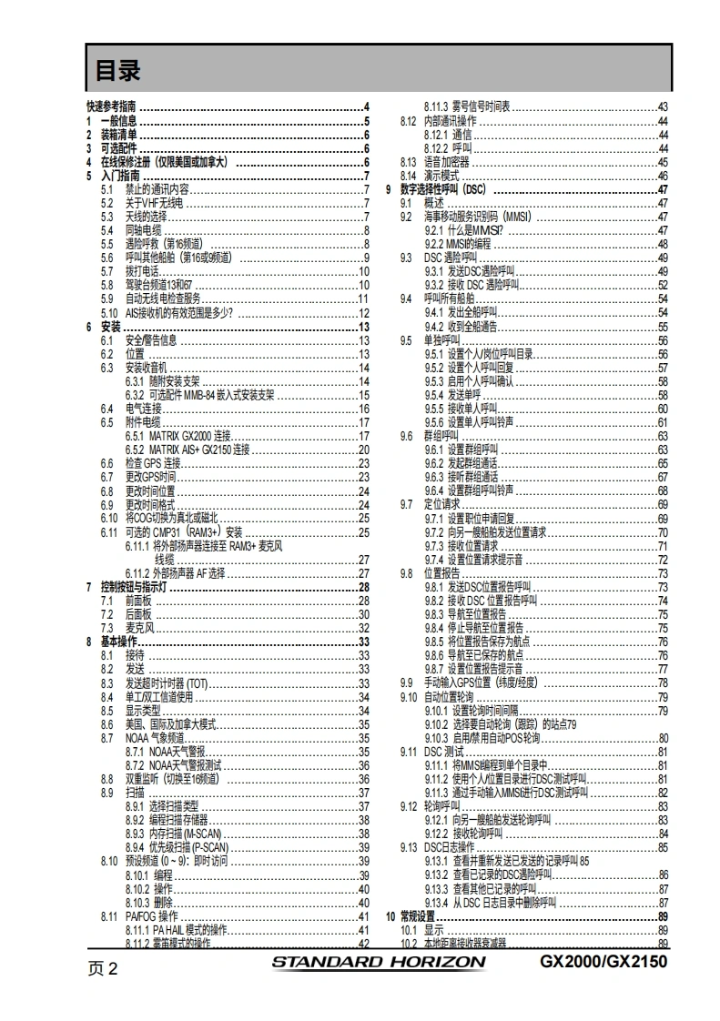 STANDARD HORIZONNothing takes to water like Standard HorizonMATRIX系列GX2000和GX215025瓦VHF/FM船用收发机用户手册GX2000:通过外接AIS接收器或应答器支持A1S●GX2150:集成双通道A1S(自动识别系统)接收器●GX2150:针对带1个NMEA端口的绘图仪,可选择4800或38400NMEA波特率GX2150:在A1S显示屏上可使用PA或雾号信号AIS显示屏上的真航向和磁航向选择※AIS目标显示包括MMSL、呼号、船名、方位角、距离、船速及航向※通过DSC※与A类或B类AIS船舶建立联系可编程的CPA或TCPA防撞警报※ITUD类DSC(内置独立70频道接收器)导航信息(纬度/经度、船速、航向)显示在屏幕上导航至DSC遇险位置通过罗盘页面输入、保存并导航至航点80dB商用级接收器向多达4艘独立船舶发送自动DSC位置查询请求配备E20(易于操作)菜单系统,电台设有用户可编程软键GPS罗盘、航点及GPS状态页面x防水等级达JIS7IPX-7标准(3.3英尺深度,持续30分钟)GX2150:30瓦功率放大器/扩音器,内置预设雾号及监听回放功能ClearVoice降噪麦克风,带频道选择器和16/9键●可连接第二台CMP31远程访问麦克风对讲机与RAM3+麦克风之间的对讲功能多功能用户可编程扫描、优先级扫描和双监听●超大旋钮式频道旋钮(按压进入),带背光显示屏和按键●语音加密器(可选)本地/远距离衰减器※GX2150需连接外部GPS或GX2000需连接外部GPS及AIS接收机或应答器816922
