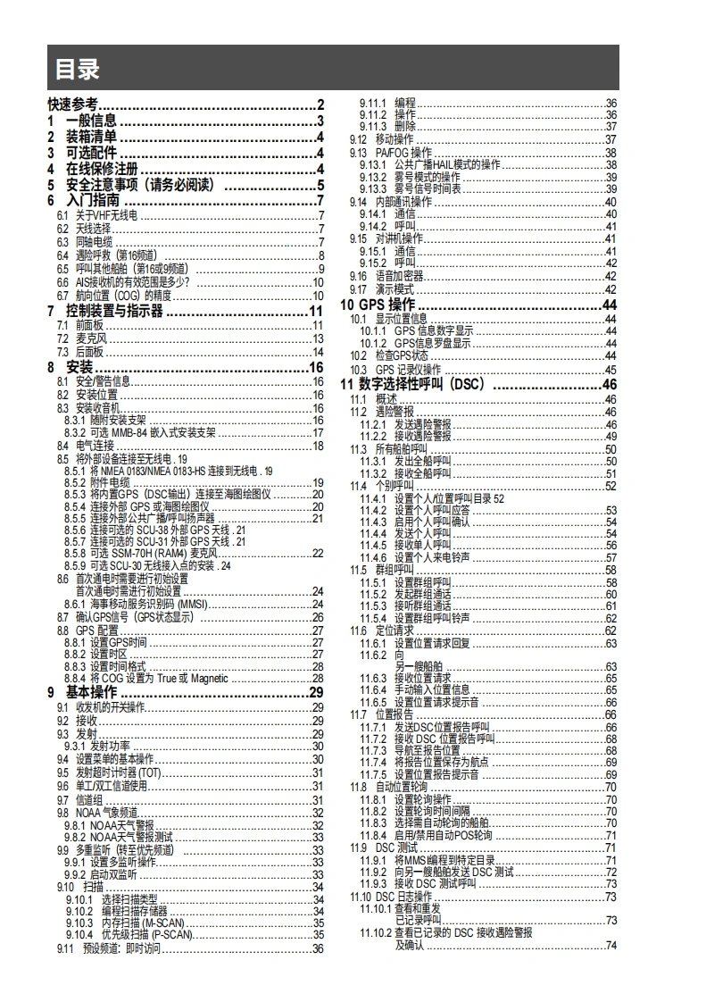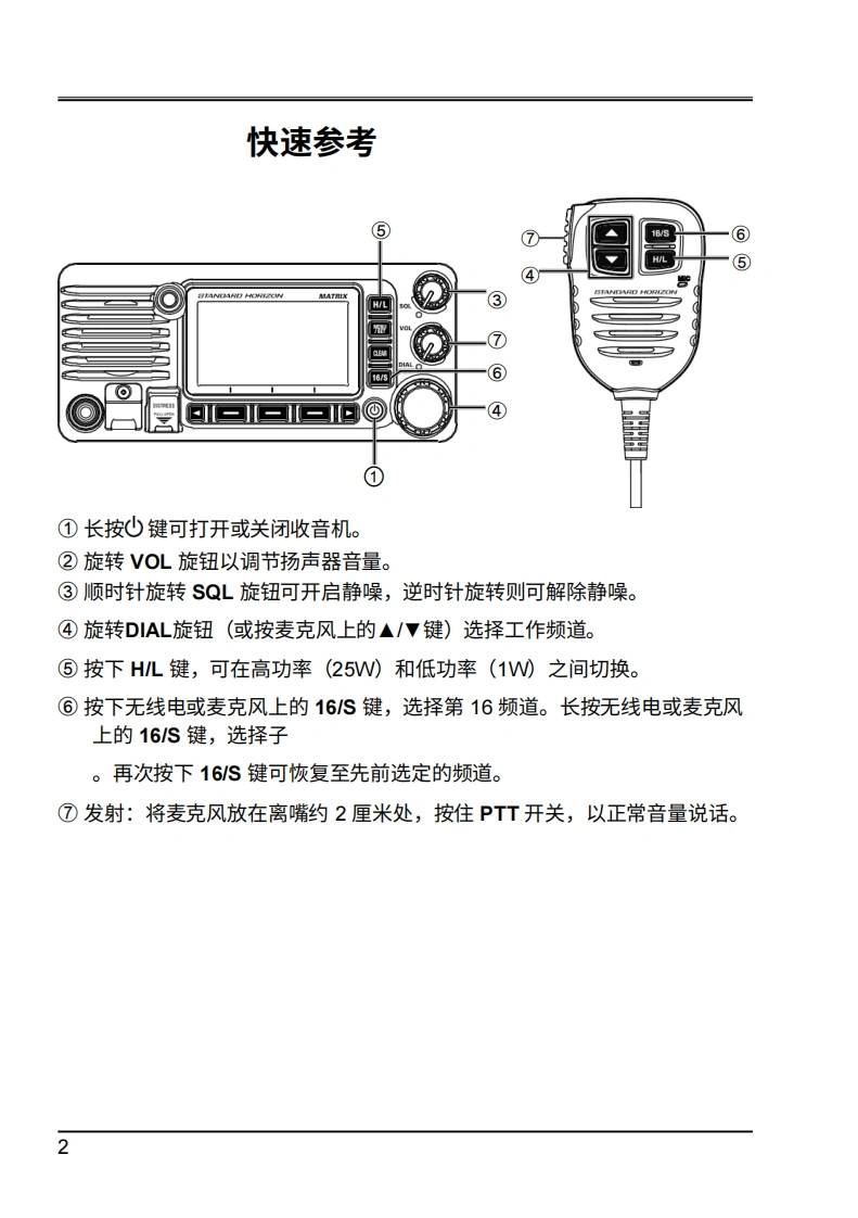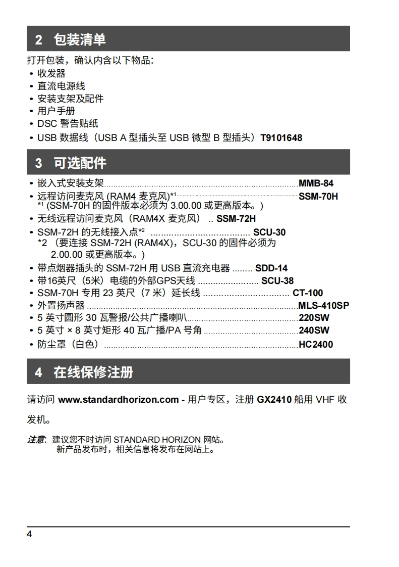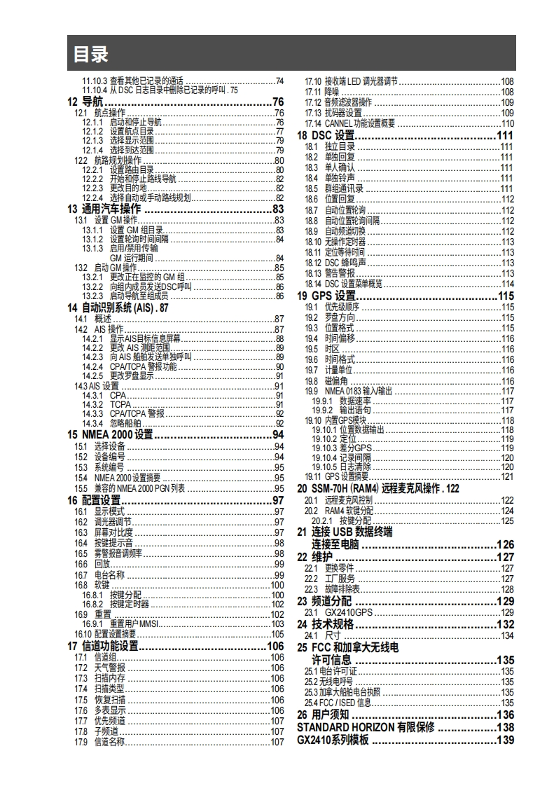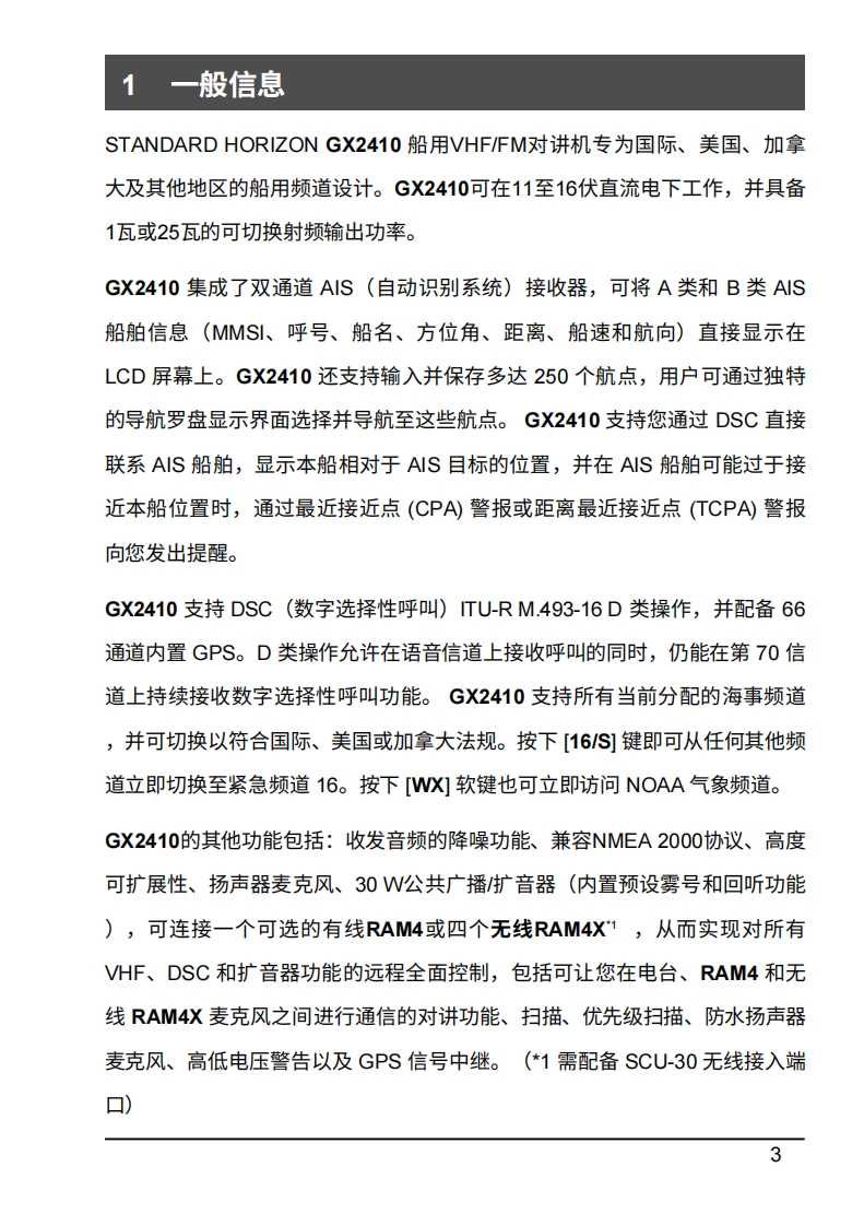 用户手册MATRIX NMEA2000 GPSGX2410GPS●国际ITU-RM.493-16D类DSC(数字选择性呼叫)●集成双通道A1S(自动识别系统)接收器●AIS/AIS SART目标显示:MMSL、呼号、船名、方位角(BRG)、距离(DST、船速(SOG)和航向(COG)●兼容NMEA2000和NMEA0183●内置66通道GPS接收器●通过DSC联系A类或B类AIS船舶●可编程CPA或TCPA防撞警报●防水等级1PX8(1.5米深度,持续30分钟)●80分贝商用级接收器●DSC位置请求和报告功能●使用DSC群组定位呼叫的GM(群组监视器)0显示屏上显示导航信息(纬度经度、船速和航向)·落水人员(MOB)操作0多功能用户可编程扫描、优先级扫描及双/三频监听●集成32码语音加密器和4码语音加密器●30瓦扩音器/高音喇叭,带预编程雾号和回听功能●收发音频均支持降噪●第二站远程麦克风*●对讲机与第二站远程麦克风*之间的对讲功能·(需选配SSM-70H(RAM4)或SSM-72H(RAM4X))CRM USA M四DISTRE哥63回▣▣回STANDARD HORIZONNothing takes to water like Standard Horizon