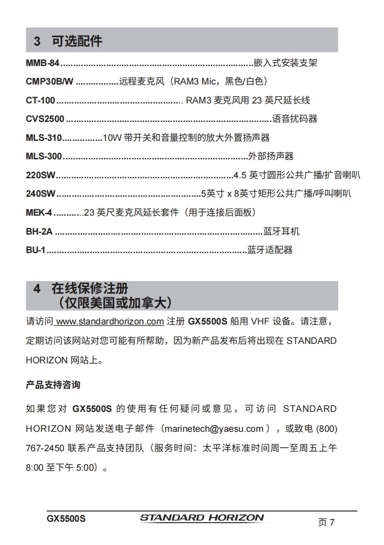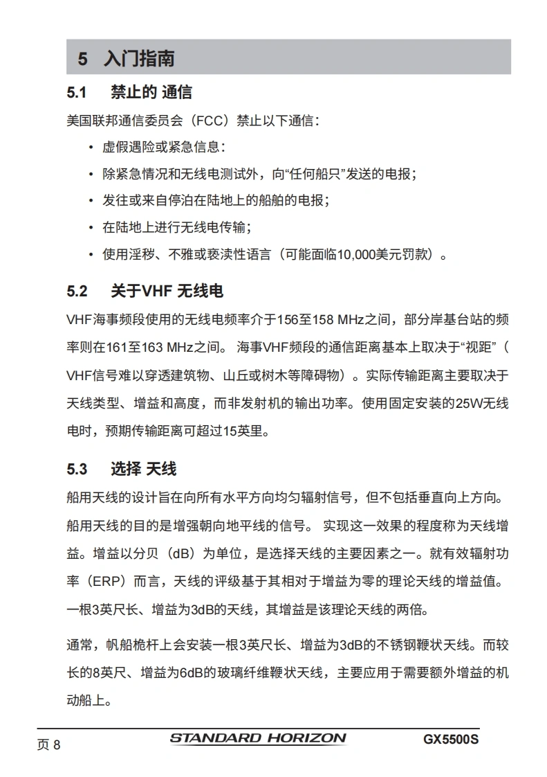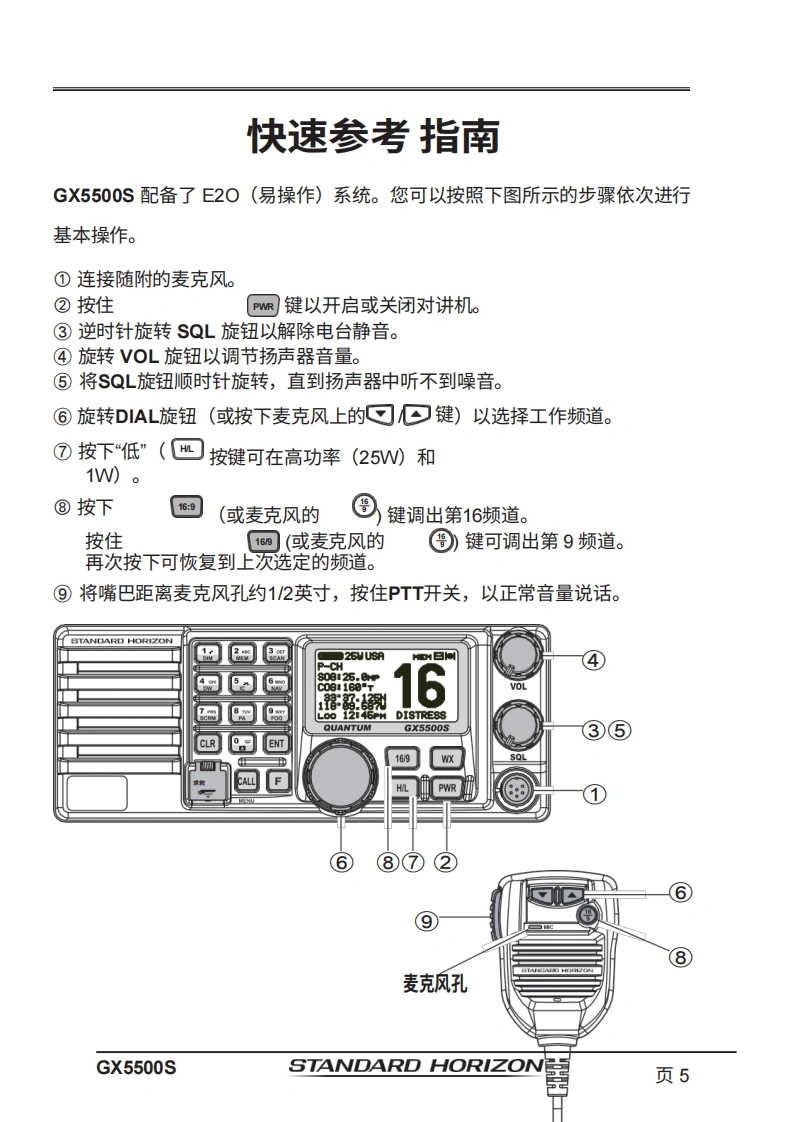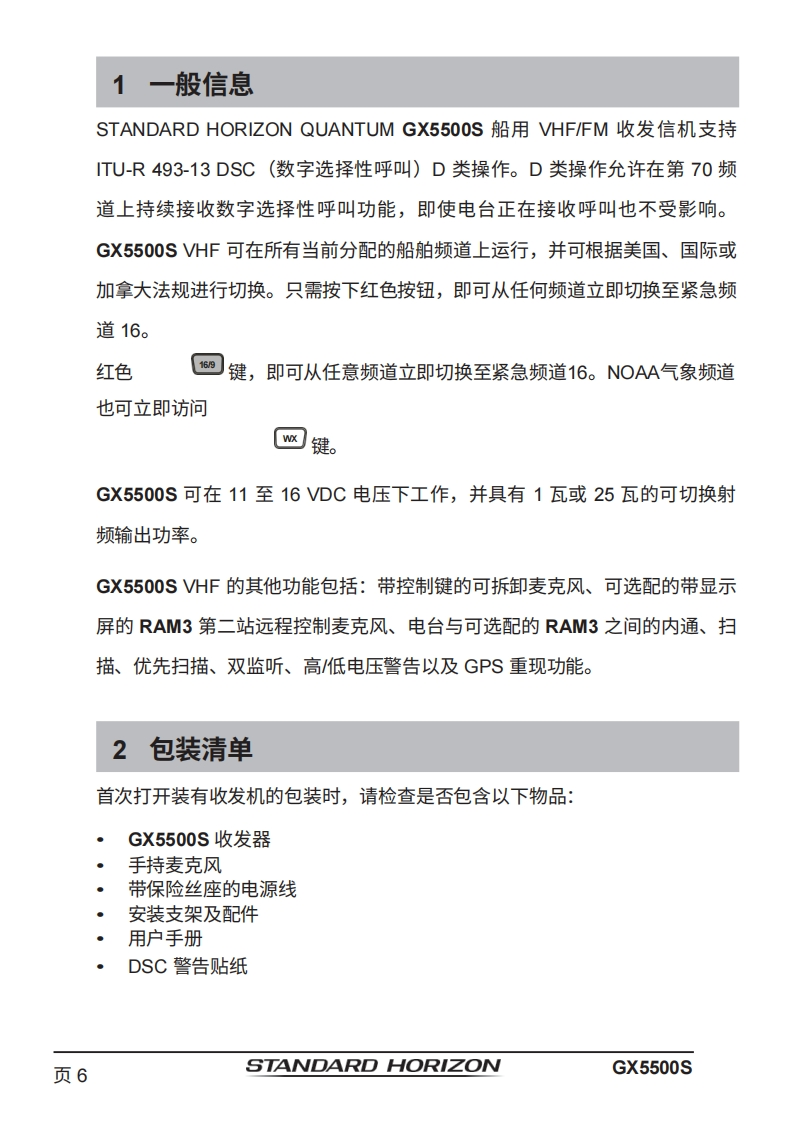 STANDARD HORIZONNothing takes to water like Standard HorizonQUANTUM GX5500S25瓦VHF/FM船用收发机用户手册●商用级1TU-RM.493-13D类DSC收发机●卓越的接收性能(80dB抑制)●30W扩音器,配备监听功能及4种雾笛、铃声和哨声●2.2英寸内置扬声器,提供清晰的语音输出●2.58×1.28英寸点阵显示屏●带字母数字键盘,可直接输入频道号或选择常用功能●NAV模式显示纬度/经度、位置时间、SOG和COG*●超大旋钮式选择器、音量及静噪控制0可编程扫描、可选优先级扫描和双监听●一键访问第16和第9频道。高音和低音音调控制0GPS信息的NMEA输入及向其他NMEA兼容设备的输出●可选语音加密功能●即插即用前置或后置面板麦克风(可选配MEK-4延长线)●可连接两个RAM3(CMP30)远程访问麦克风●可选蓝牙通信单元*连接至GPS接收器时16ENT