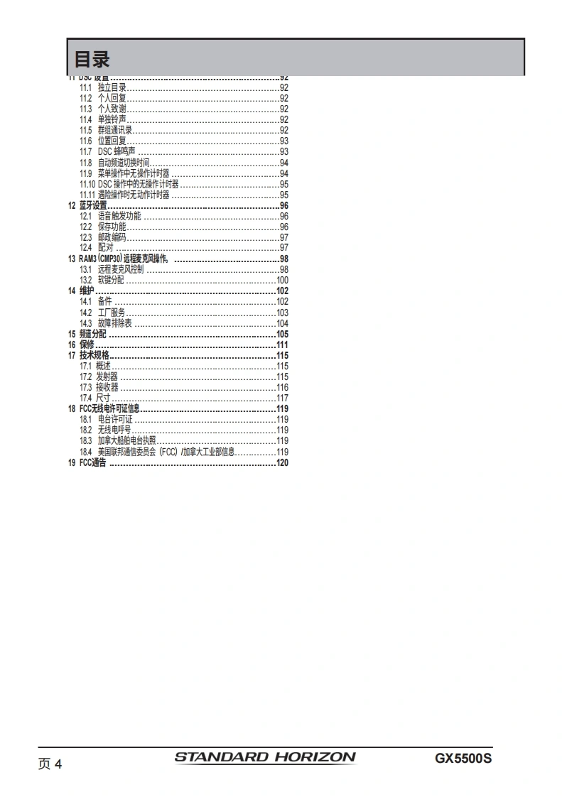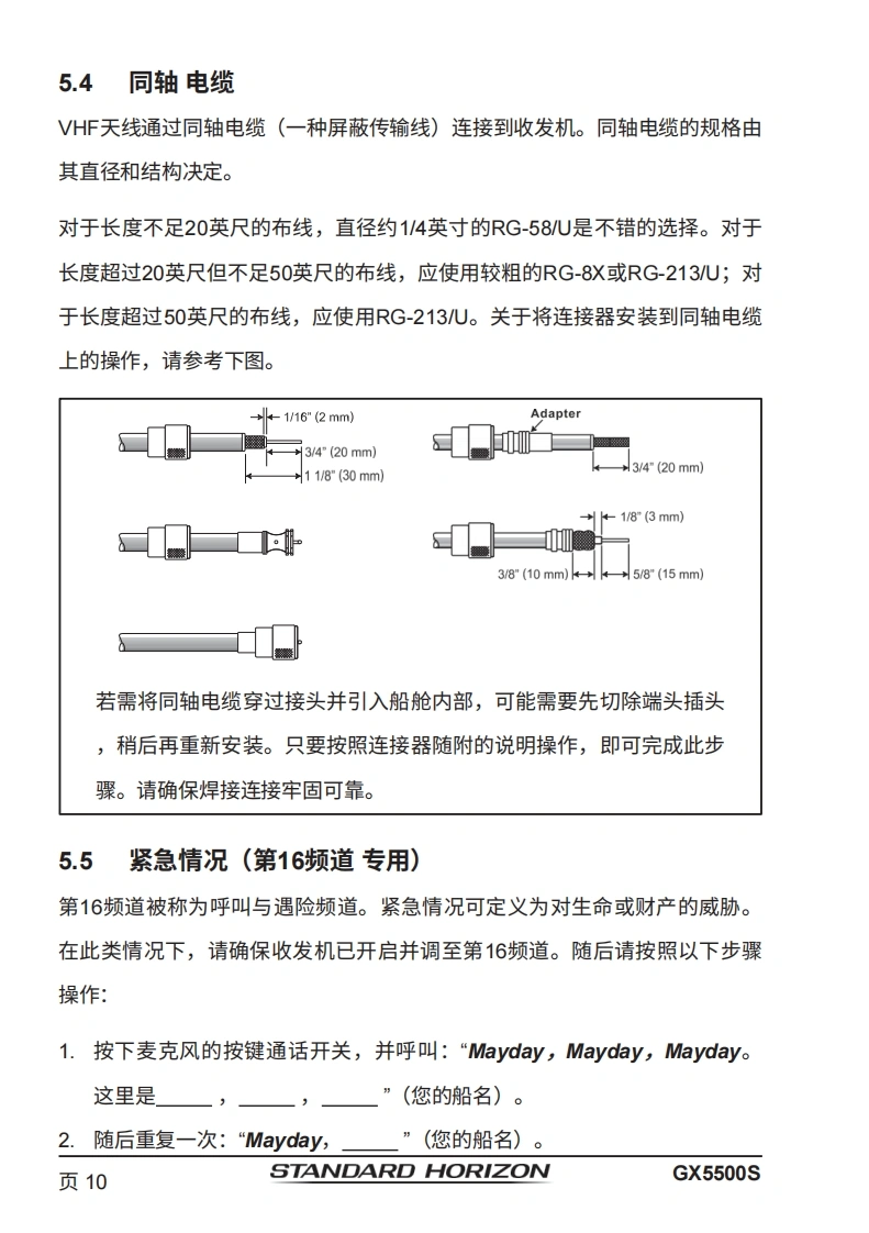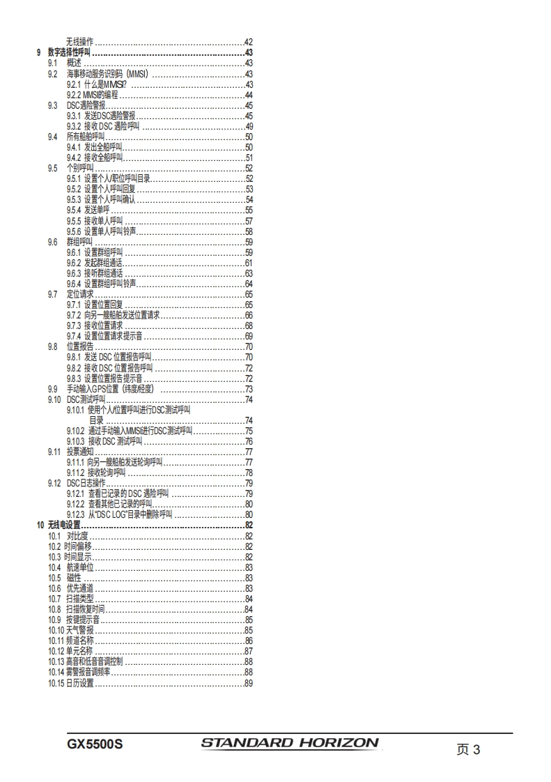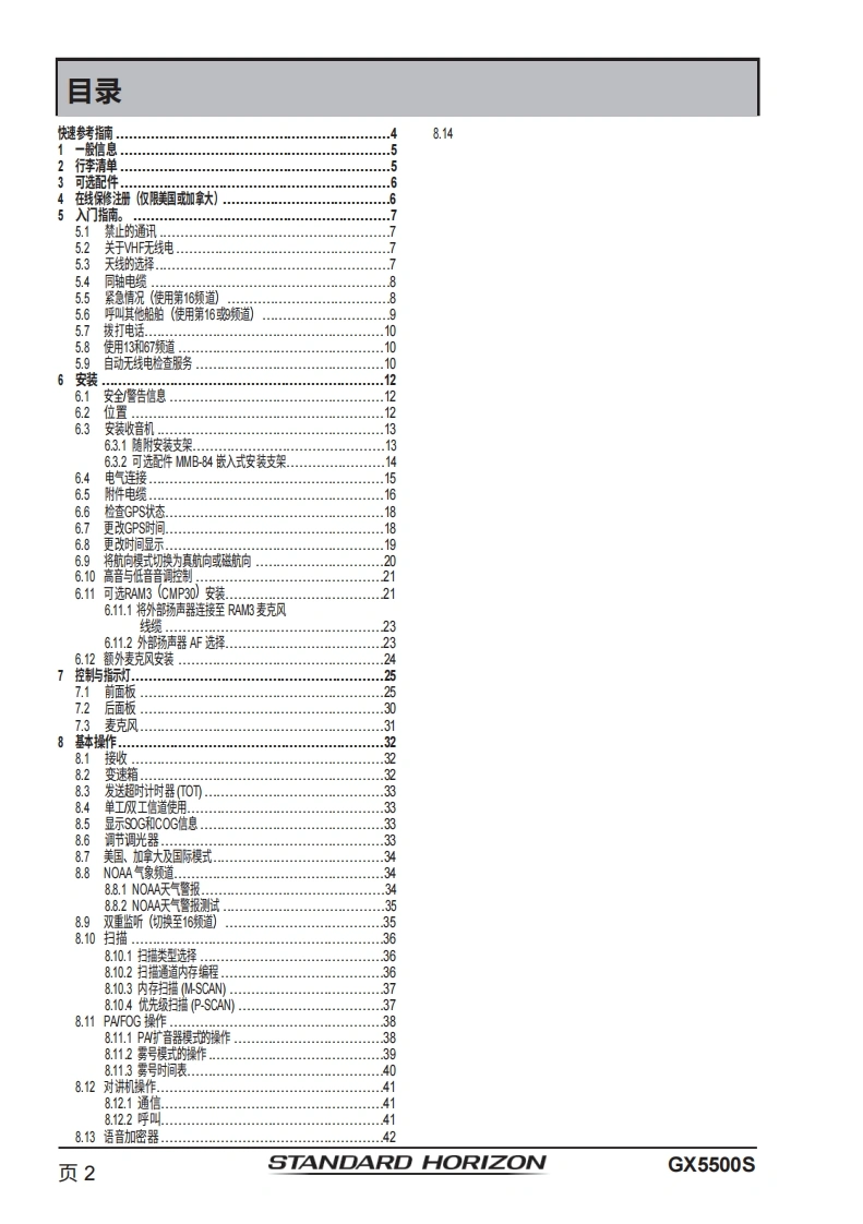 STANDARD HORIZONNothing takes to water like Standard HorizonQUANTUM GX5500S25瓦VHF/FM船用收发机用户手册●商用级1TU-RM.493-13D类DSC收发机●卓越的接收性能(80dB抑制)●30W扩音器,配备监听功能及4种雾笛、铃声和哨声●2.2英寸内置扬声器,提供清晰的语音输出●2.58×1.28英寸点阵显示屏●带字母数字键盘,可直接输入频道号或选择常用功能●NAV模式显示纬度/经度、位置时间、SOG和COG*●超大旋钮式选择器、音量及静噪控制0可编程扫描、可选优先级扫描和双监听●一键访问第16和第9频道。高音和低音音调控制0GPS信息的NMEA输入及向其他NMEA兼容设备的输出●可选语音加密功能●即插即用前置或后置面板麦克风(可选配MEK-4延长线)●可连接两个RAM3(CMP30)远程访问麦克风●可选蓝牙通信单元*连接至GPS接收器时16ENT