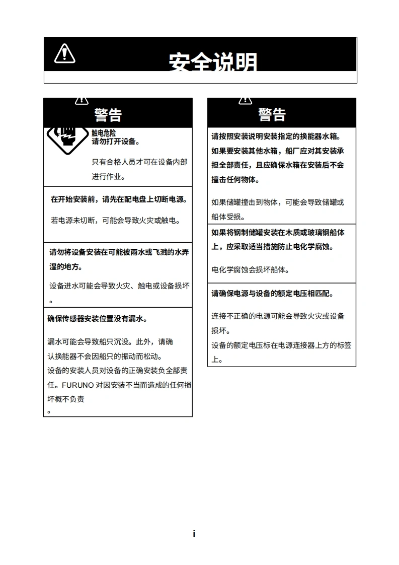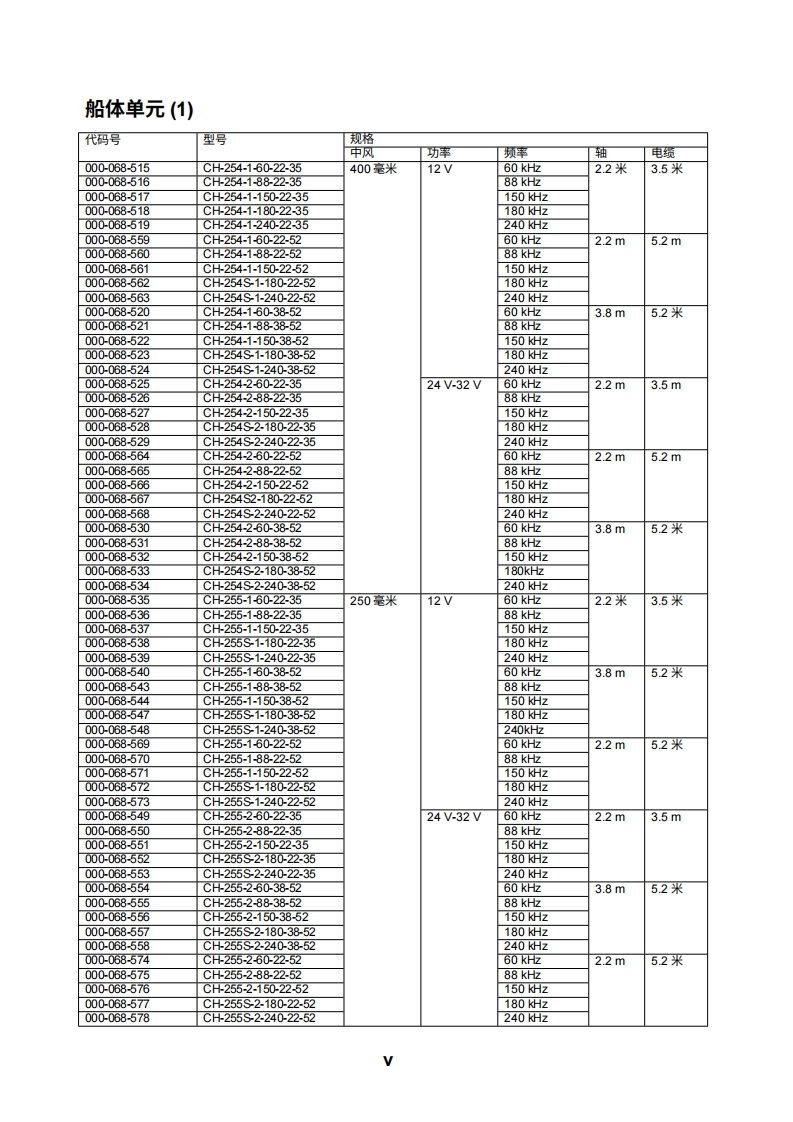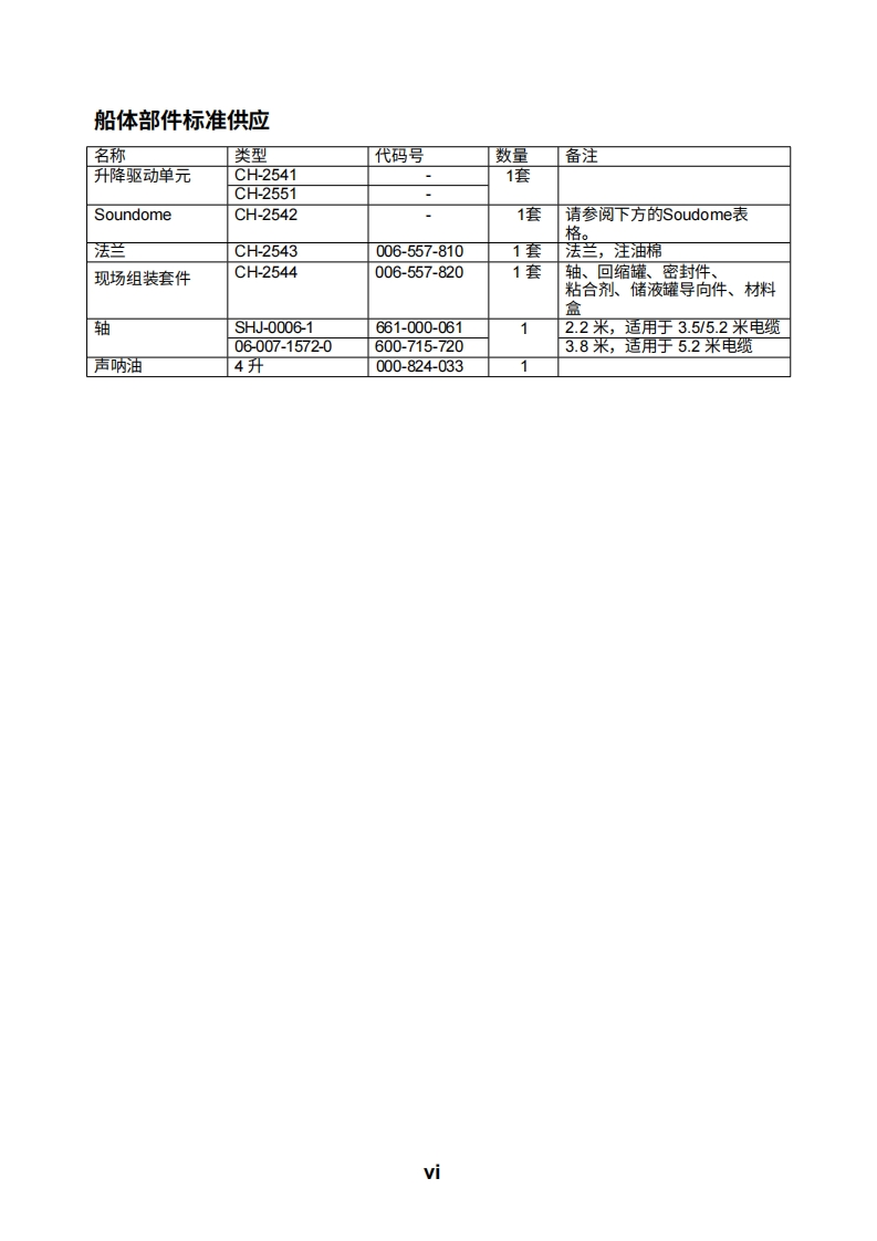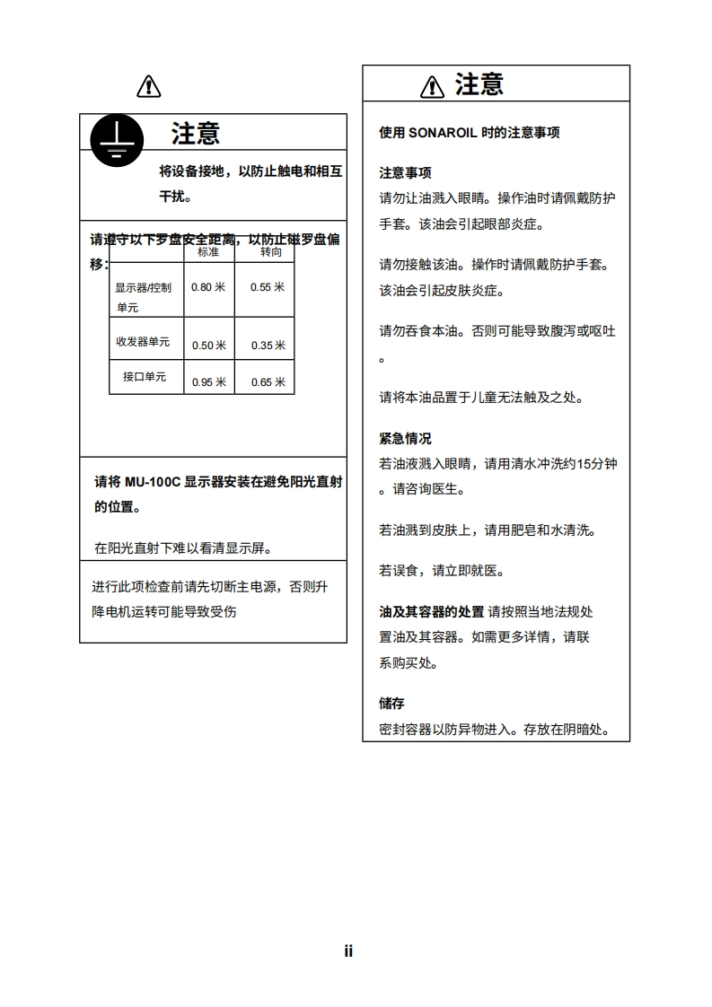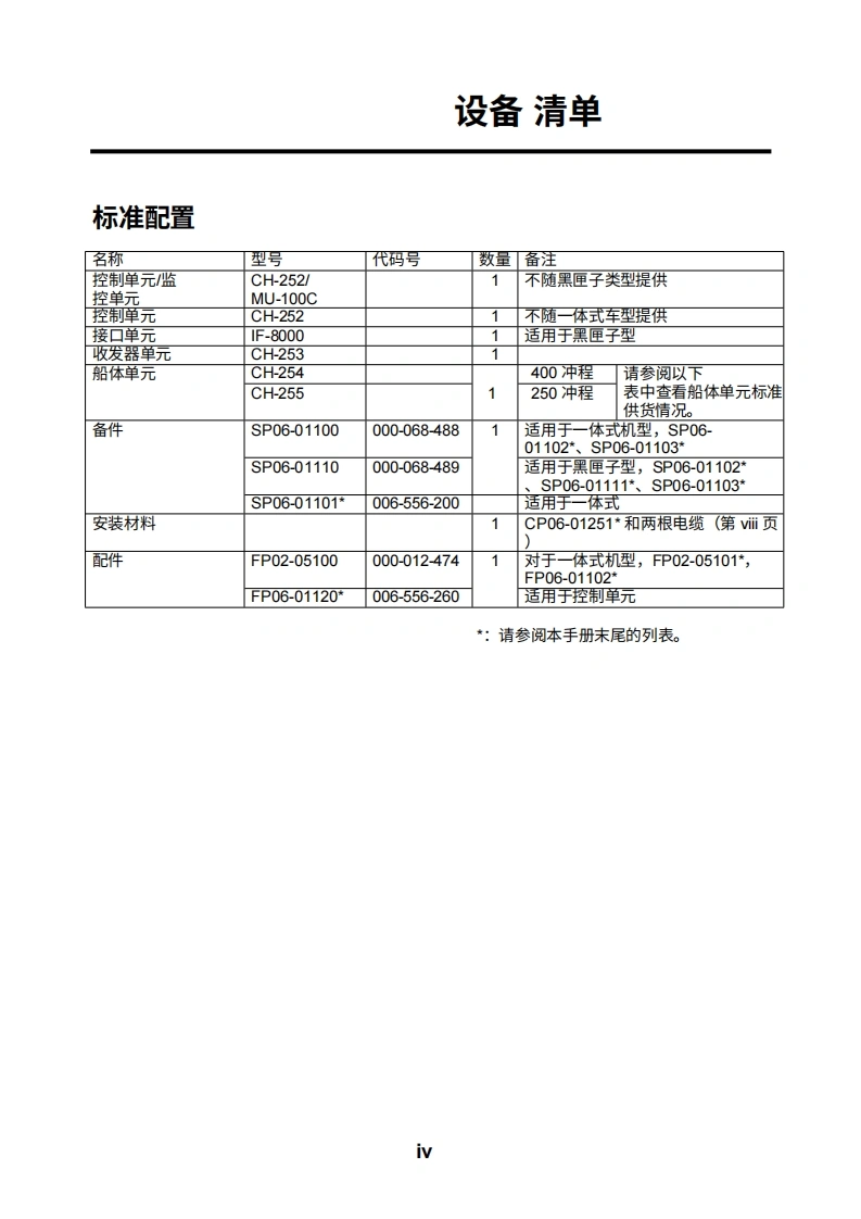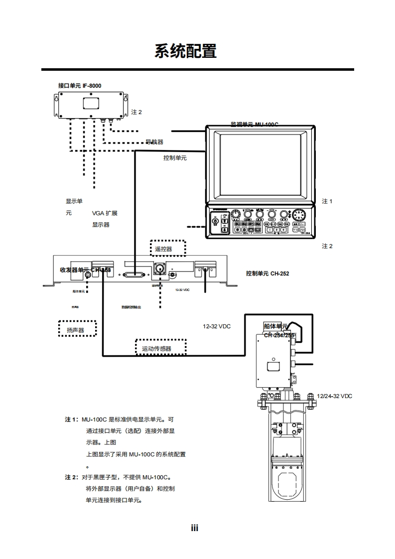 返回安装手册SEARCHLIGHT SONAR CH-250安全须知调整..313.1常规检查.31系统配置..iii3.2TX频率检查.32设备清单3.3航向调整声标设置1.安装1343.4运动传感器调整1.1监视单元控制单元。.1..373.5系统备份....381.2收发器单元。.61.3船体单元93.6接口单元设置…401.4接口单元.21输入√输出说明411.5运动传感器MS-100(可选)….222.接线.….23装箱单.A-12.1设备间接线】.23示意图,D-1互连图2.2收发器单元。26S-12.3船体单元.292.4接▣单元.303..