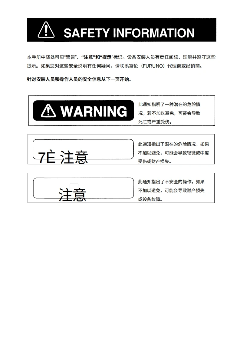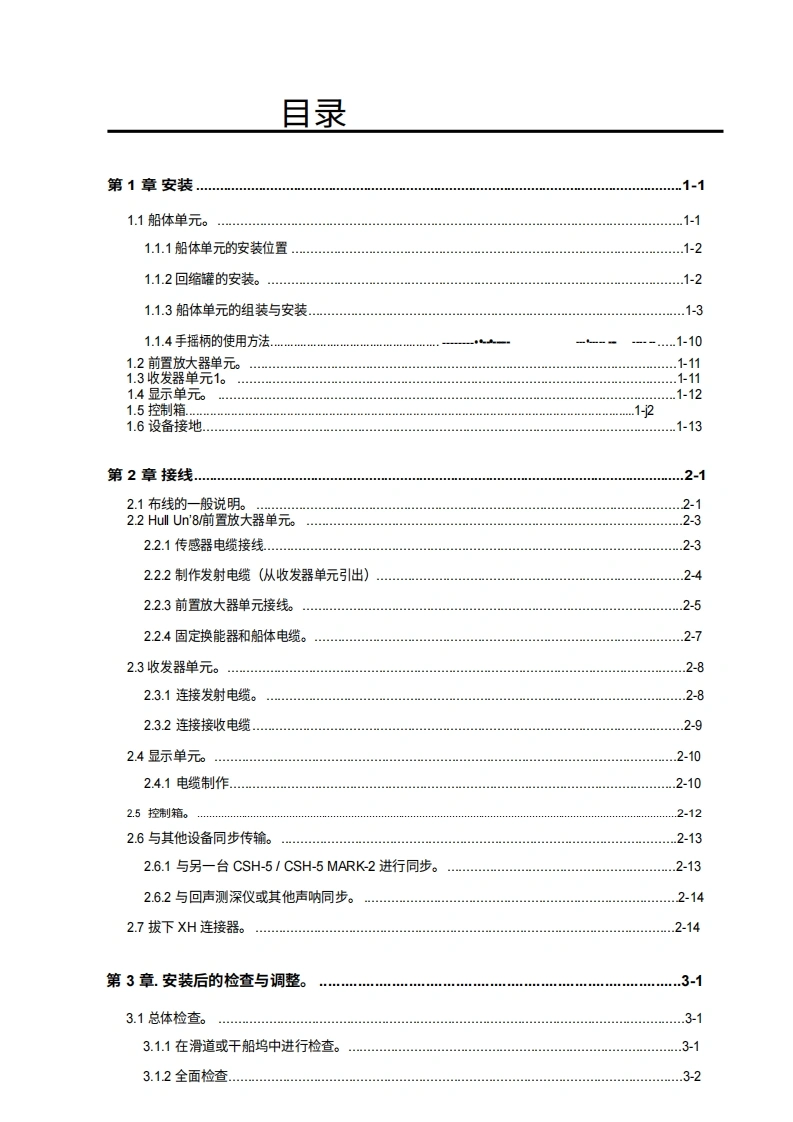 古野FURUNO-csh5mk2-安装说明手册-20260409中文版找手册网3天前发布关注私信20.76MB135页027古野FURUNO-csh5mk2-安装说明手册-20260409中文版此内容为付费资源,请付费后查看¥19¥21黄金会员免费钻石会员免费登录购买付费资源 第1页 / 共135页 第2页 / 共135页 第3页 / 共135页 第4页 / 共135页 第5页 / 共135页 第6页 / 共135页 第7页 / 共135页 第8页 / 共135页 第9页 / 共135页 第10页 / 共135页 试读已结束,还剩125页,您可下载完整版后进行离线阅读 THE ENDCobra/Furuno 文本预览 W%E[TEGNIβSTitLlT/9 HeBOlt彩色扫描声纳型号CSH-5 MARK-2第1章描述了使用1000毫米长水箱的安装方法。如需安装1800毫米或3500毫米长的水箱,请参阅附录。 查看更多 收起部分 喜欢就支持一下吧收藏