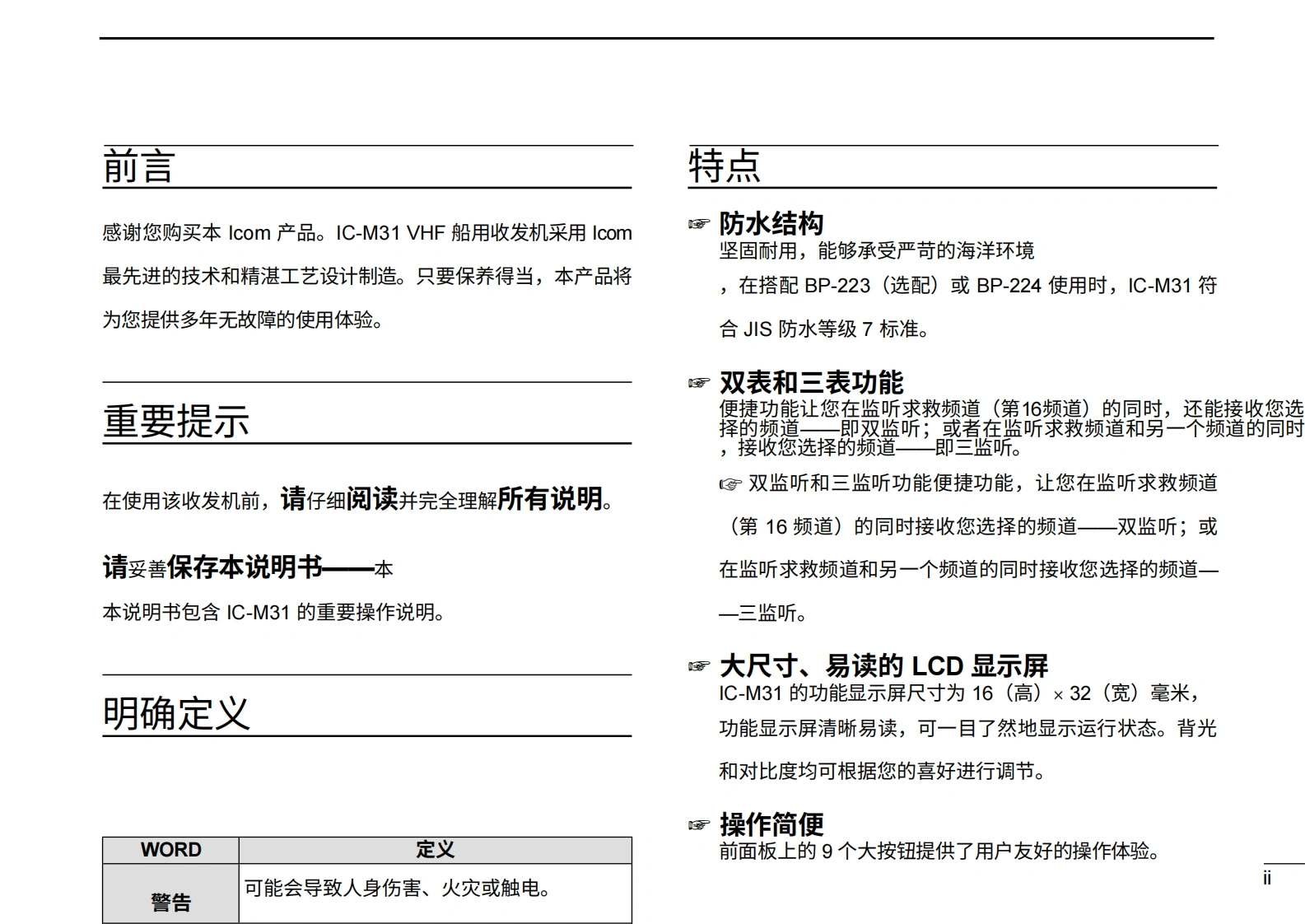 艾可慕IC-M31-Instruction-manual操作说明书手册20260331中文版找手册网3天前发布关注私信3.16MB65页029艾可慕IC-M31-Instruction-manual操作说明书手册20260331中文版此内容为付费资源,请付费后查看¥19¥21黄金会员免费钻石会员免费登录购买付费资源 第1页 / 共65页 第2页 / 共65页 第3页 / 共65页 第4页 / 共65页 第5页 / 共65页 第6页 / 共65页 第7页 / 共65页 第8页 / 共65页 第9页 / 共65页 第10页 / 共65页 试读已结束,还剩55页,您可下载完整版后进行离线阅读 THE END艾可慕 文本预览 COM使用说明书VHF船用收发机iM31COM6DIAL+MONISQLIcom Inc. 查看更多 收起部分 喜欢就支持一下吧收藏