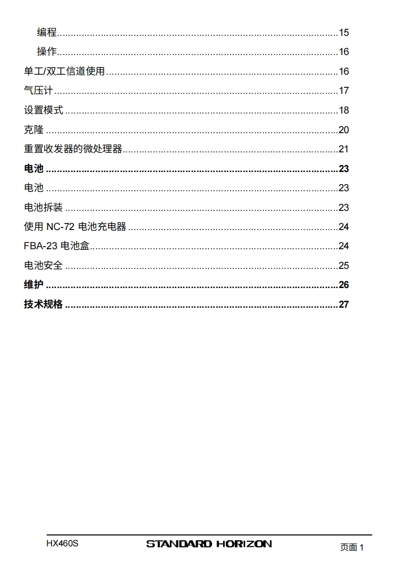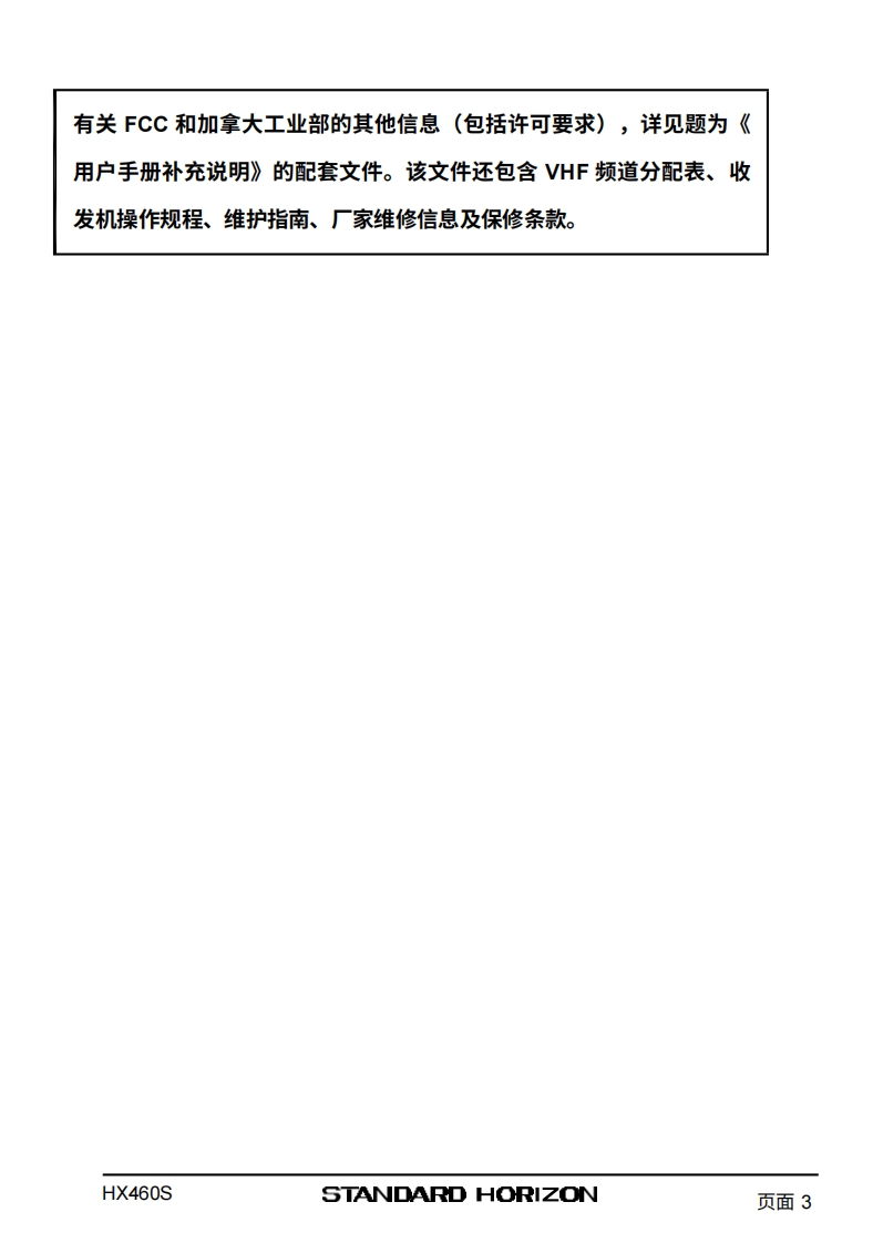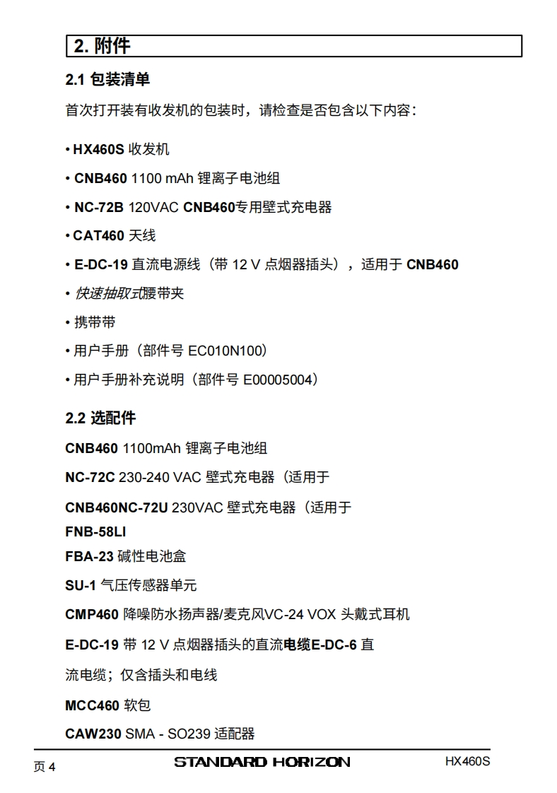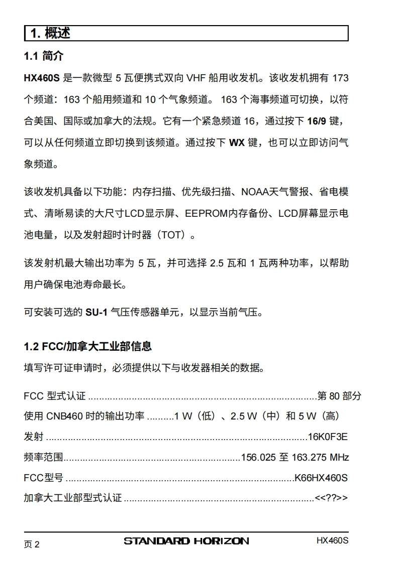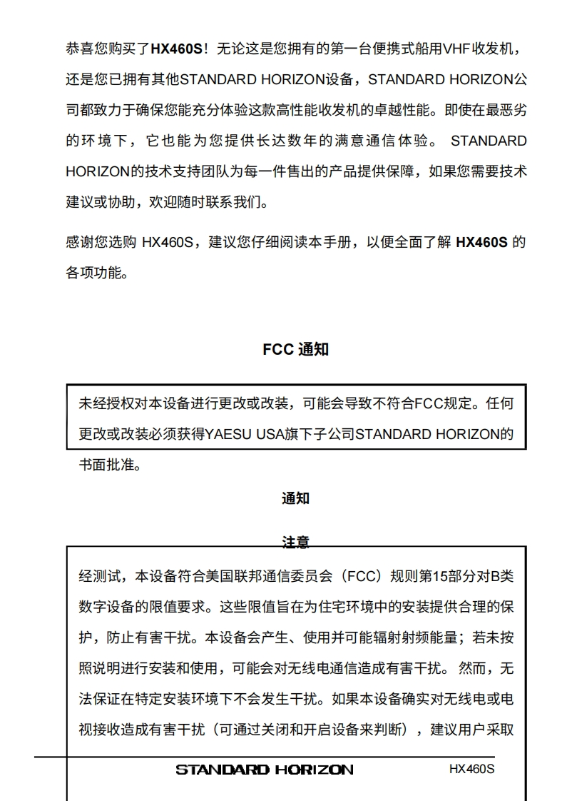 SSTANDARD HORIZONHX460SVHF/FM船用手持对讲机用户手册VERTEX STANDARD CO.,LTD.HX4665日本东京都目黑区中目黑4-8-8,邮编153-8644YAESU U.S.A美国加利福尼亚州塞里托斯市爱德华兹路17210号,邮编90703YAESU U.S.A.国际事业部美国佛罗里达州迈阿密市西北52街8350号201室,邮编33166YAESU EUROPE B.V.P.O.Box 75525,1118 ZN Schiphol.The NetherlandsYAESU UK LTD.英国汉普郡温彻斯特温纳尔克洛斯太阳谷商业园12单元,邮编:S0230LBYAESU GERMANY GmbH