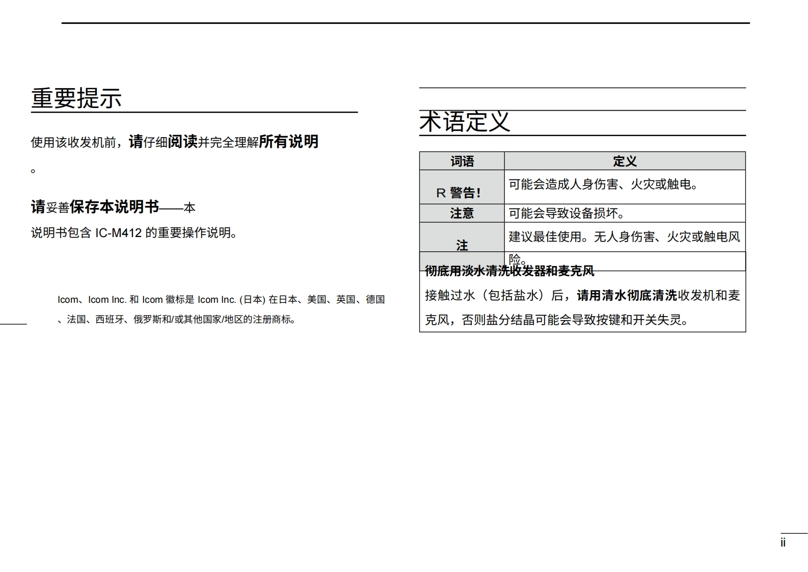 艾可慕IC-M423_IC-M412_Manual操作说明书手册20260331中文版找手册网3天前发布关注私信5.51MB124页023艾可慕IC-M423_IC-M412_Manual操作说明书手册20260331中文版此内容为付费资源,请付费后查看¥19¥21黄金会员免费钻石会员免费登录购买付费资源 第1页 / 共124页 第2页 / 共124页 第3页 / 共124页 第4页 / 共124页 第5页 / 共124页 第6页 / 共124页 第7页 / 共124页 第8页 / 共124页 第9页 / 共124页 第10页 / 共124页 试读已结束,还剩114页,您可下载完整版后进行离线阅读 THE END艾可慕 文本预览 COM使用说明书VHF船用收发机ivΛ412VHF MARINEIC-M412BUSYCRLL INGUSATAG)ICOMDUALMMSI16CH/WXMENUTAGDISTRESSSCANCLRENTIcom Inc. 查看更多 收起部分 喜欢就支持一下吧收藏