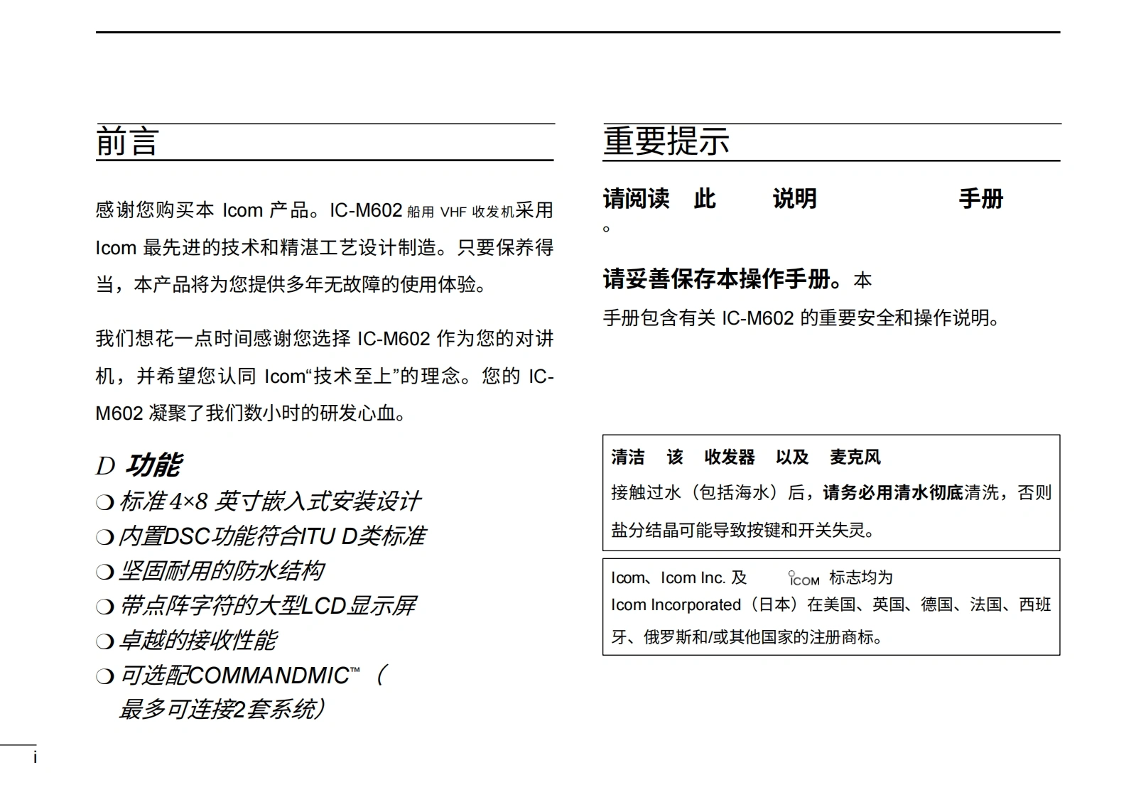 艾可慕IC-M602_Manual操作说明书手册20260331中文版找手册网3天前发布关注私信4.30MB141页036艾可慕IC-M602_Manual操作说明书手册20260331中文版此内容为付费资源,请付费后查看¥19¥21黄金会员免费钻石会员免费登录购买付费资源 第1页 / 共141页 第2页 / 共141页 第3页 / 共141页 第4页 / 共141页 第5页 / 共141页 第6页 / 共141页 第7页 / 共141页 第8页 / 共141页 第9页 / 共141页 第10页 / 共141页 试读已结束,还剩131页,您可下载完整版后进行离线阅读 THE END艾可慕 文本预览 COM使用说明书VHF船用收发机ivM6○2固圈品2516COM回本设备符合FCC规则第15部分的规定。其使用须遵守以下两个条件:(1)本设备不得造成有害干扰;(②)本设备必须接受任何接收到的干扰,包括可能导致意外运行的干扰。Icom Inc. 查看更多 收起部分 喜欢就支持一下吧收藏