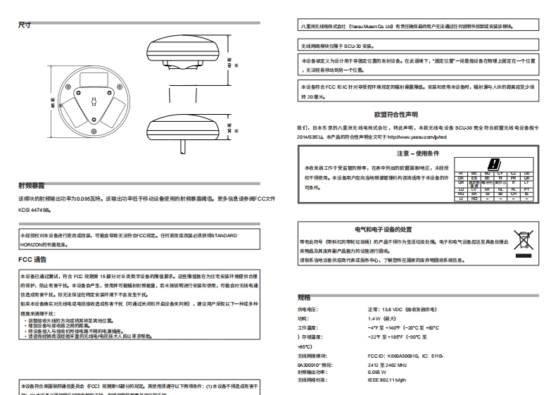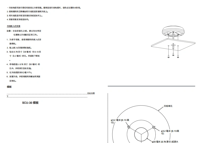 STANDARD HORIZON过天线底座。Mothing takes to water Nke Standard Horizon注意事项:·若需将天线电援用过长杆外部布战,请将电境穿过凹槽SCU-30如右图虚线所示。无线接入点(请使用长钳剪下空白面板。》sC3的是一款无技接入点,随附5英尺长的连接线,可描入莱容的Standard Horizon VHF电台的RAM愤口,从而与SSMT1H无线远程接入麦克风RAM4W建立无线连核。有关莱容性信息,请参阅STANDARDO风2ON产品日录防问其网姑。用户手册ScU30的安装详情包含在莱容的因定式电台用户于所中,或可从haim0m下支室注意事贝情方必阅床女为安全使用本产品,请务必阅读莱容因定式F无试电桶作于历中的安全注意事项。随配件天战单元5英尺电蜀天#店座(情座,部件号:RA8054200》螺丝38不锈锡,部件号:U2030020》安装sCU3如设计用于安装在底座上,装在件邮杆上藏入式安装。请选择一个面离富达域其他发射天线3英尺以外的位置皮装天线单元。确保天单元附近设有大生障得物或因定装置。如果您不确定皮装位置,请先时安装天线以验证其能否正常工伟。如果安装在富达附近,请打开雷达并检查以验证其能香正常工作。罗盘安全面离该天战装置应面南磁罗盘至少02米(0的英尺)。庄座安装天越天线店座上使用的螺坟(1英寸,14TP0是行业标准,广泛座用于各类市售皮装支架域过长杆。由于安装支果钓制适工艺原因。天转可能无法完全拧紧至所有螺垃位置。但这无需担心,因为只需将天线拧紧至无法蝶旋转为止天即可。1.将天线电援穿过装支果成证长杆时,请务还将电援