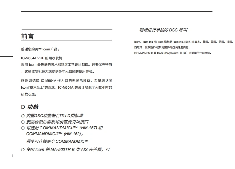 艾可慕IC-M604A_Manual操作说明书手册20260331中文版找手册网3天前发布关注私信3.79MB133页049艾可慕IC-M604A_Manual操作说明书手册20260331中文版此内容为付费资源,请付费后查看¥19¥21黄金会员免费钻石会员免费登录购买付费资源 第1页 / 共133页 第2页 / 共133页 第3页 / 共133页 第4页 / 共133页 第5页 / 共133页 第6页 / 共133页 第7页 / 共133页 第8页 / 共133页 第9页 / 共133页 第10页 / 共133页 试读已结束,还剩123页,您可下载完整版后进行离线阅读 THE END艾可慕 文本预览 COM使用说明书VHF船用收发机iM604A固旦母16旦旦Icom Inc. 查看更多 收起部分 喜欢就支持一下吧收藏