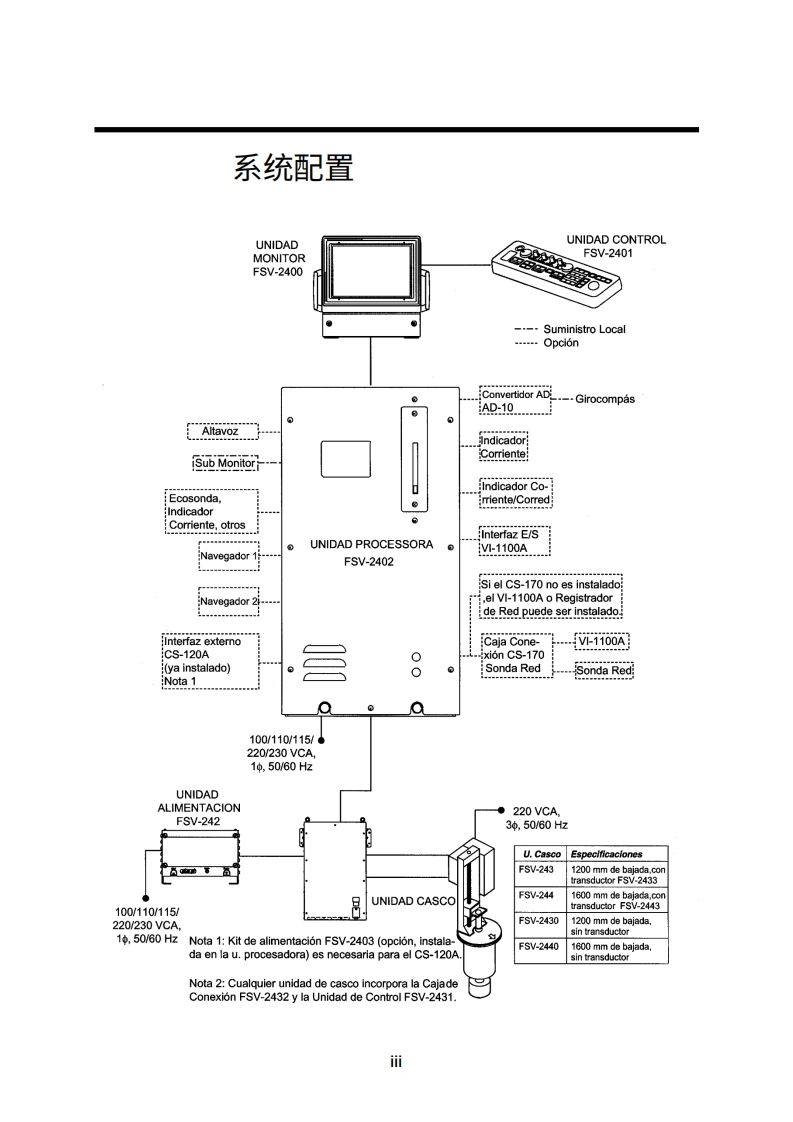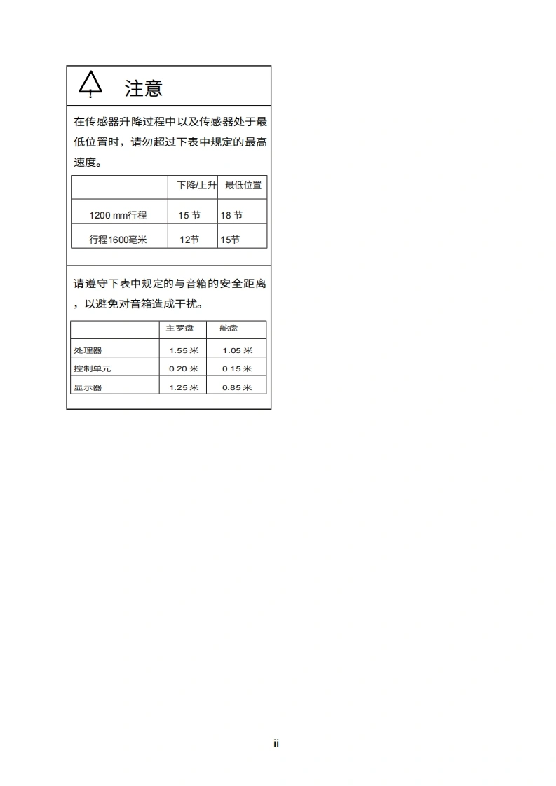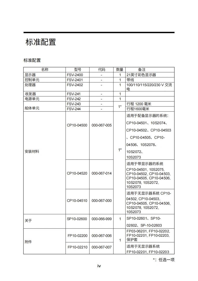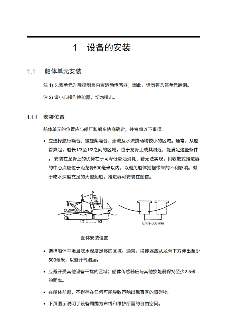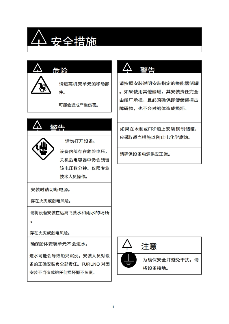 FURUNOFSV24彩色声呐探测安装手安全措施。系统配置..ii供货范围.......1.设备安装..1-11.1船体单元安装.…1-11.2演示单元安装.1-81.3收发器安装.1-141.4电源安装,.1-141.5设备接地......1-151.6扩展模块的安装(何选)...1-152.布线..2-12.1连接工具..2-12.2连接器位置2-22.3显示器单元2-42.4处理器单元,2-82.5收发器单元.2-142.6电源单元2-172.7耳机单元……..2-173.调整与检查.….3-13.1船体单元检查3-13.2船首调整.…3.3船体标记设置3-4.3-63.4“SYSTEM"菜单的其他选项3-83.5处理器中CONE板的设置.3-123.6DIP开关设置..a...3-133.7 TX/RX3独立测试….3-154.CS-120A外部接口连接...4-1测试清单..AP.1发货清单..A-1尺寸图D-1