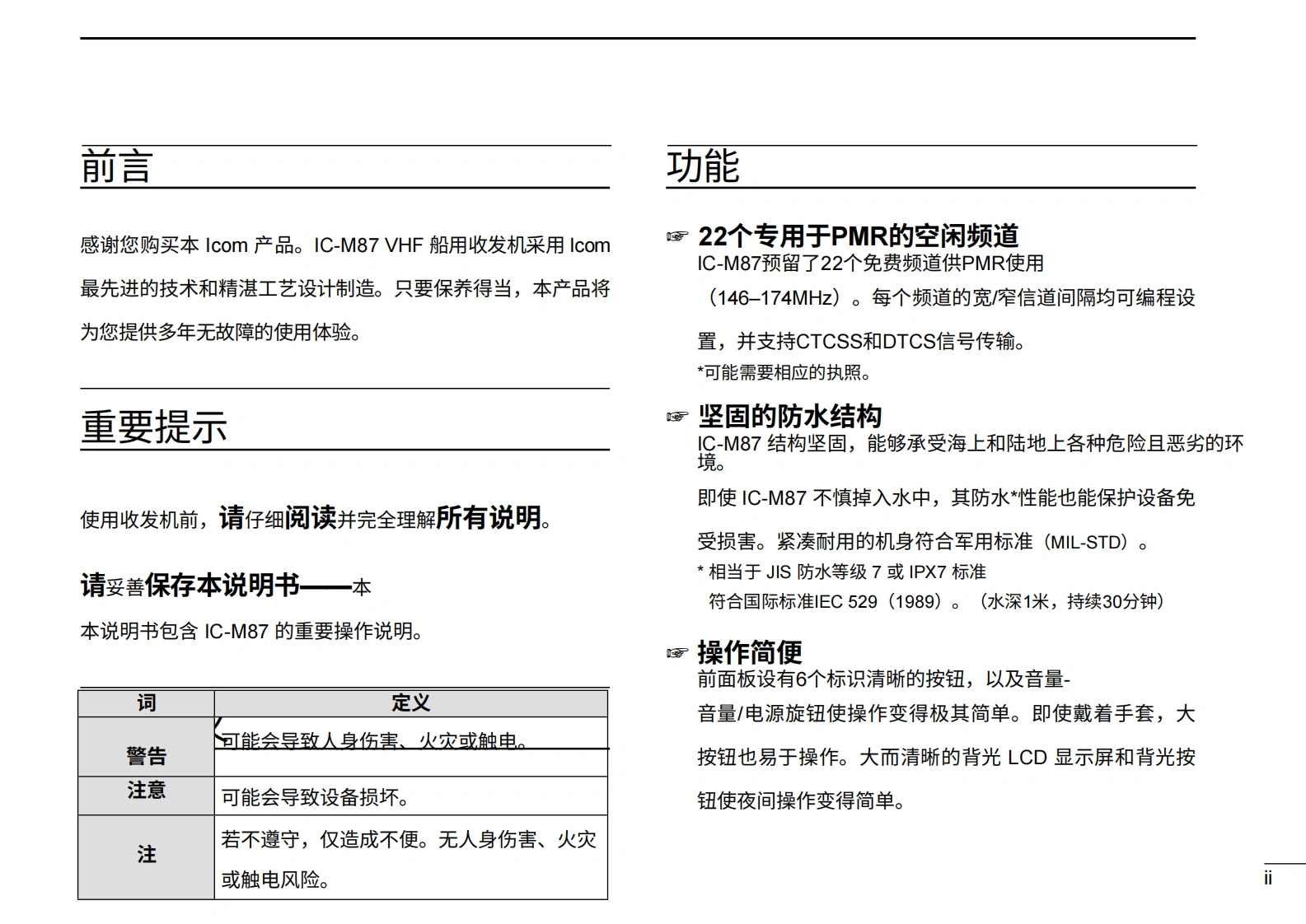 艾可慕IC-M87_(Manual操作说明书手册)20260331中文版找手册网2天前发布关注私信3.69MB68页038艾可慕IC-M87_(Manual操作说明书手册)20260331中文版此内容为付费资源,请付费后查看¥19¥21黄金会员免费钻石会员免费登录购买付费资源 第1页 / 共68页 第2页 / 共68页 第3页 / 共68页 第4页 / 共68页 第5页 / 共68页 第6页 / 共68页 第7页 / 共68页 第8页 / 共68页 第9页 / 共68页 第10页 / 共68页 试读已结束,还剩58页,您可下载完整版后进行离线阅读 THE END艾可慕 文本预览 使用说明书VHF船用收发机iM87WATER RESISTANTi1C-M87TAGDUALDIAL、SCNLOCK16H/LCOMIcom Inc. 查看更多 收起部分 喜欢就支持一下吧收藏