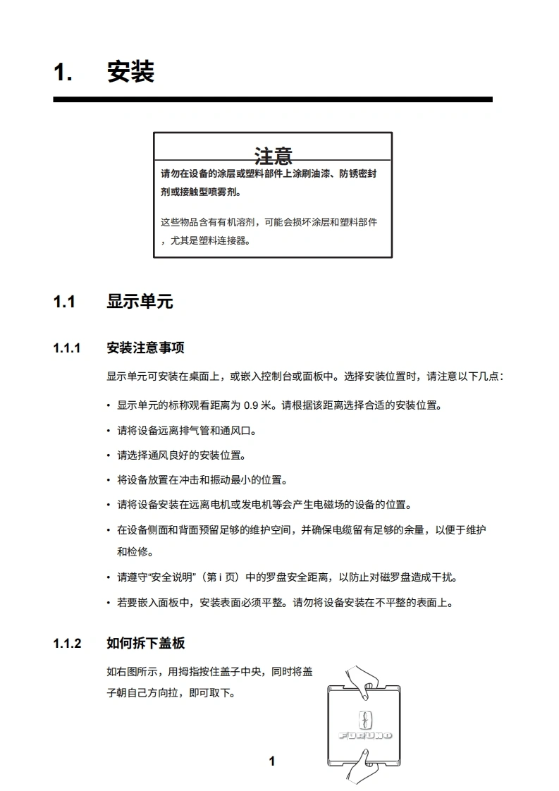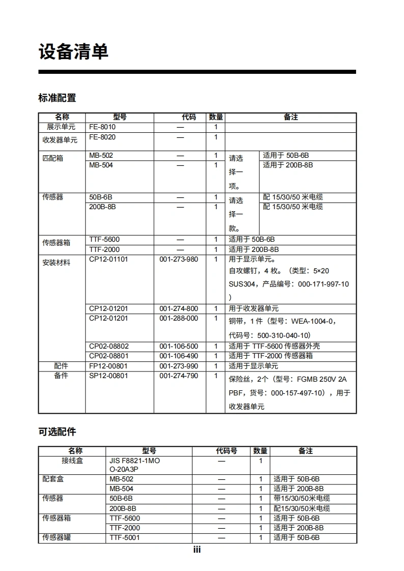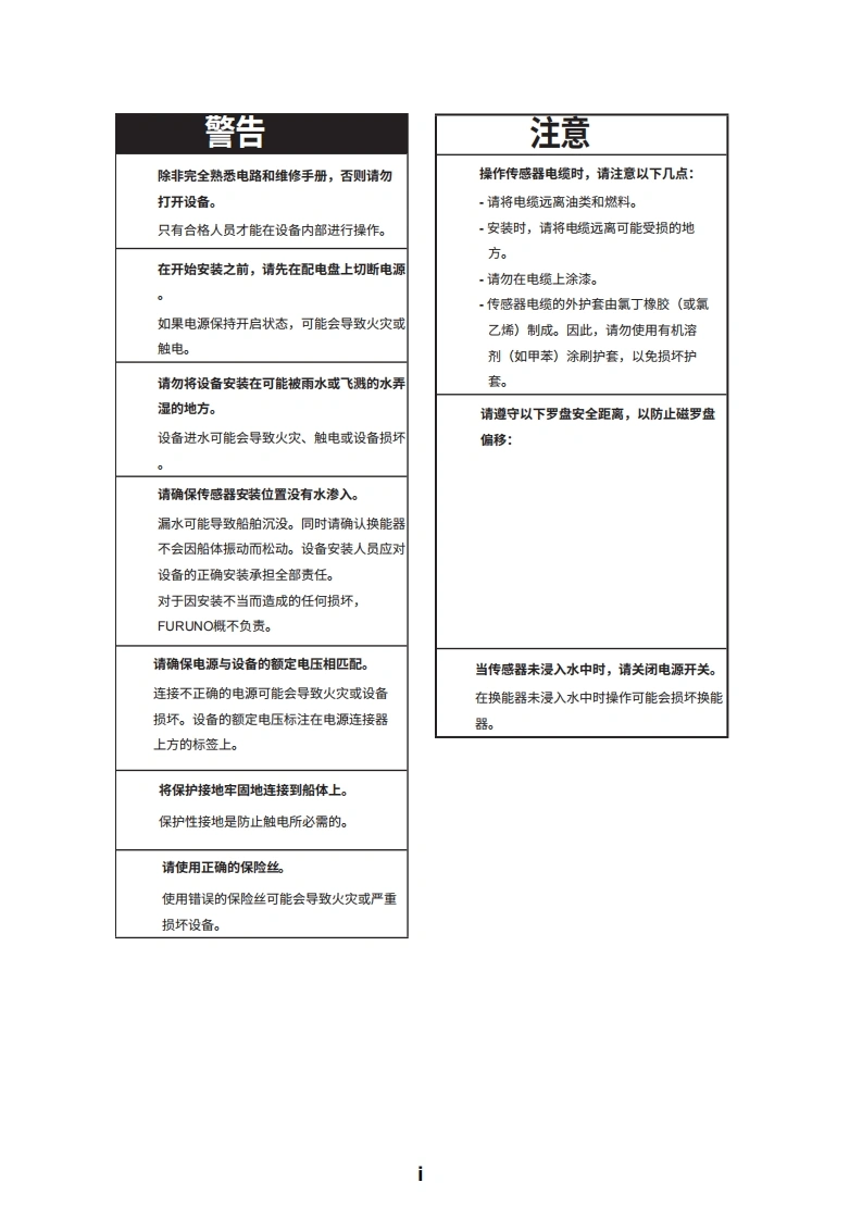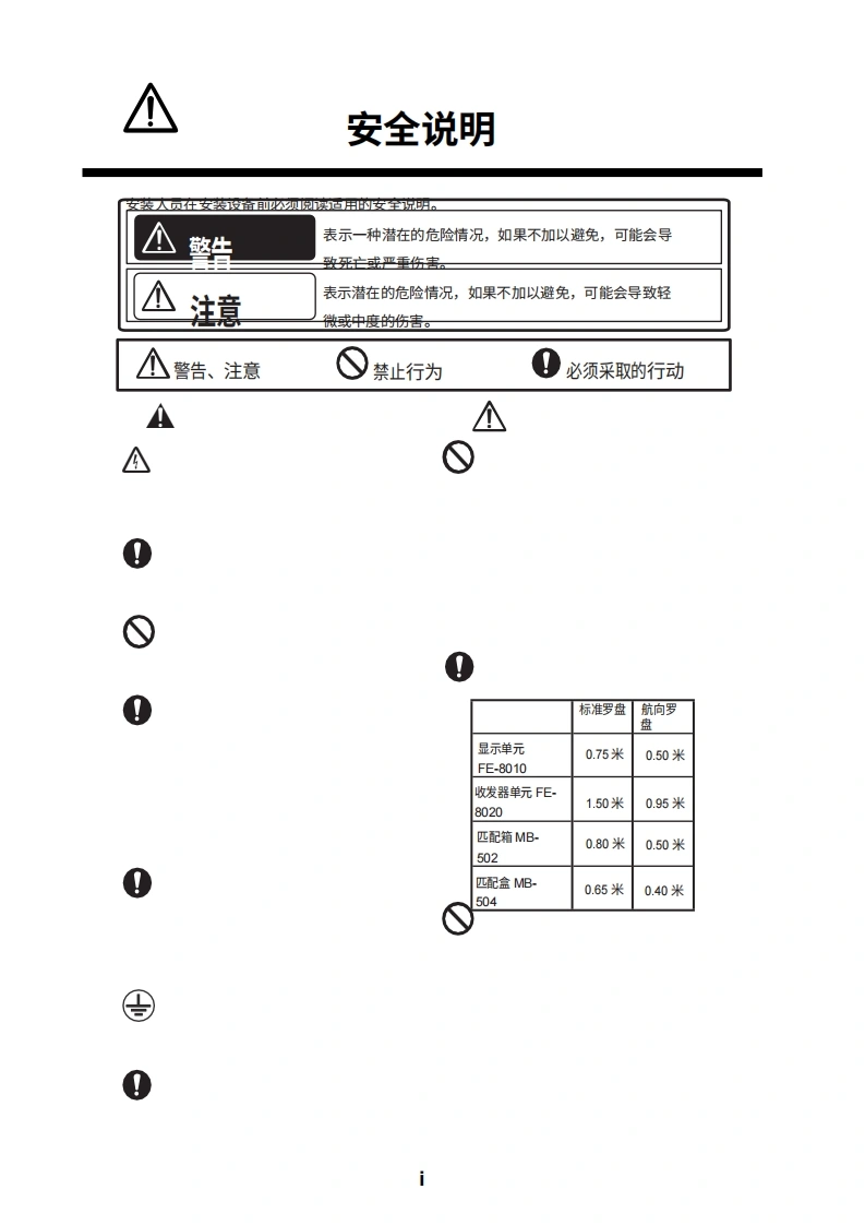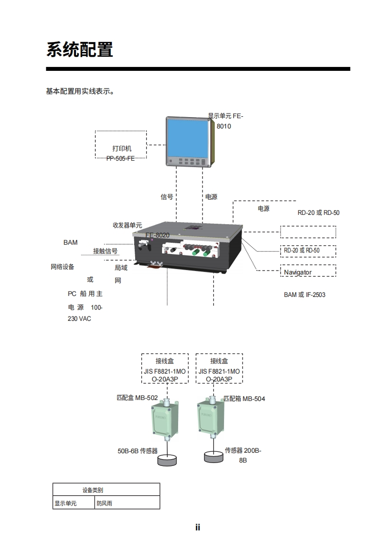 E安装手册导航回声测深仪型号FE-800安全说明.…系统配置。ii设备清单....1.安装.…1.1显示单元...11.2收发器单元.1.3换能器51.4匹配箱1.5闸阀GV-50B-6B、GV-200B-8B(可选)82.接线...92.1接线.…92.2电缆制造..102.3显示单元」.132.4收发器单元.132.5匹配箱…...162.6桥接警报管理(BAM)连接...182.7接线盒(可选)...183.调整.……….193.1服务菜单.193.2如何设置时间203.3如何设置频率.213.4如何设置端口213.5如何设置以太网….22附录1JS电缆指南.AP-1附绿2数字接口.AP-2装箱单A-1