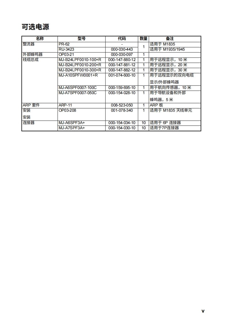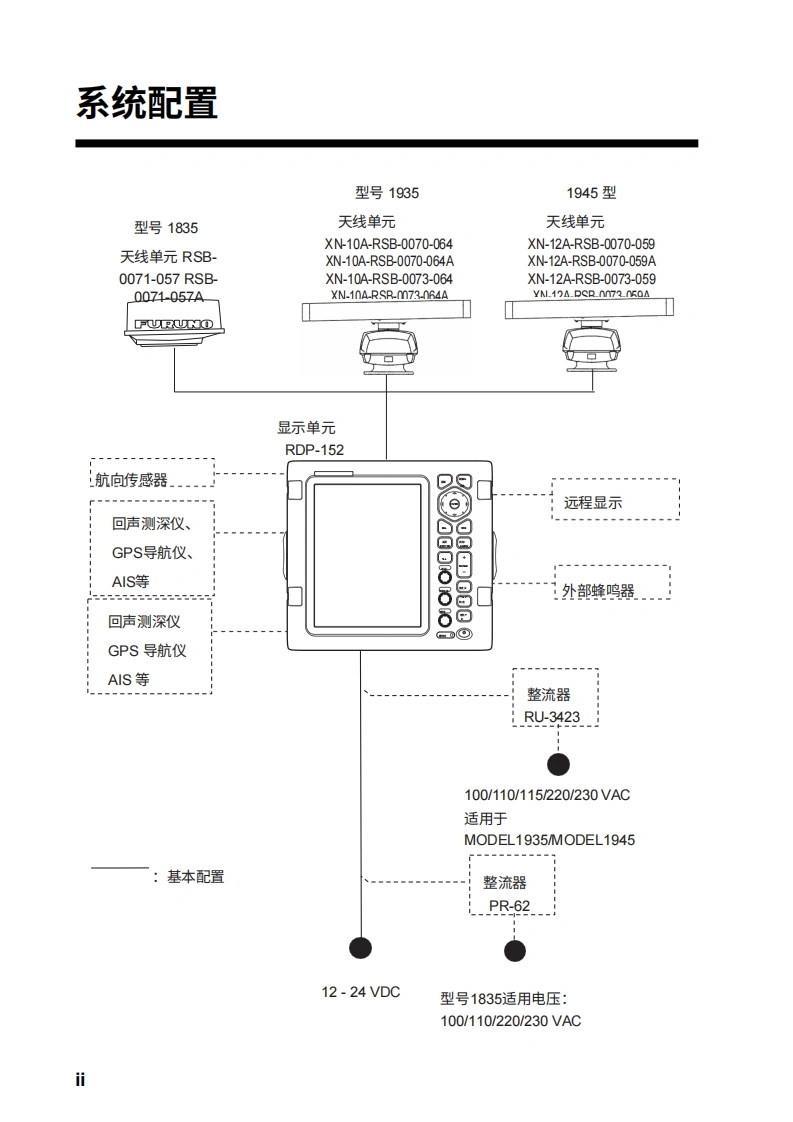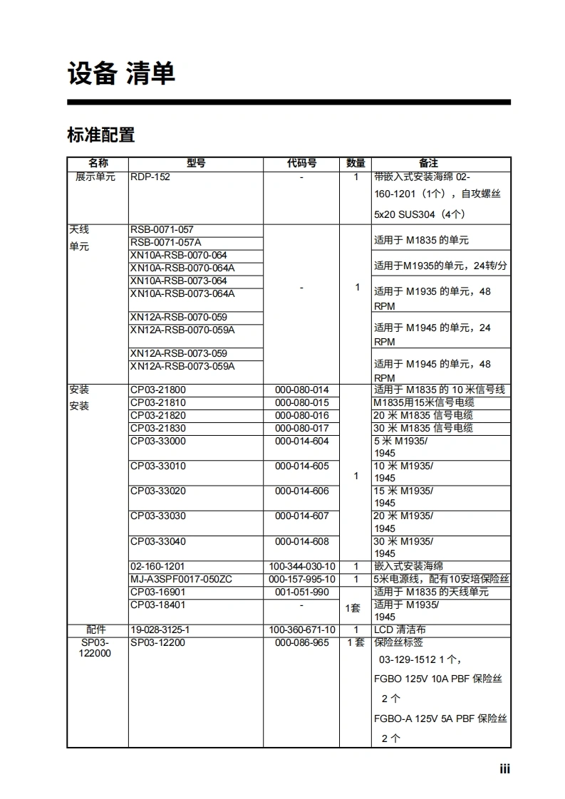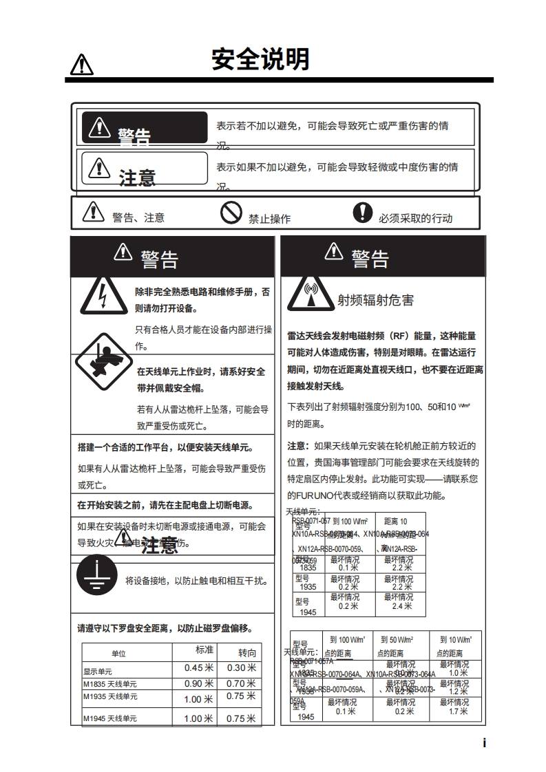 安装手册船用雷达MODEL1835/MODEL1935/MODEL1945安全须知系统配置,....设备清单............i1.系统安装指南.1-11.1显示单元.1-11.2型号1835的天线单元.….1-21.3适用于MODEL1935/MODEL1945的天线单元..1-92.电缆连接.2-12.1标准连接..2-12.2数据信号端口.…2-23.如何设置设备….3-13.1如何设置语言…3-13.2如何设置用途和型号3-23.3如何输入初始设置3-34.可选设备4-14.1ARP套件ARP-114-14.2蜂鸣器和/或远程显示屏的连接4-4装箱单A-1外形图….D-1互连图…S-1