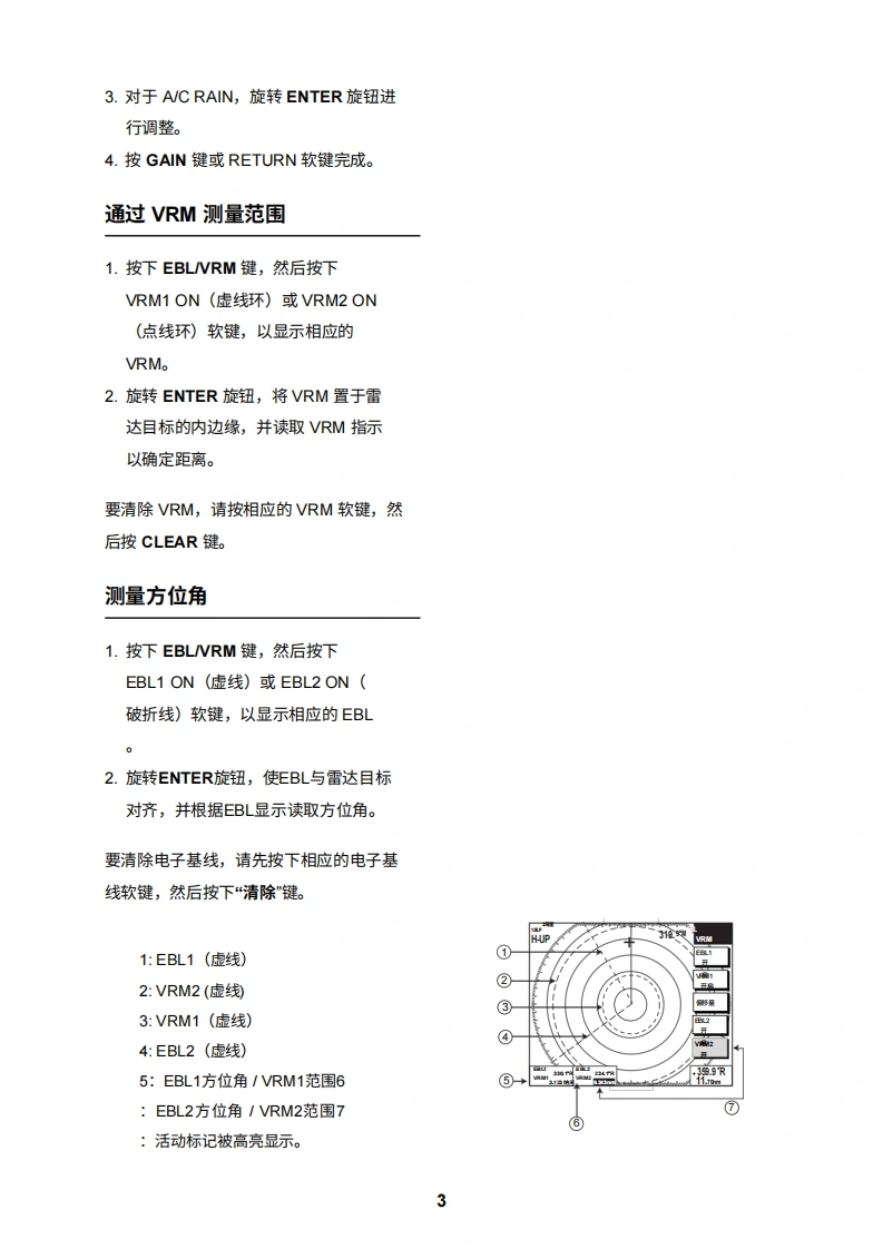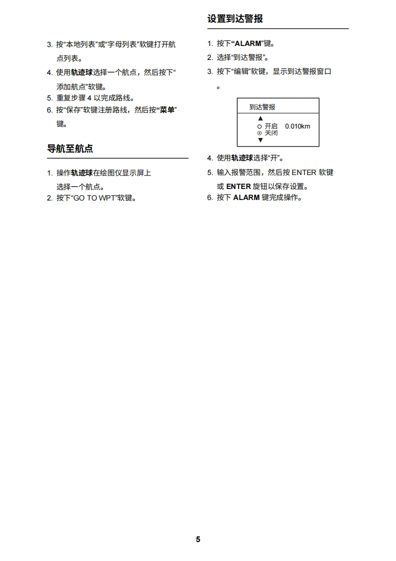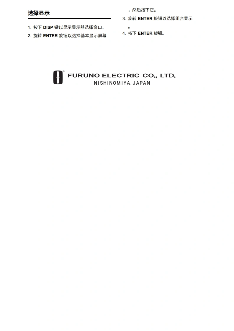 FURUNONAVnet型号1824C/1834C/1934C/1944C/1954C/1964C GD-1920C操作指南本指南旨在提供本设备的基本操作程序。如需了解更详细的信息,请参阅《操作手册》。8A1:打开关闭警报菜单。2:清除数据;删除所选标记。3:打开DISP/关闭主菜单。4:选择一个范围。9①5:输入字母数字数据。②6:雷达:显示用于调整增益、AC SEA、EA/C RAIN的软键。声纳:调整增益。④7:按住三秒:关闭电源。短按:打开电源;⑧显示用于调节亮度和色调的软键;显示"RADAR STBY/TX"软键。128:显示模式选择窗口。9:短按:将本船位置保存为航点。按住三秒:棕记落水人员位置。⑥10:显示或隐藏软键、功能键及导航数据。1011:显示EBLNRM的软键。12:软键⑦A:轨迹球移动EBLNRM和光标;选择菜单项目和选项。B:ENTER旋钮按压:保存设置。1旋转:调整增益、VRM、EBL等;选择菜单项目和选项。也可用于输入字母数字数据。C:图表驱动电源开关约3秒)开启电源短暂按下POWER/BRILL键。关闭电源长按POWER/BRILL键,直到屏幕熄灭(