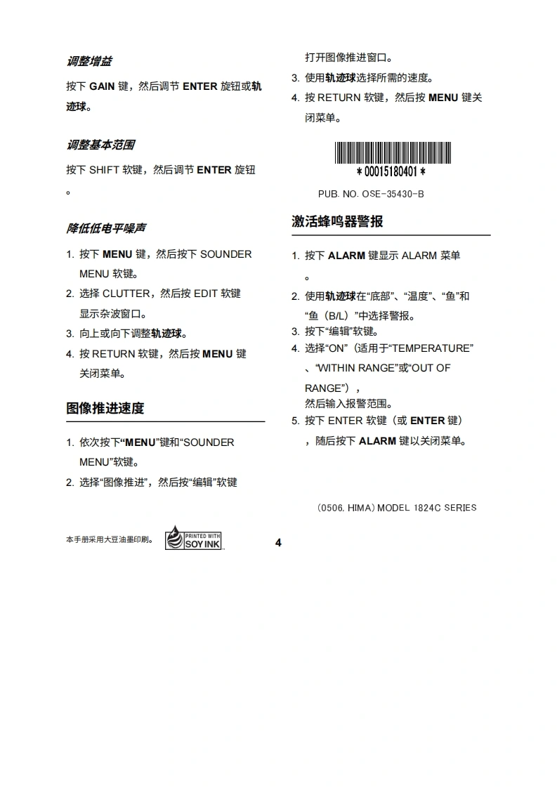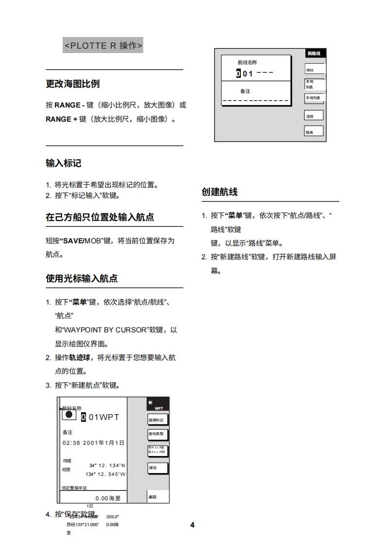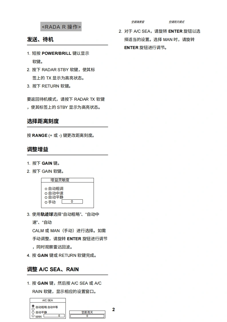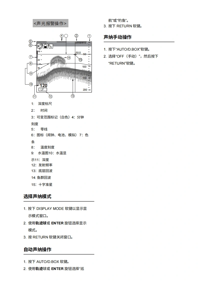 FURUNONAVnet型号1824C/1834C/1934C/1944C/1954C/1964C GD-1920C操作指南本指南旨在提供本设备的基本操作程序。如需了解更详细的信息,请参阅《操作手册》。8A1:打开关闭警报菜单。2:清除数据;删除所选标记。3:打开DISP/关闭主菜单。4:选择一个范围。9①5:输入字母数字数据。②6:雷达:显示用于调整增益、AC SEA、EA/C RAIN的软键。声纳:调整增益。④7:按住三秒:关闭电源。短按:打开电源;⑧显示用于调节亮度和色调的软键;显示"RADAR STBY/TX"软键。128:显示模式选择窗口。9:短按:将本船位置保存为航点。按住三秒:棕记落水人员位置。⑥10:显示或隐藏软键、功能键及导航数据。1011:显示EBLNRM的软键。12:软键⑦A:轨迹球移动EBLNRM和光标;选择菜单项目和选项。B:ENTER旋钮按压:保存设置。1旋转:调整增益、VRM、EBL等;选择菜单项目和选项。也可用于输入字母数字数据。C:图表驱动电源开关约3秒)开启电源短暂按下POWER/BRILL键。关闭电源长按POWER/BRILL键,直到屏幕熄灭(