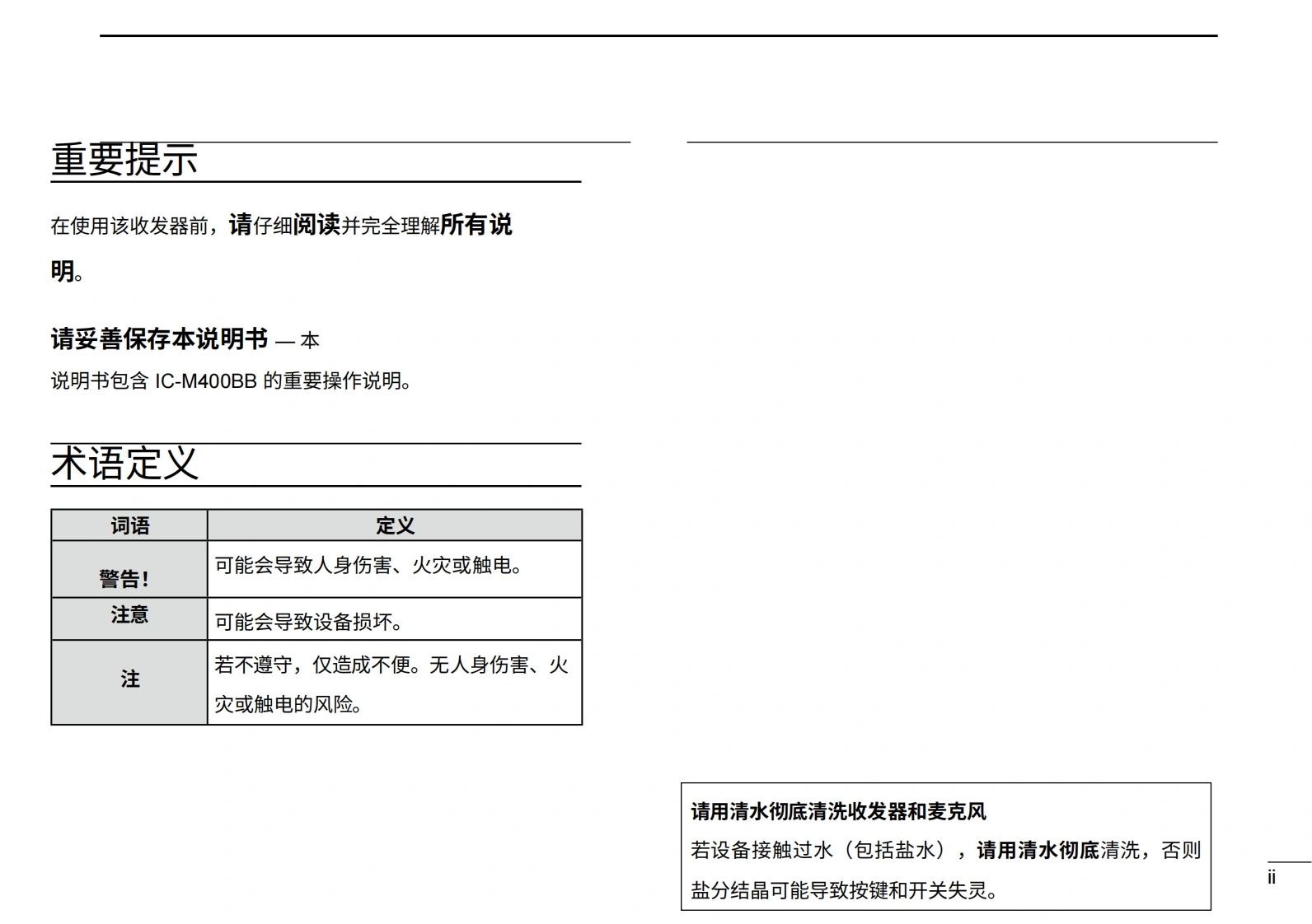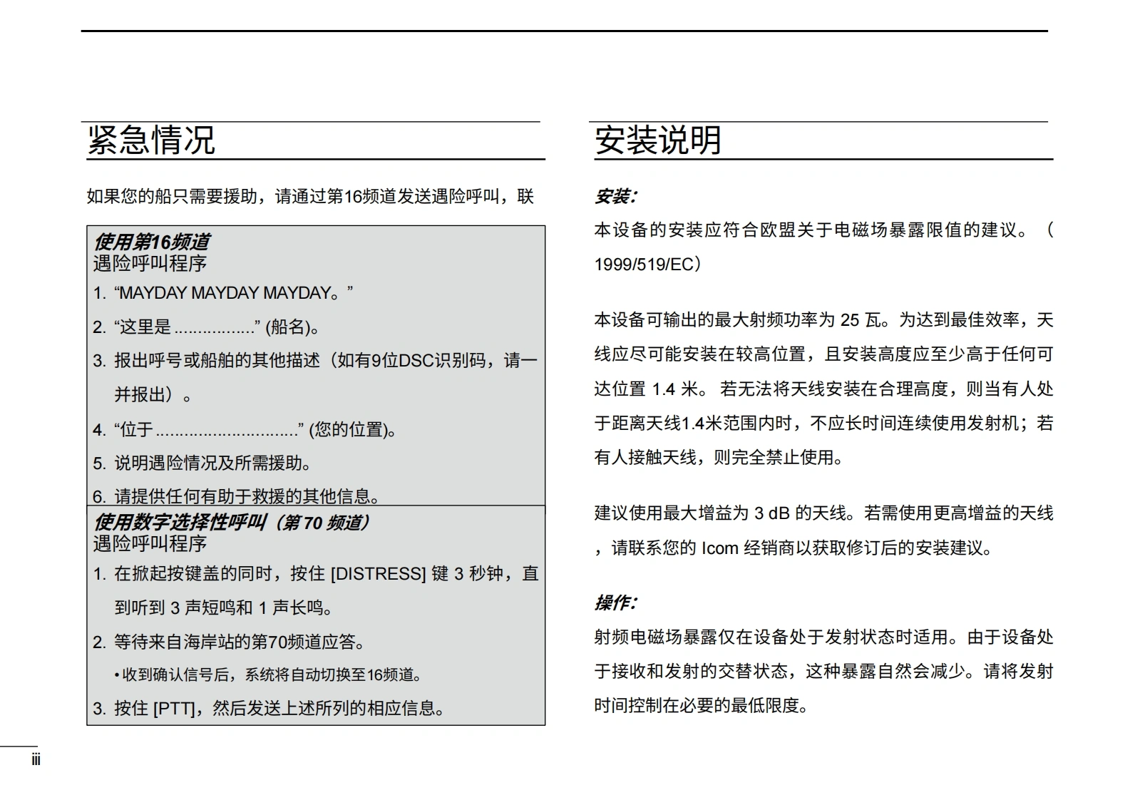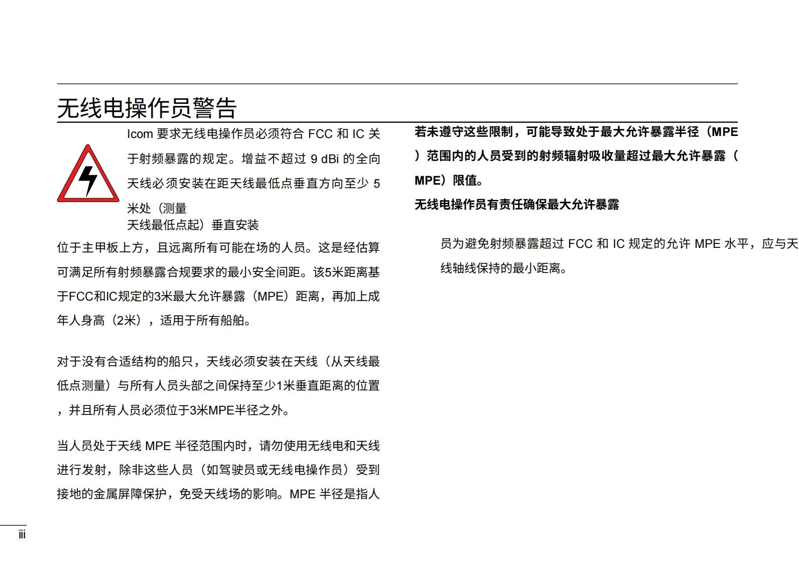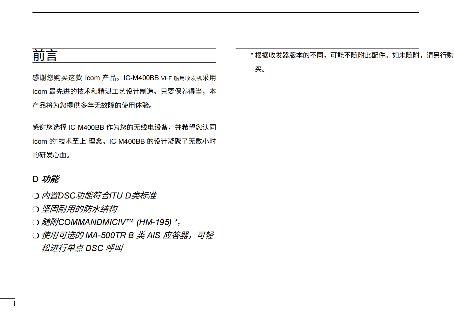 艾可慕icom-ic-m400-user-guide操作说明书手册20260331中文版找手册网3天前发布关注私信1.61MB45页036艾可慕icom-ic-m400-user-guide操作说明书手册20260331中文版此内容为付费资源,请付费后查看¥19¥21黄金会员免费钻石会员免费登录购买付费资源 第1页 / 共45页 第2页 / 共45页 第3页 / 共45页 第4页 / 共45页 第5页 / 共45页 第6页 / 共45页 第7页 / 共45页 第8页 / 共45页 第9页 / 共45页 第10页 / 共45页 试读已结束,还剩35页,您可下载完整版后进行离线阅读 THE END艾可慕 文本预览 COM使用说明书四TCOMVHF船用收发机餐6IM4OOBB▣▣▣▣gJ@COMMANDMIC本设备符合美国联邦通信委员会(FCC)规则第15部分的规9COM花aoos定。使用本设备须确保不会造成有害干扰。COMMANDMICIVTM(HM-195)Icom Inc.根据收发机的版本不同,可能不随附该麦克风。 查看更多 收起部分 喜欢就支持一下吧收藏