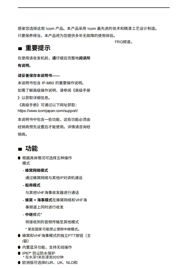 艾可慕Icom-IP-M60-操作说明书手册20260331中文版找手册网3天前发布关注私信2.20MB79页050艾可慕Icom-IP-M60-操作说明书手册20260331中文版此内容为付费资源,请付费后查看¥19¥21黄金会员免费钻石会员免费登录购买付费资源 第1页 / 共79页 第2页 / 共79页 第3页 / 共79页 第4页 / 共79页 第5页 / 共79页 第6页 / 共79页 第7页 / 共79页 第8页 / 共79页 第9页 / 共79页 第10页 / 共79页 试读已结束,还剩69页,您可下载完整版后进行离线阅读 THE END艾可慕 文本预览 American Communication Systems▣▣COMDiscover the Power of CommunicationsThttp://www.ameradio.com使用说明书海事LTE混合型收发器IP-M60COM四010:10画USA16*LTE group1本设备符合FCC规则第15部分的规定。使用本设16mFUNC备须确保不会造成有害干扰。noPMGOCEVEnIcom Inc. 查看更多 收起部分 喜欢就支持一下吧收藏