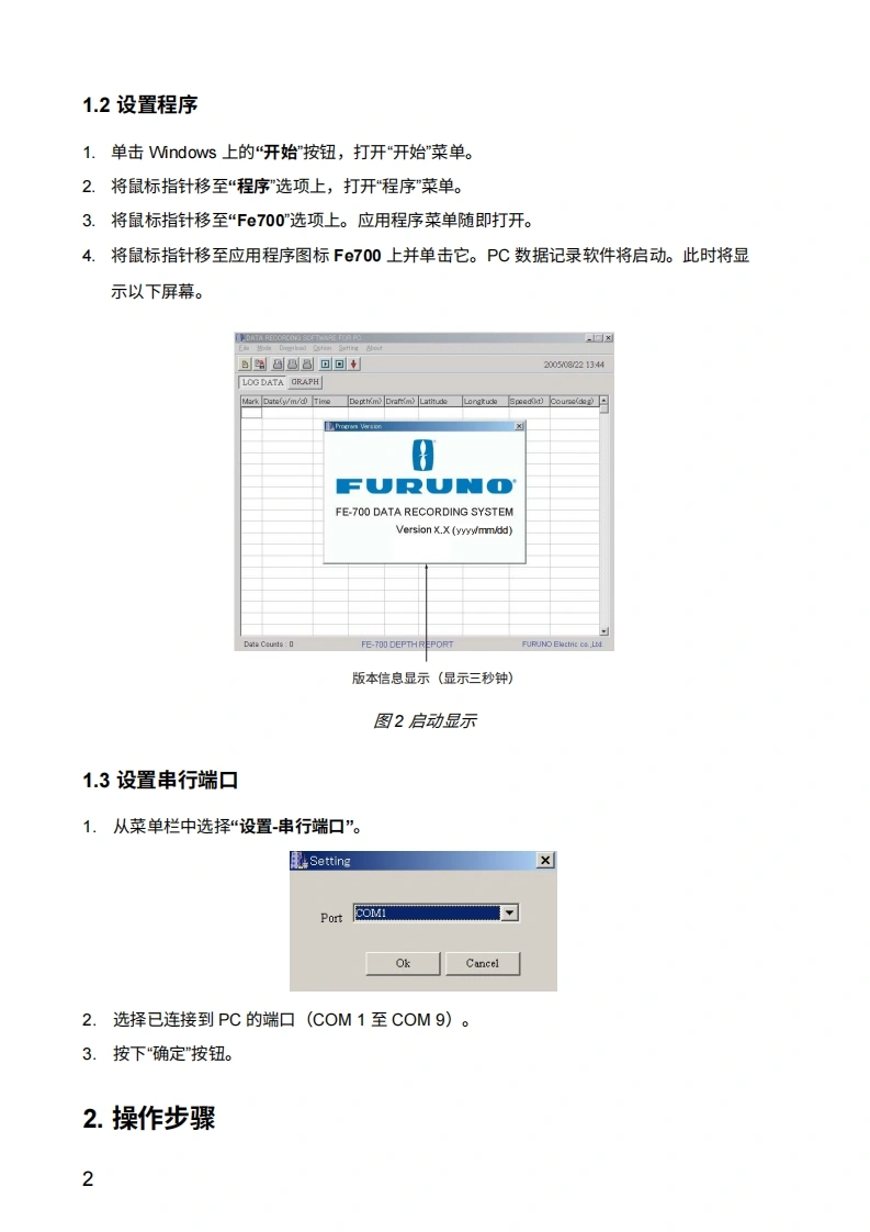 日本古野FURUNO-data_recording_software_v502_安装调试说明书手册-20260409中文版找手册网3天前发布关注私信1.20MB14页028日本古野FURUNO-data_recording_software_v502_安装调试说明书手册-20260409中文版此内容为付费资源,请付费后查看¥19¥21黄金会员免费钻石会员免费登录购买付费资源 第1页 / 共14页 第2页 / 共14页 第3页 / 共14页 第4页 / 共14页 第5页 / 共14页 第6页 / 共14页 第7页 / 共14页 第8页 / 共14页 第9页 / 共14页 第10页 / 共14页 试读已结束,还剩4页,您可下载完整版后进行离线阅读 THE ENDCobra/Furuno 文本预览 返回PC用数据记录软件(FE-700可选套件)本应用软件用于从航行用回声测深仪FE-700采集日期、时间、深度、吃水、纬度、经度、速度和航向等数据。FE-700与PC之间的连接如下。FE-700PC*分配箱FE-702TB1OM显示单元EIA232-电缆★d 查看更多 收起部分 喜欢就支持一下吧收藏 上一篇 日本古野FURUNO-cu300_安装调试说明书手册-20260409中文版 下一篇 日本古野FURUNO-db500_安装调试说明书手册_d-20260409中文版 评论 抢沙发 请登录后发表评论 登录 注册 请登录后查看评论内容