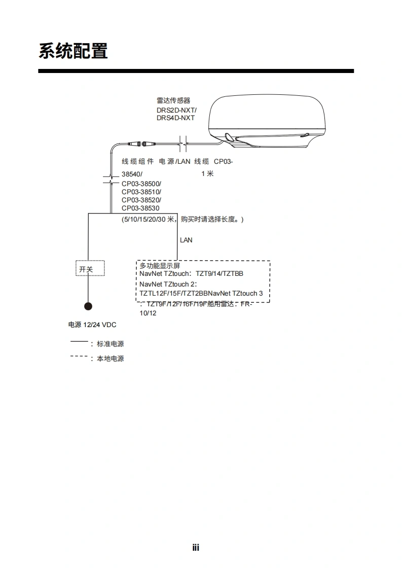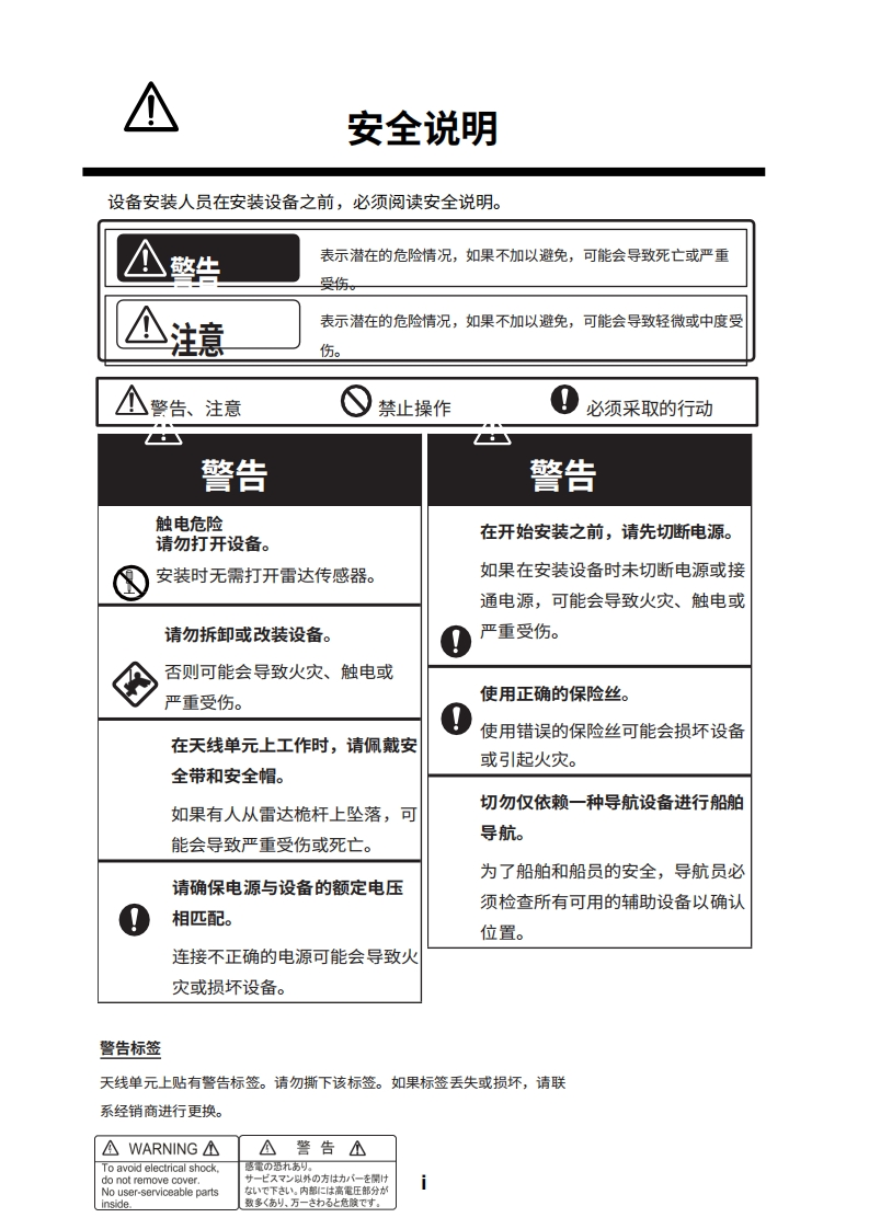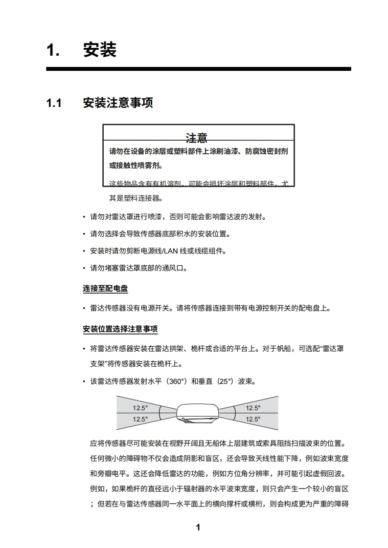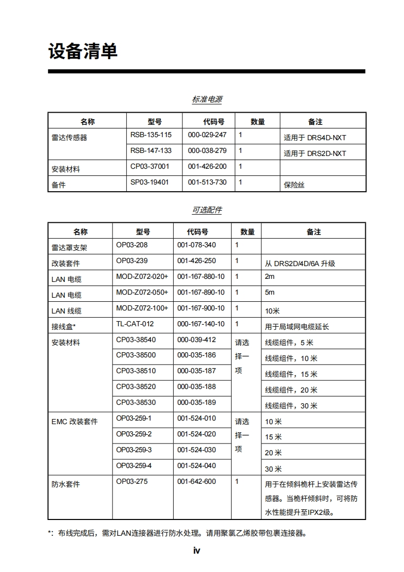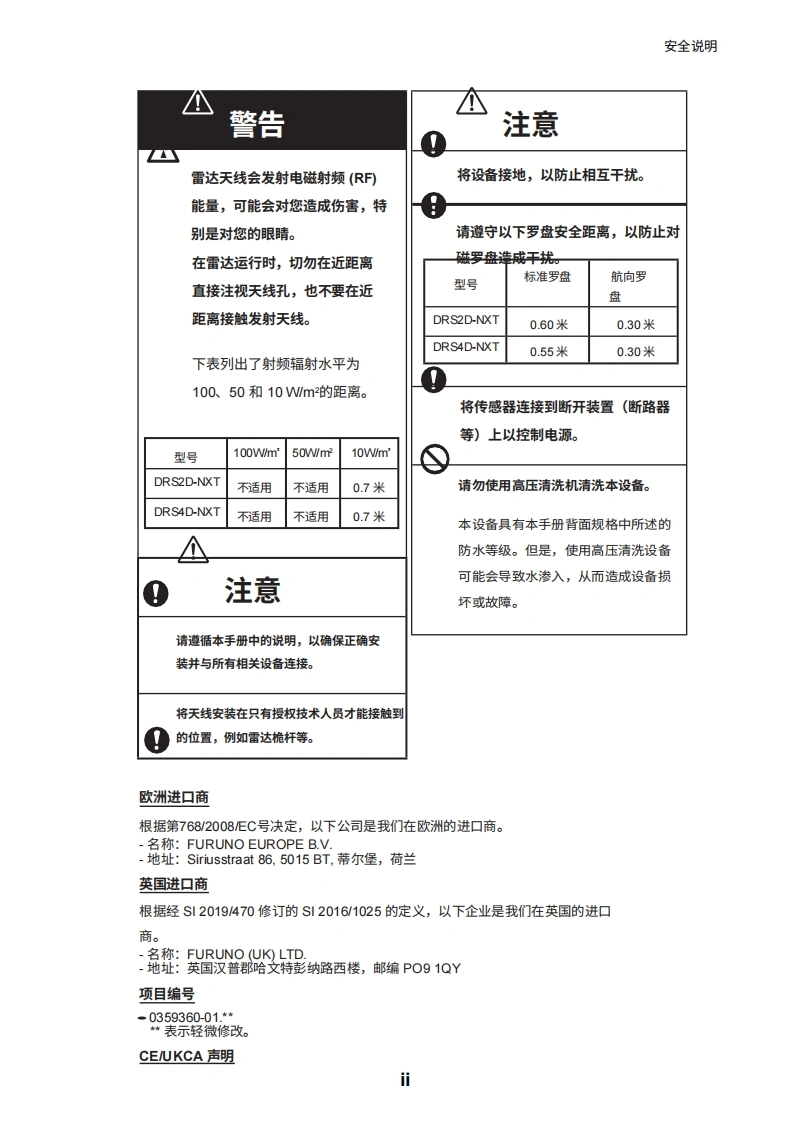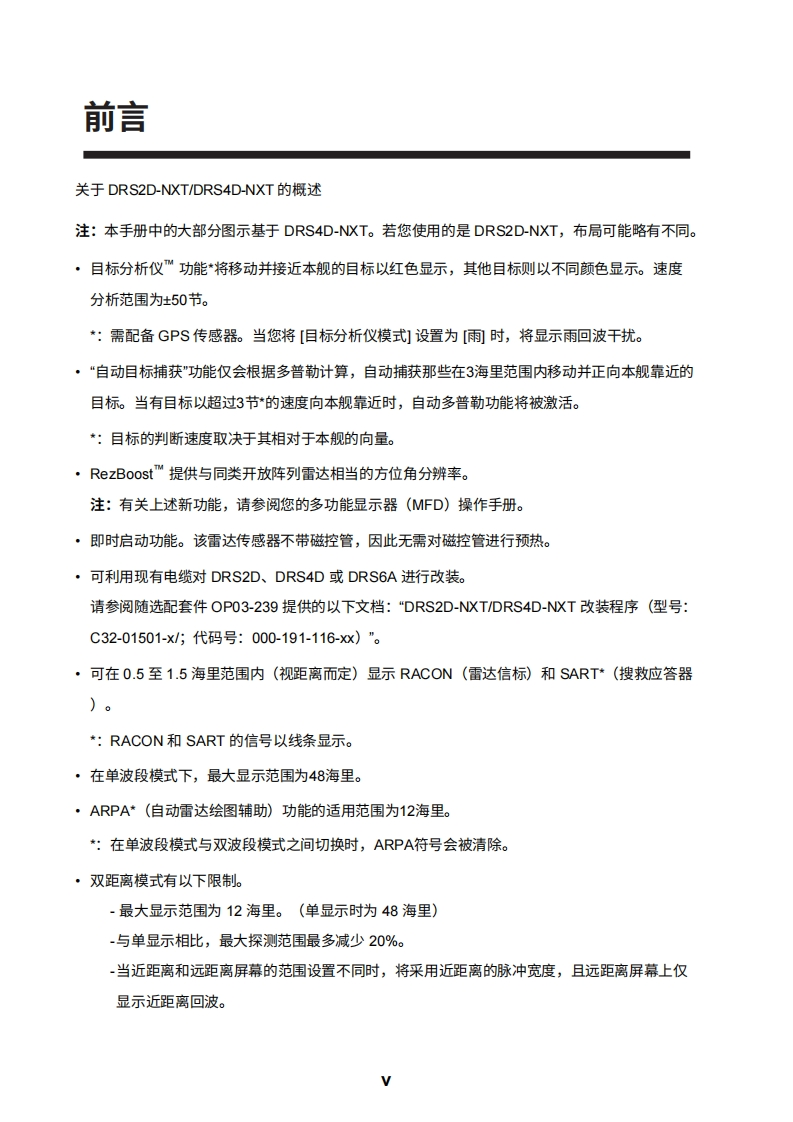 安装手册雷达传感器型号DRS2D-NXT/DRS4D-NXT(产品名称:固态多普勒雷达)安全说明系统配置.…设备清单…。前言V1.安装1.1安装注意事项.1.11.2雷达传感器的安装.31.3接线2.初始设置.….82.1安装后的检查要点82.2初始设置..83.维护与故障排除.153.1维护..153.2更换保险丝.153.3故障排除163.4部件使用寿命i..16附录1无线电监管信息.AP-1规格SP-1行李清单…A-1示意图.D-1互连图…。S-1MXT
