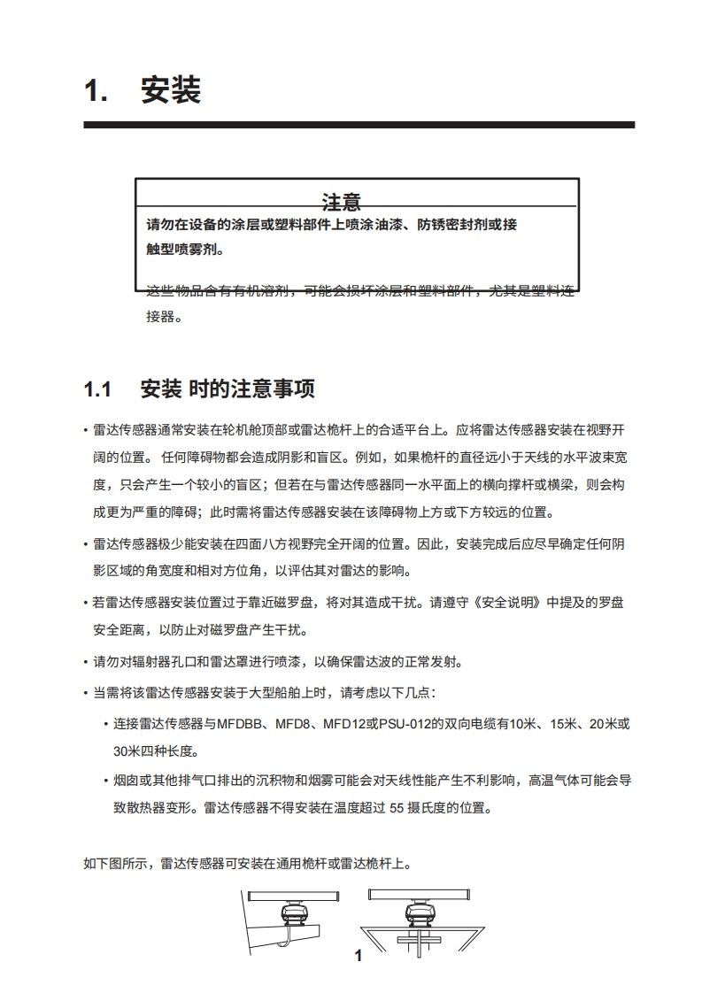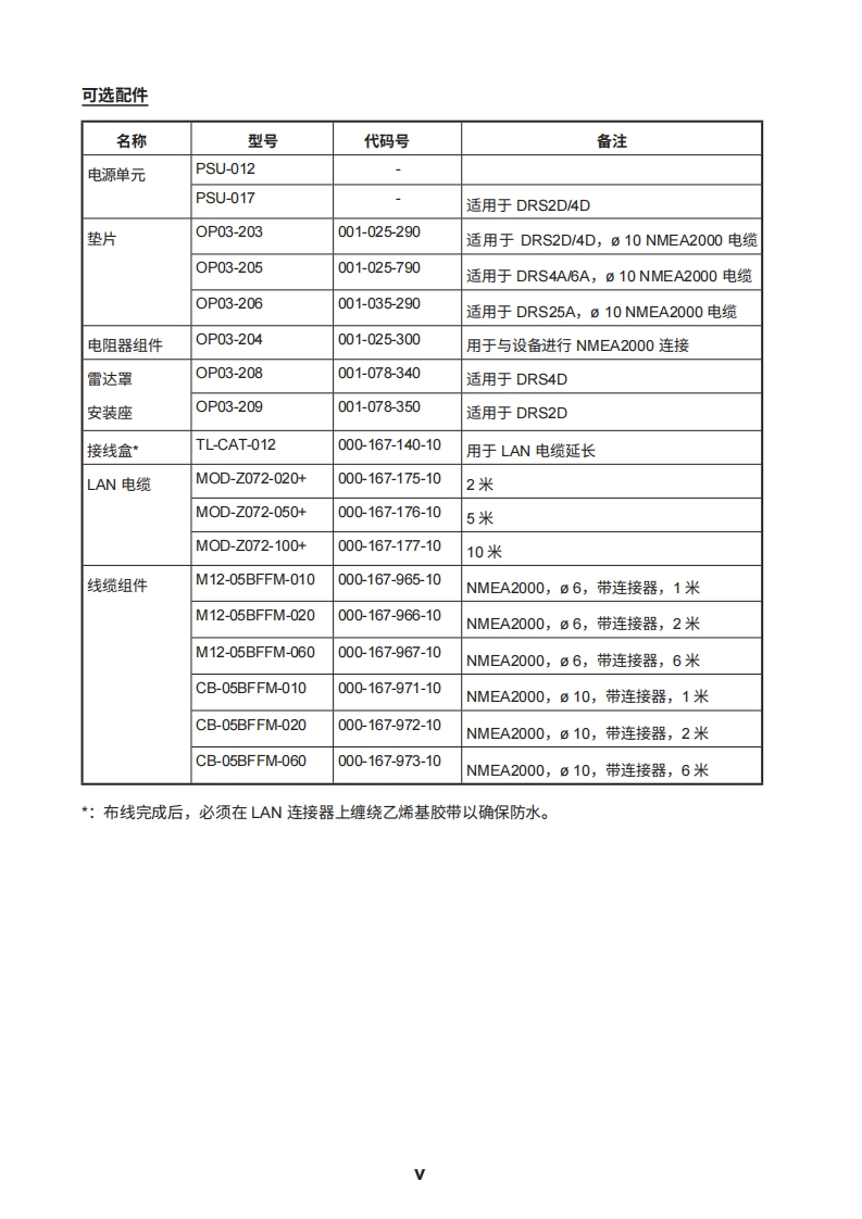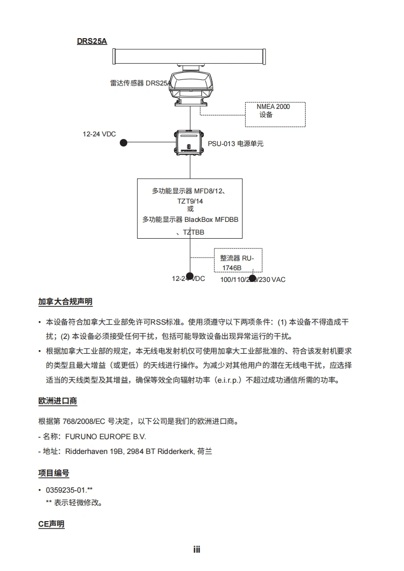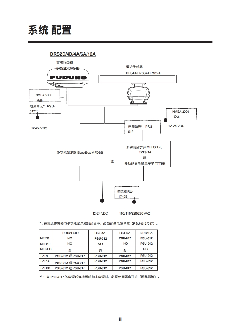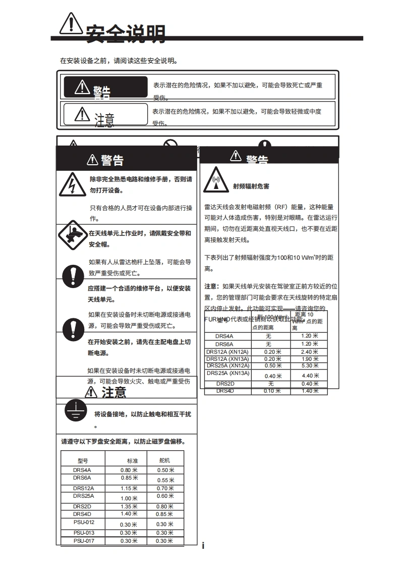 FURUNO安装手册雷达传感器型号DRS2D/DRS4D/DRS4A/DRS6A/DRS12A/DRS25A安全说明系统配置6i0n444.设备清单…1.安装.11.1安装注意事项..11.2DRS2D/4D安装步骤21.3DRS4AV6AW12AWV25A的安装步骤31.4电源单元安装...82.接线.112.1DRS2D/4D内部布线152.2DRS4AV6AW12AW25A内部布线192.3电源单元接线.23规格SP-1包装清单A-1外形图D-1互连图。SS55S5553555555555585853558585515555858558885488884884888555555555555555S-1