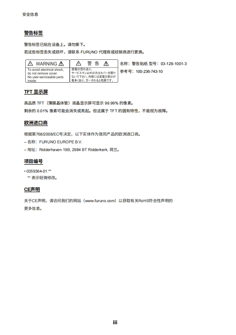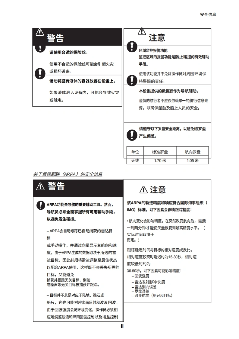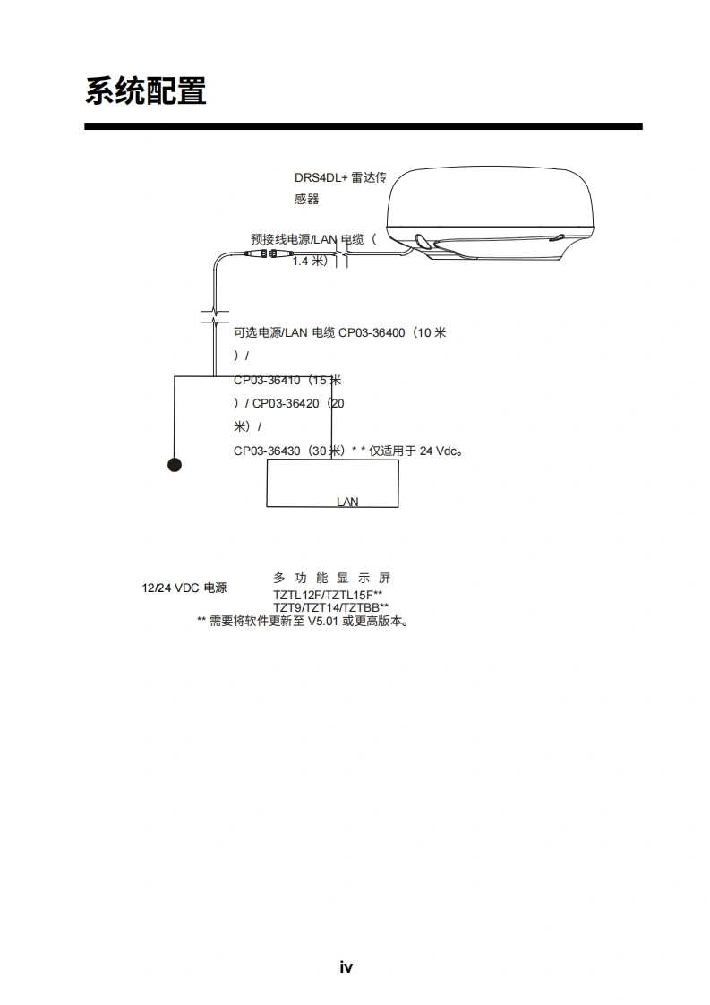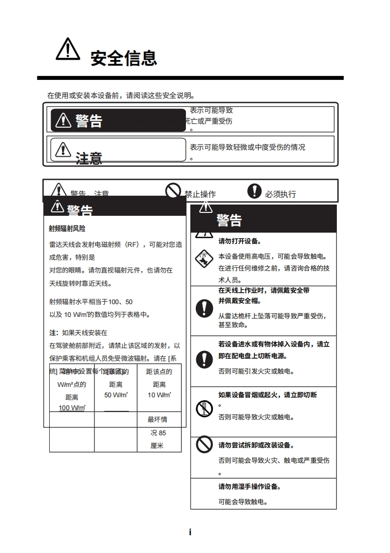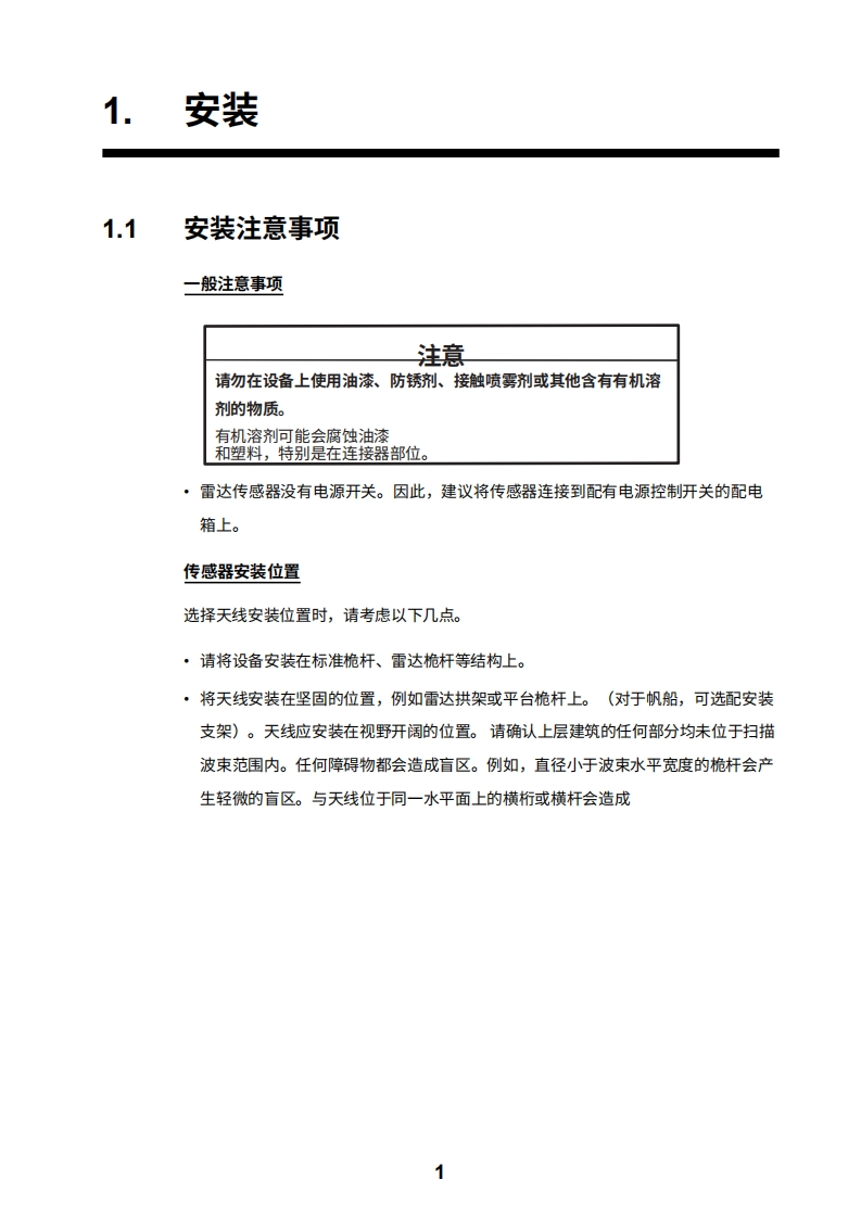 2雷达传感器安装手册型号DRS4DL+(产品名称:雷达传感器雷达罩)安全信息.…系统记背,,11h1./设备清单..V1.安装1.1安装注意事项…11.2雷达传感器安装32.初始调整.……………2.1连接..…992.2 NavNet TZtouch的初始设置(型号:TZT9/TZT14/TZTBB).102.3 NavNet TZtouch2的初始设置(型号:TZTL12F/TZTL15F).132.4安装后的检查要点.153.维护与故障排除.173.1维护.......173.2更换保险丝183.3故障排除183.4更换磁控管.18附录1无线电法规信息AP.1特性.SP1产品内容…A-1尺寸D-1互连图s-1FURUNO ELECTRIC CO.,LTD.