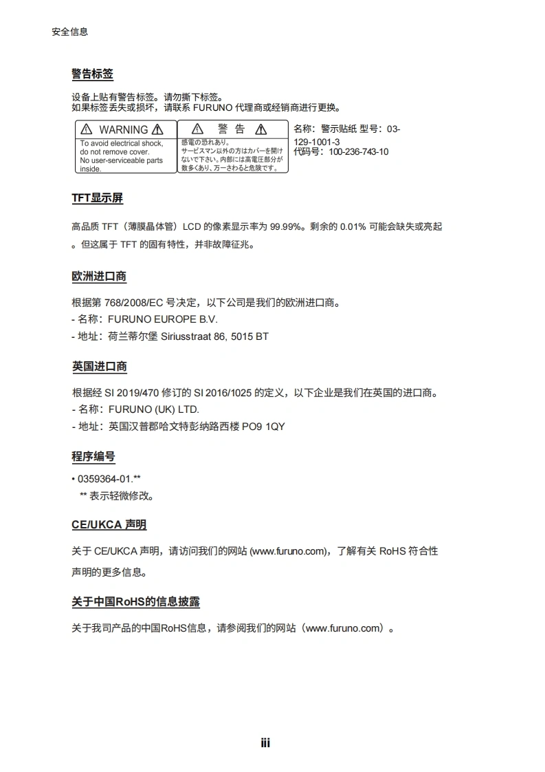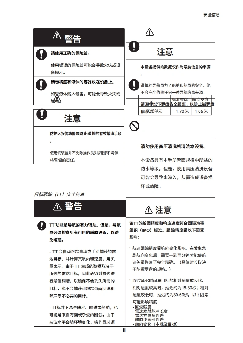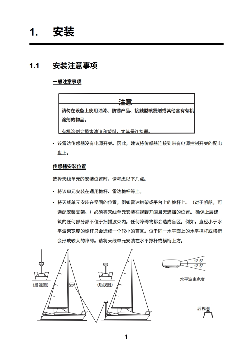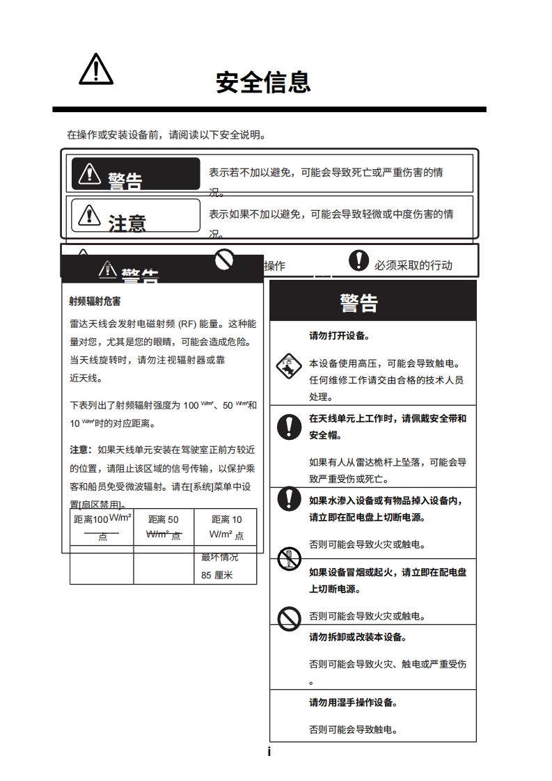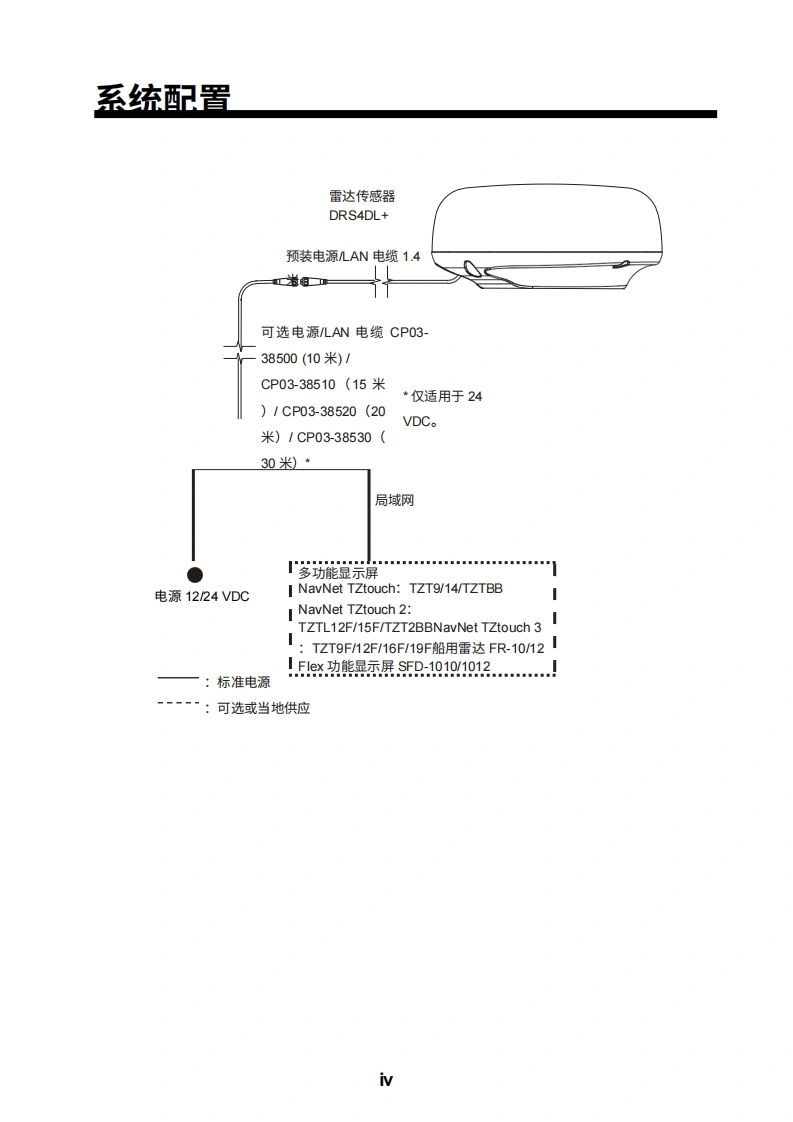 2■D安装手册雷达传感器型号DRS4DL+(产品名称:雷达罩雷达传感器)安全信息系统配置iv设备清单..V1.安装1.1安装注意事项1.2雷达传感器的安装2.初始设置>2.1连接.….72.2 NavNet TZtouch初始设置(型号:TZT9/TZT14 TZTBB)72.3 NavNet TZtouch2的初始设置(型号:TZTL12 F/TZTL15F).102.4安装后的检查要点.…123.维护与故障排除.143.1维护.143.2更换保险丝.153.3故障排除..153.4更换磁控管.15附录1无线电监管信息.AP.1规格SP-1装箱单A-1示意图D-1互连图.…...S-1FURUNO ELECTRIC CO.,LTD.