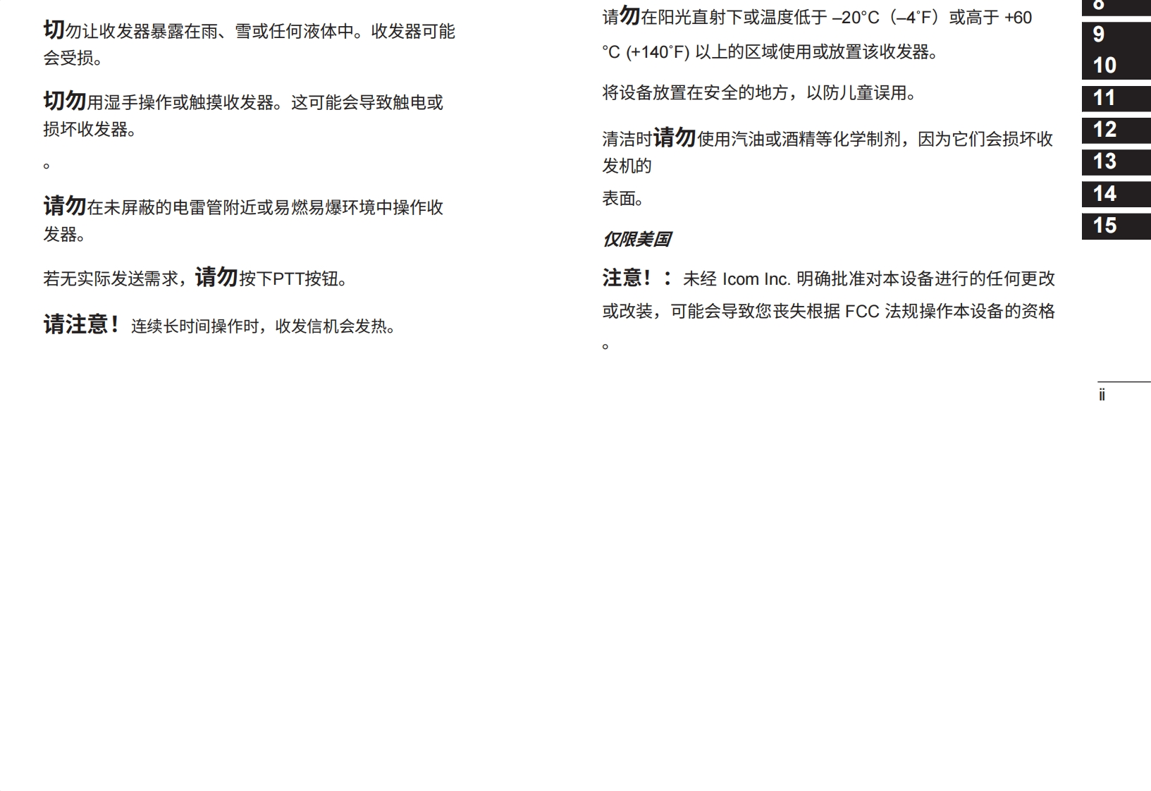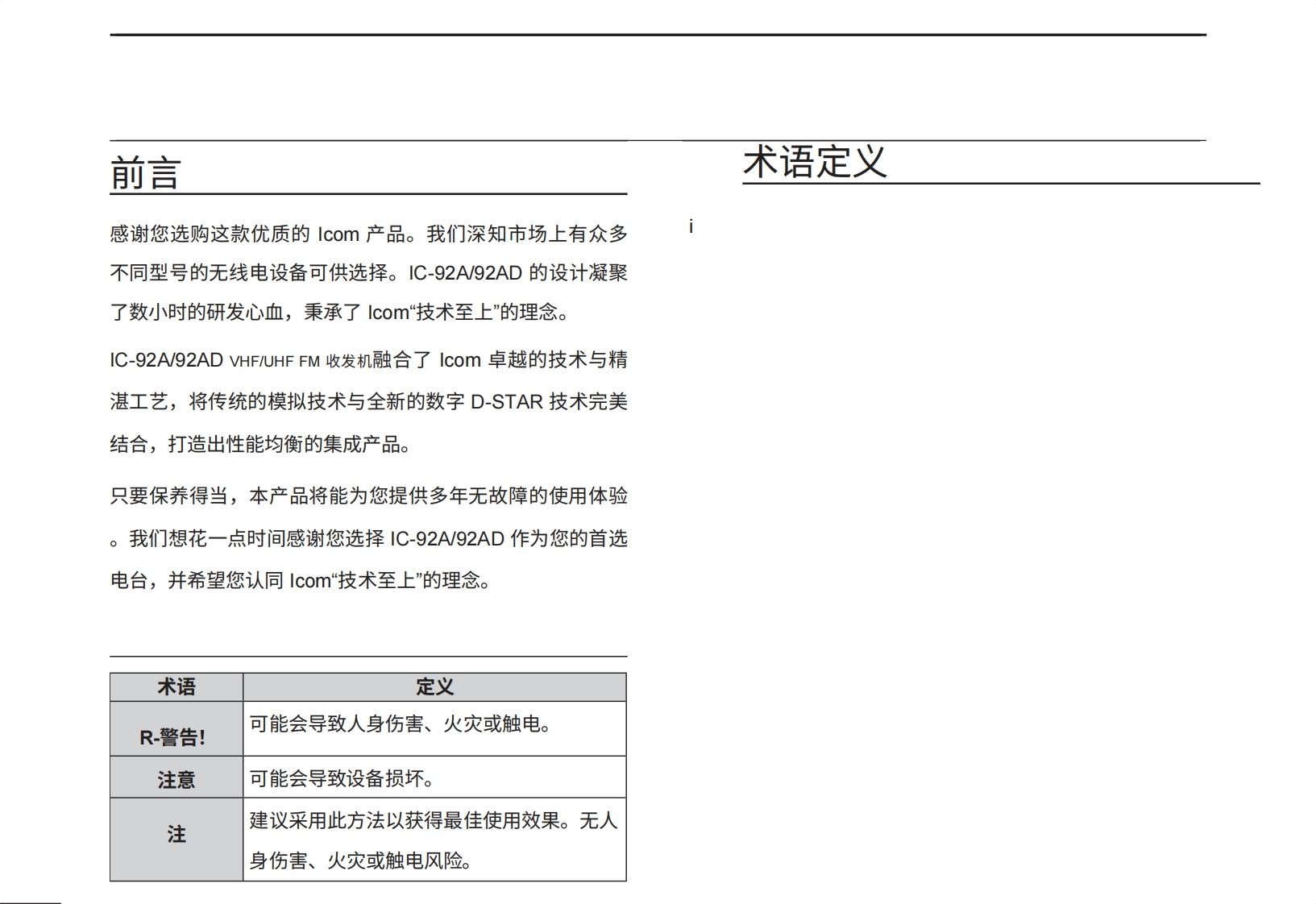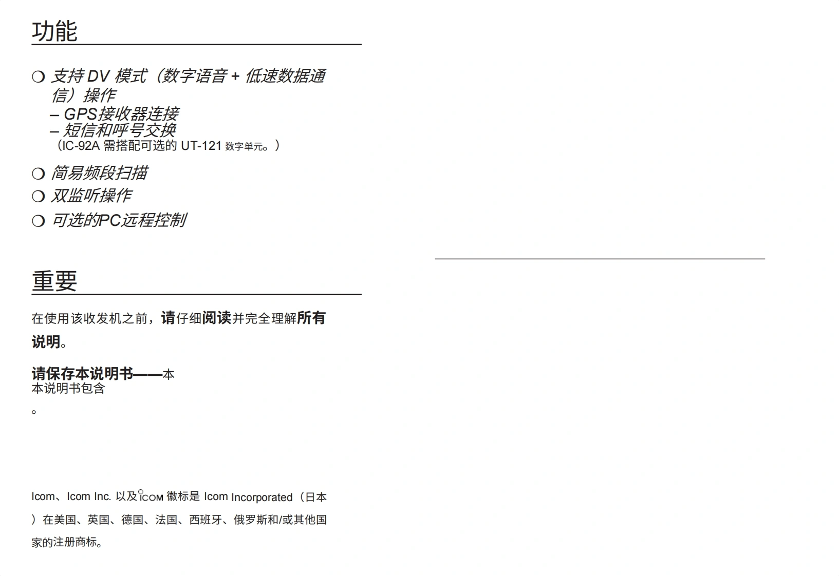 艾可慕Icom_IC-92A-IC-92AD-(Manual操作说明书手册)20260331中文版找手册网3天前发布关注私信6.11MB271页047艾可慕Icom_IC-92A-IC-92AD-(Manual操作说明书手册)20260331中文版此内容为付费资源,请付费后查看¥19¥21黄金会员免费钻石会员免费登录购买付费资源 第1页 / 共271页 第2页 / 共271页 第3页 / 共271页 第4页 / 共271页 第5页 / 共271页 第6页 / 共271页 第7页 / 共271页 第8页 / 共271页 第9页 / 共271页 第10页 / 共271页 试读已结束,还剩261页,您可下载完整版后进行离线阅读 THE END艾可慕 文本预览 ICOM使用说明书VHF/UHF FM收发机i92ICOMVHF/UHF数字收发机i92△本设备符合FCC规则第15部分的规定。使用须遵守以下两个条件:D-STAR(1)本设备不得造成有害干扰;(2)本设备必须接受任何接收到的干扰,包括可能导致意外操作的干扰。回四画题图警告:根据FCC规则和联邦法律,禁止对本设备进行改装以接收蜂窝无线电话服务信号。Y-上图所示为1C92AD。Icom Inc. 查看更多 收起部分 喜欢就支持一下吧收藏