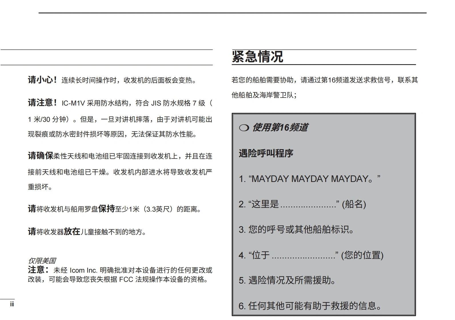 艾可慕icom_icm1v_使用说明书手册20260331中文版找手册网3天前发布关注私信3.03MB58页041艾可慕icom_icm1v_使用说明书手册20260331中文版此内容为付费资源,请付费后查看¥19¥21黄金会员免费钻石会员免费登录购买付费资源 第1页 / 共58页 第2页 / 共58页 第3页 / 共58页 第4页 / 共58页 第5页 / 共58页 第6页 / 共58页 第7页 / 共58页 第8页 / 共58页 第9页 / 共58页 第10页 / 共58页 试读已结束,还剩48页,您可下载完整版后进行离线阅读 THE END艾可慕 文本预览 使用说明书VHF船用收发机iΛ1/6本设备符合美国联邦通信委员会(FCC)规则第15部分的规定。使用本设备须遵守以下两项条件:(1)本设备不得造成有害干扰;(2)本设备必须接受任何接收到的干扰,包括可能导致意外运行的干扰。Icom Inc. 查看更多 收起部分 喜欢就支持一下吧收藏