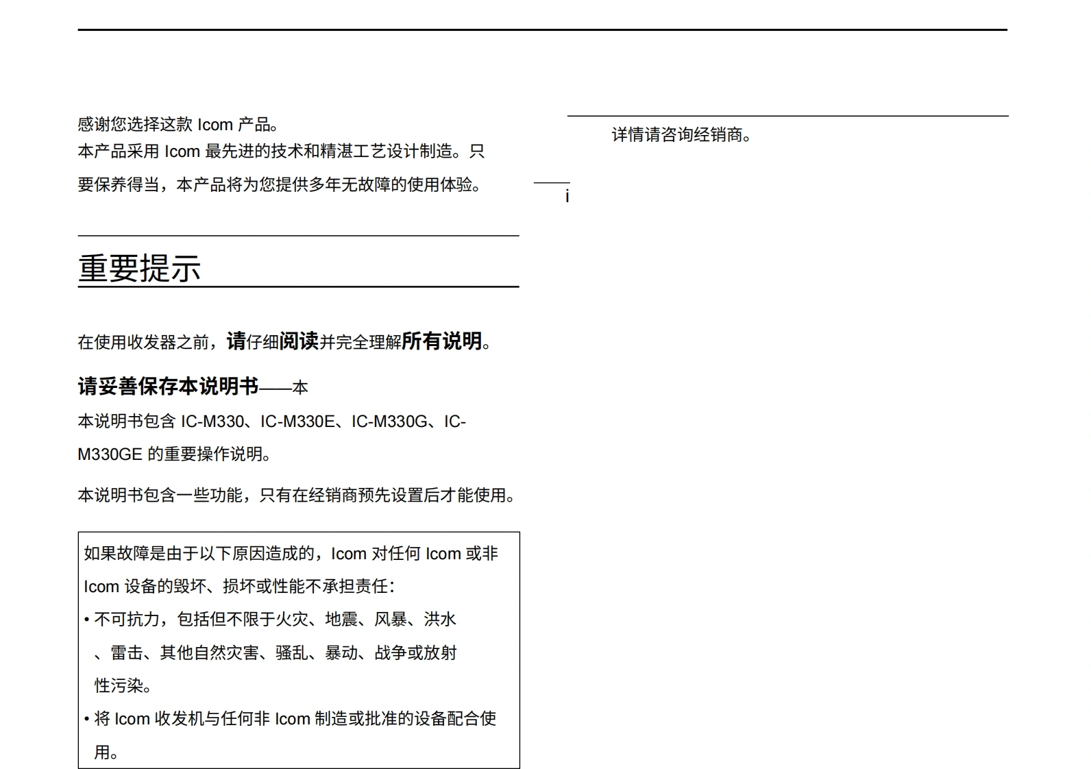 艾可慕icom_icm330series_使用说明书手册20260331中文版找手册网3天前发布关注私信3.82MB154页026艾可慕icom_icm330series_使用说明书手册20260331中文版此内容为付费资源,请付费后查看¥19¥21黄金会员免费钻石会员免费登录购买付费资源 第1页 / 共154页 第2页 / 共154页 第3页 / 共154页 第4页 / 共154页 第5页 / 共154页 第6页 / 共154页 第7页 / 共154页 第8页 / 共154页 第9页 / 共154页 第10页 / 共154页 试读已结束,还剩144页,您可下载完整版后进行离线阅读 THE END艾可慕 文本预览 使用说明书VHF船用收发机iΛ33○iM330三iM330GiVI33OG三COMVHF MARINE IC-M330a25W USASTBY25°4880°12W612:00@SCAN DWCH/WX HI/LODISTRESS 查看更多 收起部分 喜欢就支持一下吧收藏
