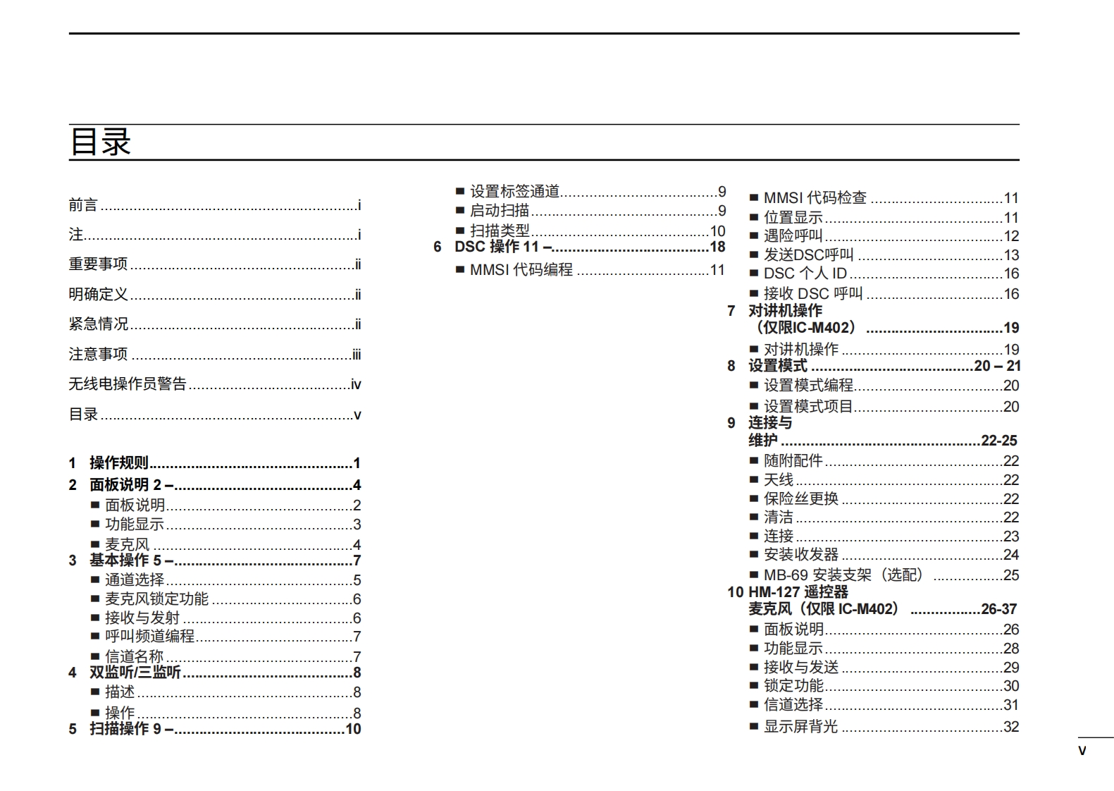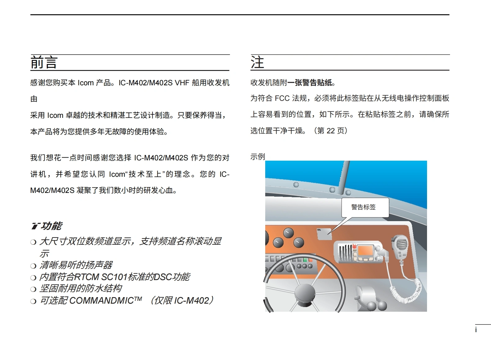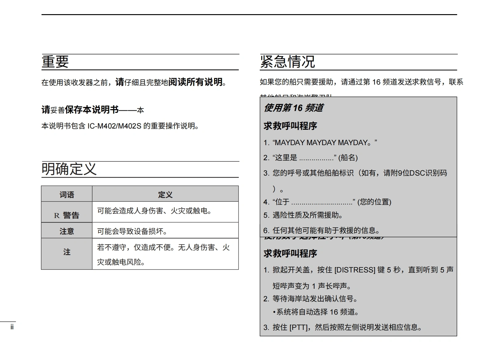 艾可慕icom_icm402-402s_使用说明书手册20260331中文版找手册网3天前发布关注私信4.16MB93页040艾可慕icom_icm402-402s_使用说明书手册20260331中文版此内容为付费资源,请付费后查看¥19¥21黄金会员免费钻石会员免费登录购买付费资源 第1页 / 共93页 第2页 / 共93页 第3页 / 共93页 第4页 / 共93页 第5页 / 共93页 第6页 / 共93页 第7页 / 共93页 第8页 / 共93页 第9页 / 共93页 第10页 / 共93页 试读已结束,还剩83页,您可下载完整版后进行离线阅读 THE END艾可慕 文本预览 COM人0使用说明书VHF船用收发机iM402(兼容遥控麦克风)COMVOLVHF船用收发机BUSYLOWiM402SCANICOMVHF MARINE1C-M4029DUAL16CH/WXH/L本设备符合FCC规则第15部分的规定。使用须遵守以下两个条件:(1)本设备不得造成有害干扰;(2)本设备必须接受任何接收到的干扰,包括可能导致意外运行的干扰。1C-M402 查看更多 收起部分 喜欢就支持一下吧收藏