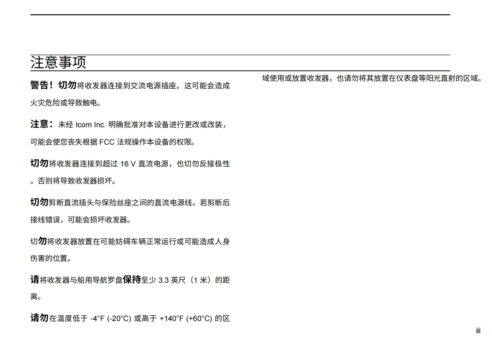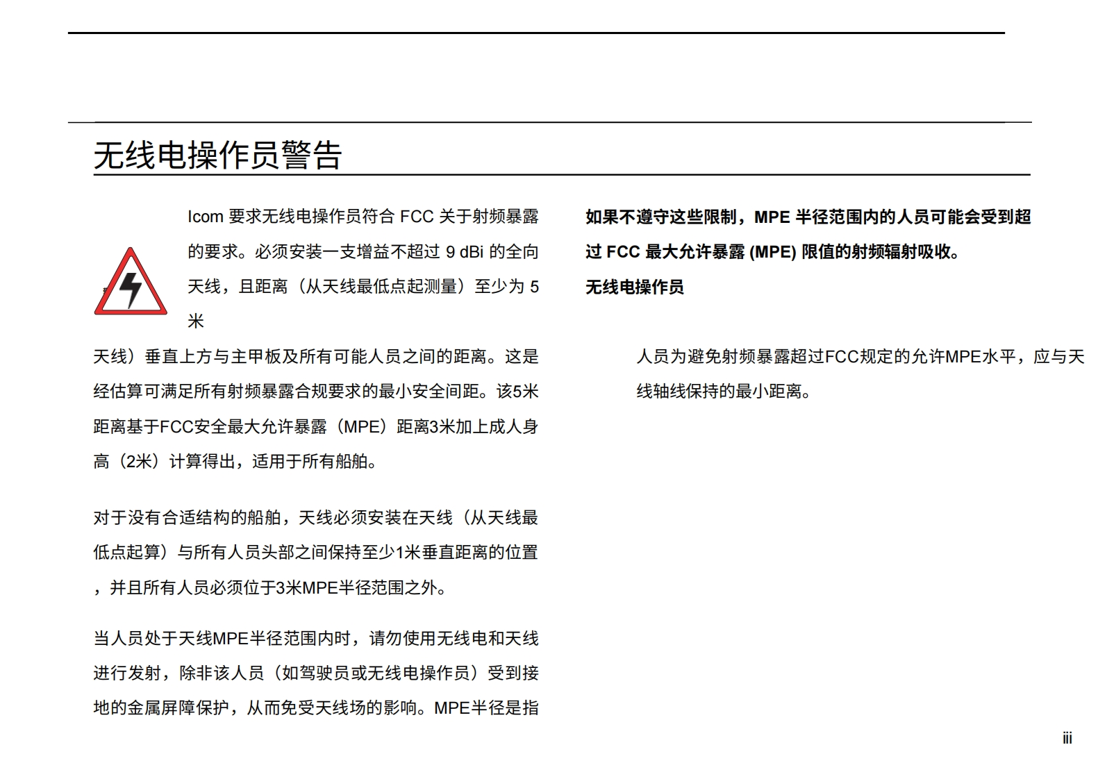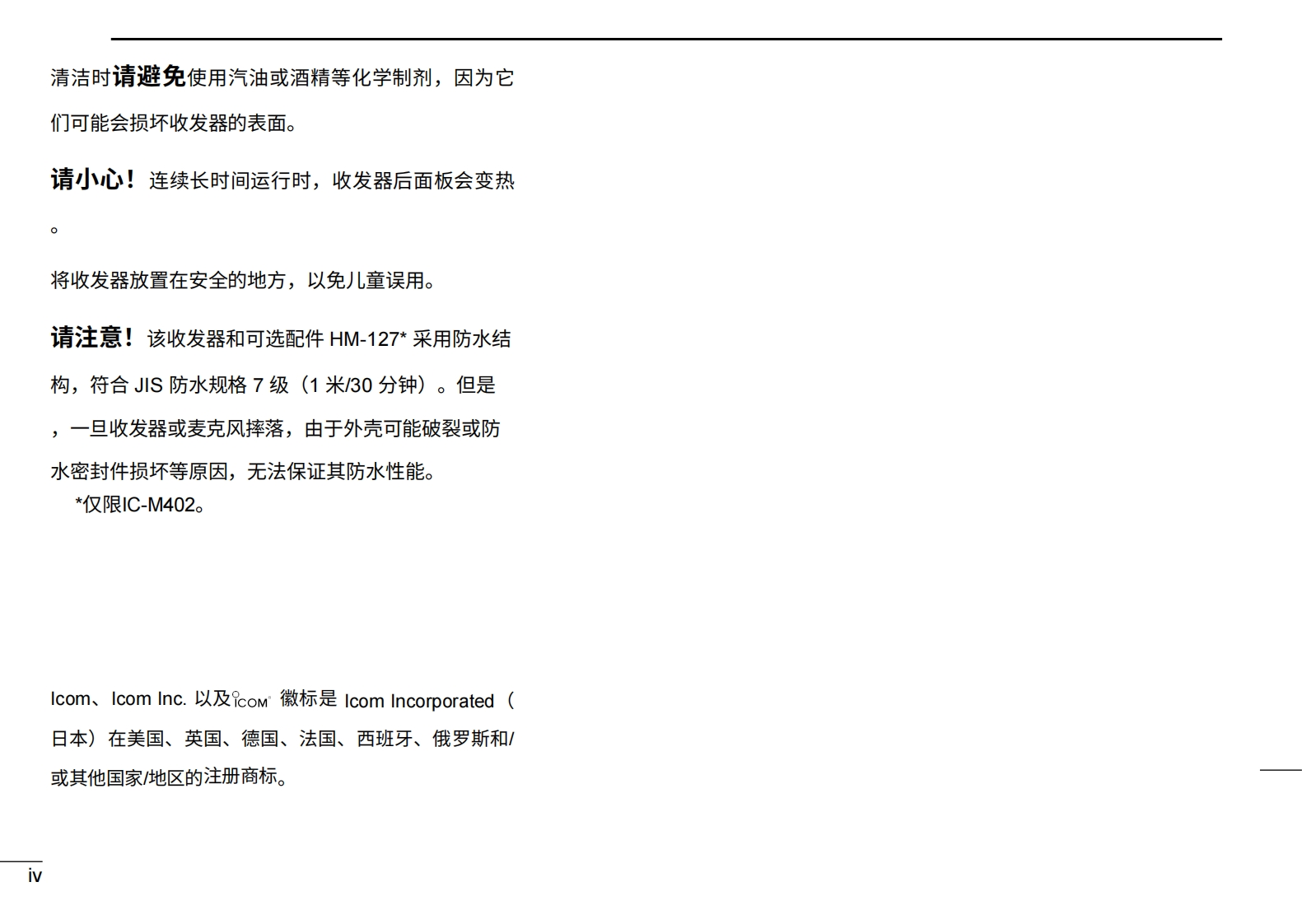 艾可慕icom_icm402-402s_使用说明书手册20260331中文版找手册网3天前发布关注私信4.16MB93页040艾可慕icom_icm402-402s_使用说明书手册20260331中文版此内容为付费资源,请付费后查看¥19¥21黄金会员免费钻石会员免费登录购买付费资源 第1页 / 共93页 第2页 / 共93页 第3页 / 共93页 第4页 / 共93页 第5页 / 共93页 第6页 / 共93页 第7页 / 共93页 第8页 / 共93页 第9页 / 共93页 第10页 / 共93页 试读已结束,还剩83页,您可下载完整版后进行离线阅读 THE END艾可慕 文本预览 COM人0使用说明书VHF船用收发机iM402(兼容遥控麦克风)COMVOLVHF船用收发机BUSYLOWiM402SCANICOMVHF MARINE1C-M4029DUAL16CH/WXH/L本设备符合FCC规则第15部分的规定。使用须遵守以下两个条件:(1)本设备不得造成有害干扰;(2)本设备必须接受任何接收到的干扰,包括可能导致意外运行的干扰。1C-M402 查看更多 收起部分 喜欢就支持一下吧收藏