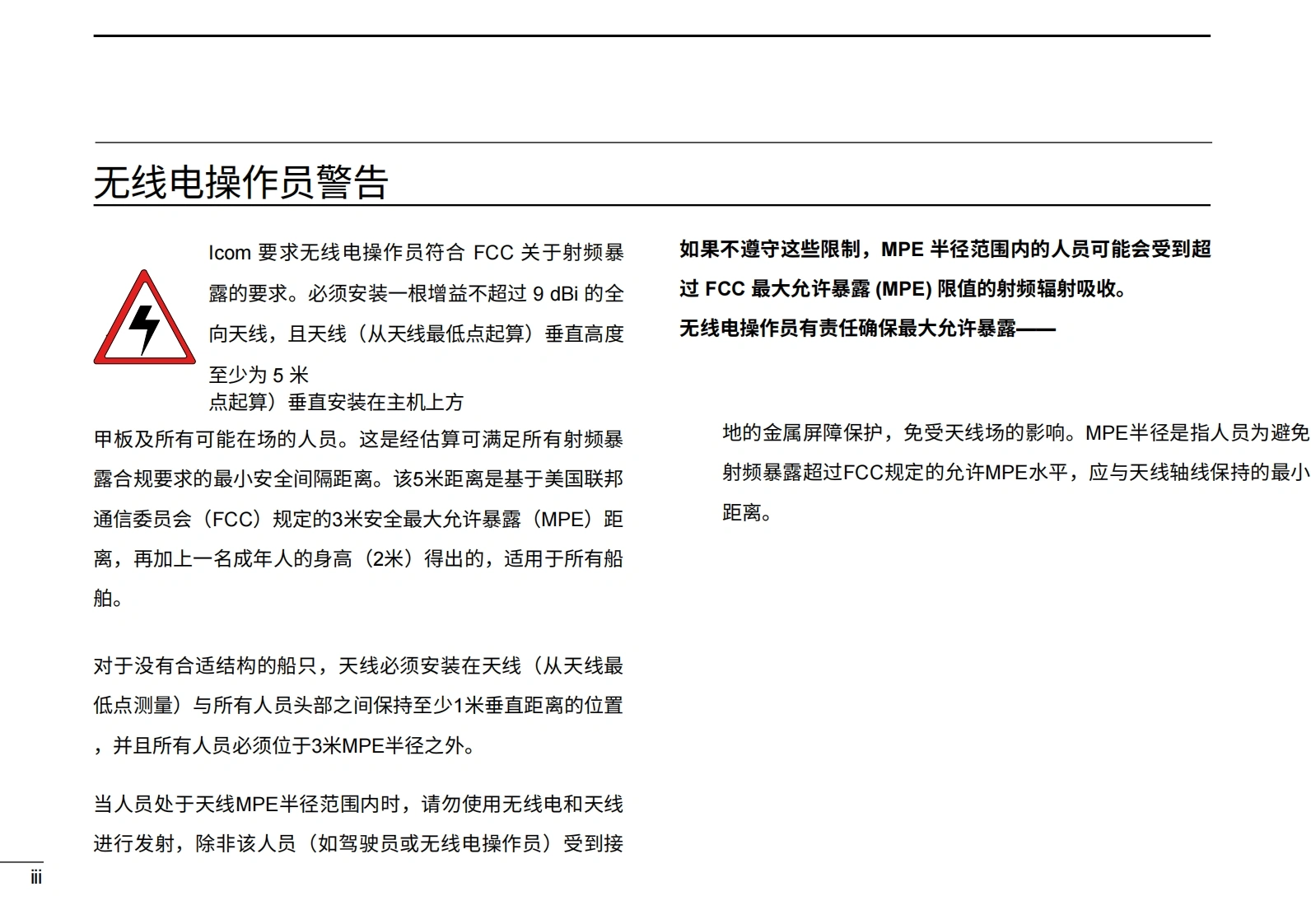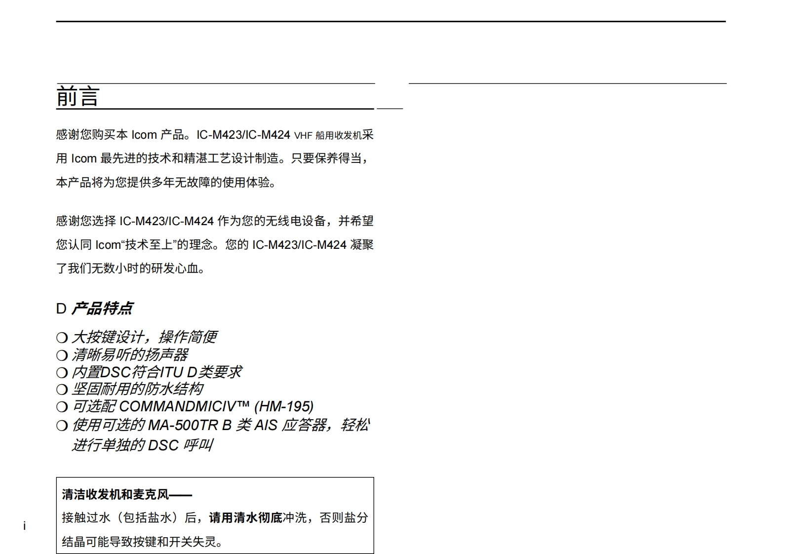 艾可慕icom_icm423-424_使用说明书手册20260331中文版找手册网3天前发布关注私信4.65MB191页040艾可慕icom_icm423-424_使用说明书手册20260331中文版此内容为付费资源,请付费后查看¥19¥21黄金会员免费钻石会员免费登录购买付费资源 第1页 / 共191页 第2页 / 共191页 第3页 / 共191页 第4页 / 共191页 第5页 / 共191页 第6页 / 共191页 第7页 / 共191页 第8页 / 共191页 第9页 / 共191页 第10页 / 共191页 试读已结束,还剩181页,您可下载完整版后进行离线阅读 THE END艾可慕 文本预览 COM使用说明书VHF船用收发机iM423iM424COM25W USARX0目:88816FEB 16 12:00 CALLINGMENUCLEARSCAN DWHI/LO CH/WX本设备符合美国联邦通信委员会(FCC)规则第STRESS615部分的规定。使用本设备须确保不会造成有害干扰。 查看更多 收起部分 喜欢就支持一下吧收藏