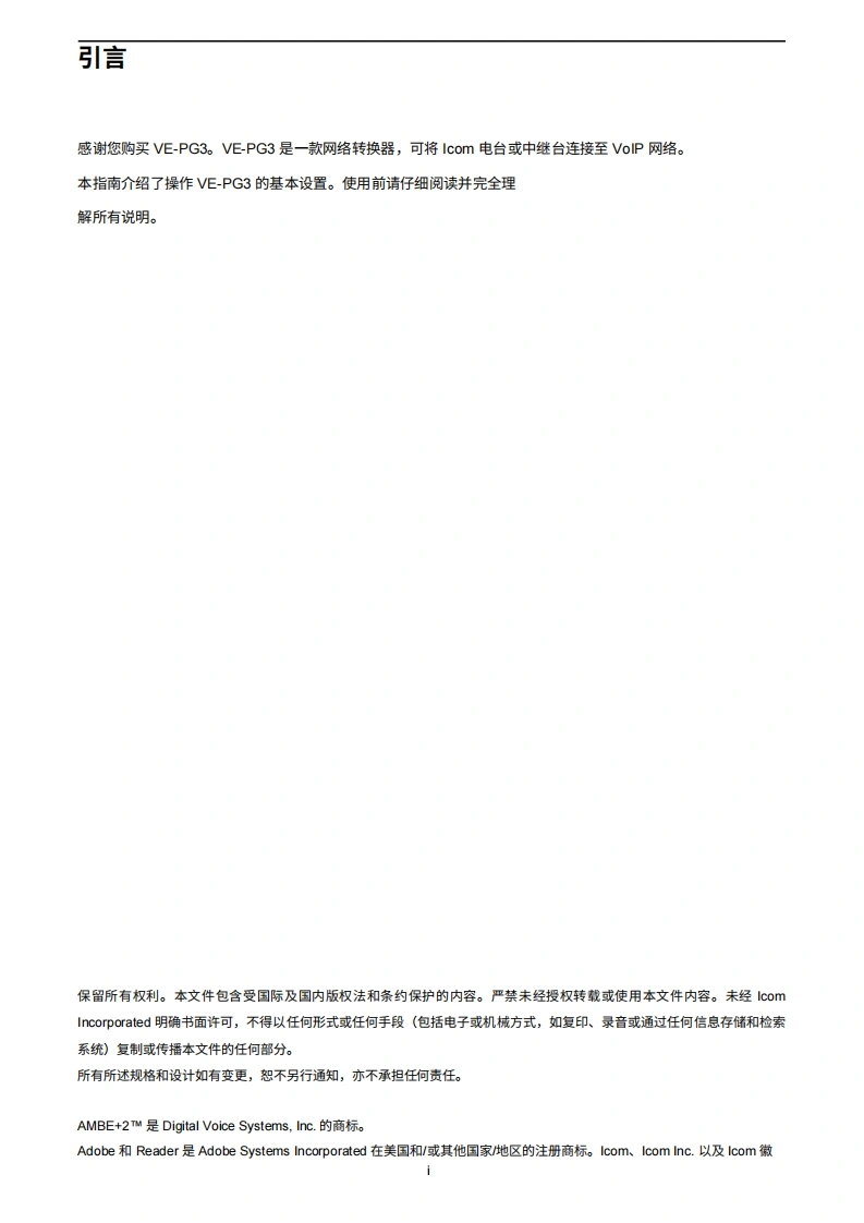 艾可慕Icom_VE-PG3_使用说明书手册20260331中文版找手册网3天前发布关注私信15.73MB463页037艾可慕Icom_VE-PG3_使用说明书手册20260331中文版此内容为付费资源,请付费后查看¥19¥21黄金会员免费钻石会员免费登录购买付费资源 第1页 / 共463页 第2页 / 共463页 第3页 / 共463页 第4页 / 共463页 第5页 / 共463页 第6页 / 共463页 第7页 / 共463页 第8页 / 共463页 第9页 / 共463页 第10页 / 共463页 试读已结束,还剩453页,您可下载完整版后进行离线阅读 THE END艾可慕 文本预览 icom使用说明书RolP网关引信VE-PG31使用VE-PG3之前2桥接模式的应用3转换器模式的应用4模拟电话应用5桥接模式设置界面6转换器模式设置界面7维护8供您参考。。。·。。。a 查看更多 收起部分 喜欢就支持一下吧收藏