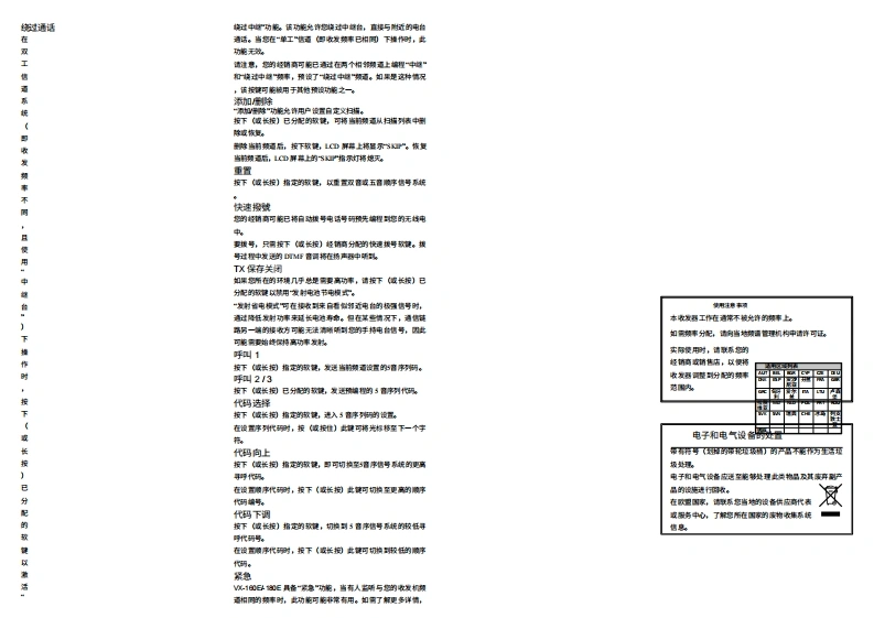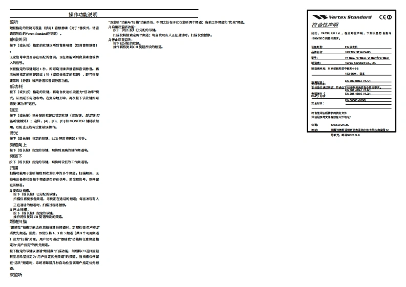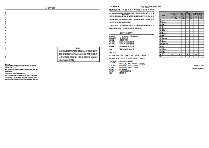 S Vertex Standard开始之前操作VX-160E).180E电池组的安装与拆卸准备工作A复速列,按PT开关,以正常操作手册A要安装电地,选用左餐仕对机,于家盖扬声得,押指口按丽前文所市速,精充满电的电对相安装收发机上。语音肩星对精前面松网的麦克酸在A将璃的天域柠入天线接口切在未连缓天的情况下☒建控制与接器】,将电功睡入无姓电有更电对8例,请精要带夹向外情撞作农发机佐下角)处,以正常音量就话料,然后关闭电道和群科T开关A如课您有扬声再/麦克风,元门建滨在林地么80以10E精电对意未扣推典的蘑本撞作之莉,不麦精其连锡入,直到听到A如课配格杨南/麦克风,取下农发得侧的响蒸及其味嗜”一声镇定t操作快速入门精后锅声宽克天能到位要取出电的,遗先为闭农音机井取下任何保护需年打开农音A顺时针装转顶幕面板上的机直机的电仓未扣,S?接口:使用扬声西麦克璃附的候世因定情头调@LPR旋阳,打开收音机时,精扬西网罩贴链耳朵发进列,按下扬声再废克贝,然后一边置要带夹,一边精电这的下清动种从收音机量南泰过中取出上的PT开关,操作方武5主农发机机身上的槽作相网。装健为话0PTD意精:遗受善很存家装望料蒸及其安装量世年在不侵用扬月关A使转顶和重极上跨QH话样装日麦克E印顿贵打开任何罗充电电烟。内虹果不小心理某罗·菇挥所离的情作模式声得麦克军列,应精其重新安装位整六发生院A旋转VQV风旋阳以调节音星显示图标与指示灯(仅极2%10E电量不足提示华如果没有售号,请按位性数付灯满认级园o叫动就真礼精灰推CD口随希侵用过程中电的我电,电压☆蓬降任高电的电压ONTOR镜所视进到,遗佐侧下方的按回性固标为电量不是物的,当遗更特一续刚充好电的电的,精电量具尽的电姐重新1,5秒以上:其时将所到青横滩声,您可以料用滩声调有地电正运甲道大法家工们克风时,海过起充电酱电功电过例,对储机顶和的碳s指灯进©P风旋阳将音量调节字所两水界SKIP接位0NT0R期过L.5秒(度软观收运母精闪海式依%10E机型上,1CD群聘上精示可按下图标),口遗意免在两皮充电之阔侵用较少的情凡下预繁给博怎电的ONT0R镜两欢),以消除难音并恢复正常(静溶)苦两(默性每的认2售或5性盘养切书在打满充电,团为这☆降任电的充电容量们年状方末开1健璃身携帝一相颗外的.已充满电的电的拥,以便精正认设司华可子子在使用的电地用副电星尽这种深度福环接术有助于持电期容学重要知则)请仔性冥读本手舒,两艺本程发机的海项时能。)发射时,请将无域电设备垂直罐特麦克风正离浅巴之5至5厘米,无域正离失幕和身体至少2,5夏米。)在型的按视通话《啊司配言下,无域电组备的量大工作占空比不得明过5请液发时间还到无域纯设备徒用时等%空比】若发射时间5%,可能导致时规仅司暴明标当无城电和的红色1印夹时,表示正在发射。您可调按下T按在债域电开端发林)当无线电设备以网数视配合以下井债用时,请动行发射:装带陕限件号1们)配件仅限在以下情保下使用:〔)发射时与身体附特4厘米平离:内仅用锈声得进行首所杨声程,具心】仅用于携流)电不得暴在阳光火等过境中)请务必徒用Vertex Sn士d授的讲。