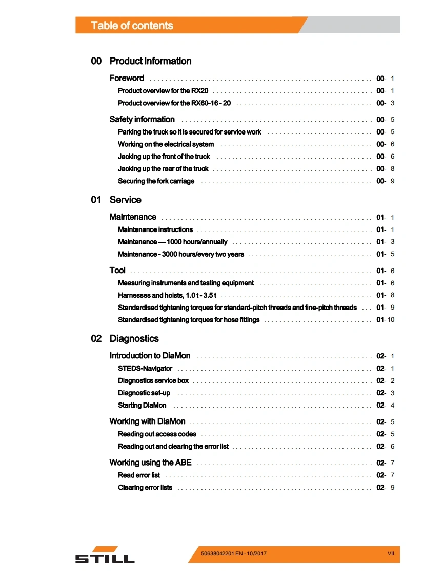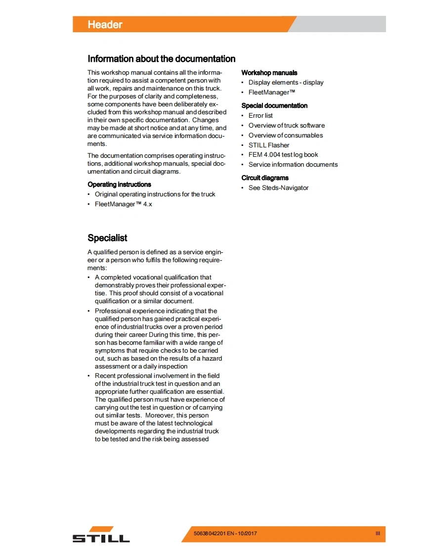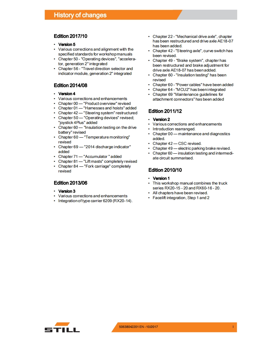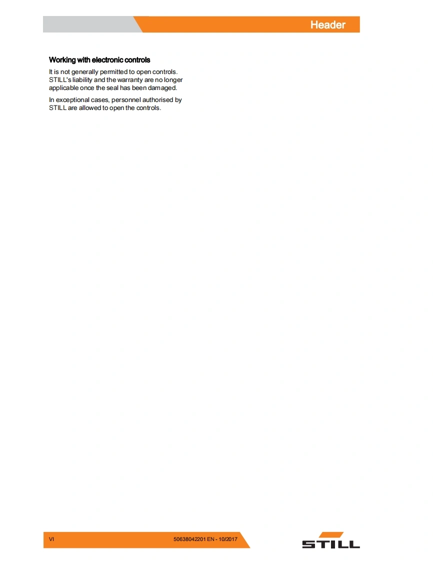 Still-RX20-RX60-Electric-Forklift-Truck-Workshop-Manual维修维护手册含电器液压原理图找手册网7小时前发布关注私信12.48MB472页030Still-RX20-RX60-Electric-Forklift-Truck-Workshop-Manual维修维护手册含电器液压原理图此内容为付费资源,请付费后查看¥39¥41黄金会员免费钻石会员免费登录购买付费资源 第1页 / 共472页 第2页 / 共472页 第3页 / 共472页 第4页 / 共472页 第5页 / 共472页 第6页 / 共472页 第7页 / 共472页 第8页 / 共472页 第9页 / 共472页 第10页 / 共472页 试读已结束,还剩462页,您可下载完整版后进行离线阅读 THE END沃尔沃/MAN曼牌/STILL 文本预览 STILLWorkshop literatureElectric forklift truckRX20-15-20,RX60-16-20620962106211621262136214621562166217631163136315first in intralogistics50638042201EN-10/2017 查看更多 收起部分 喜欢就支持一下吧收藏