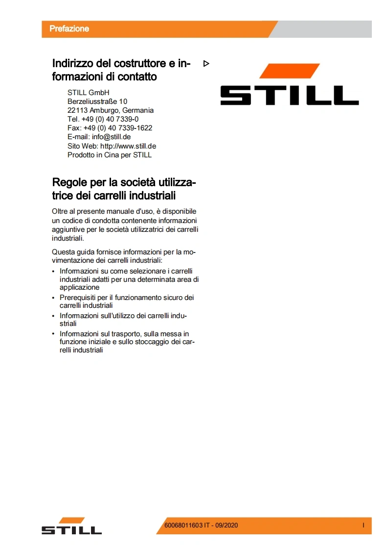 STILL叉车RCD2535IT维修手册含电器和液压原理图-10462找手册网7小时前发布关注私信24.50MB180页047STILL叉车RCD2535IT维修手册含电器和液压原理图-10462此内容为付费资源,请付费后查看¥39¥41黄金会员免费钻石会员免费登录购买付费资源 第1页 / 共180页 第2页 / 共180页 第3页 / 共180页 第4页 / 共180页 第5页 / 共180页 第6页 / 共180页 第7页 / 共180页 第8页 / 共180页 第9页 / 共180页 第10页 / 共180页 试读已结束,还剩170页,您可下载完整版后进行离线阅读 THE END沃尔沃/MAN曼牌/STILL 文本预览 STILLIstruzioni originaliCarrello elevatore dieselRCD25RCD30RCD35(€422142224223first in intralogistics60068011603T-09/2020 查看更多 收起部分 喜欢就支持一下吧收藏