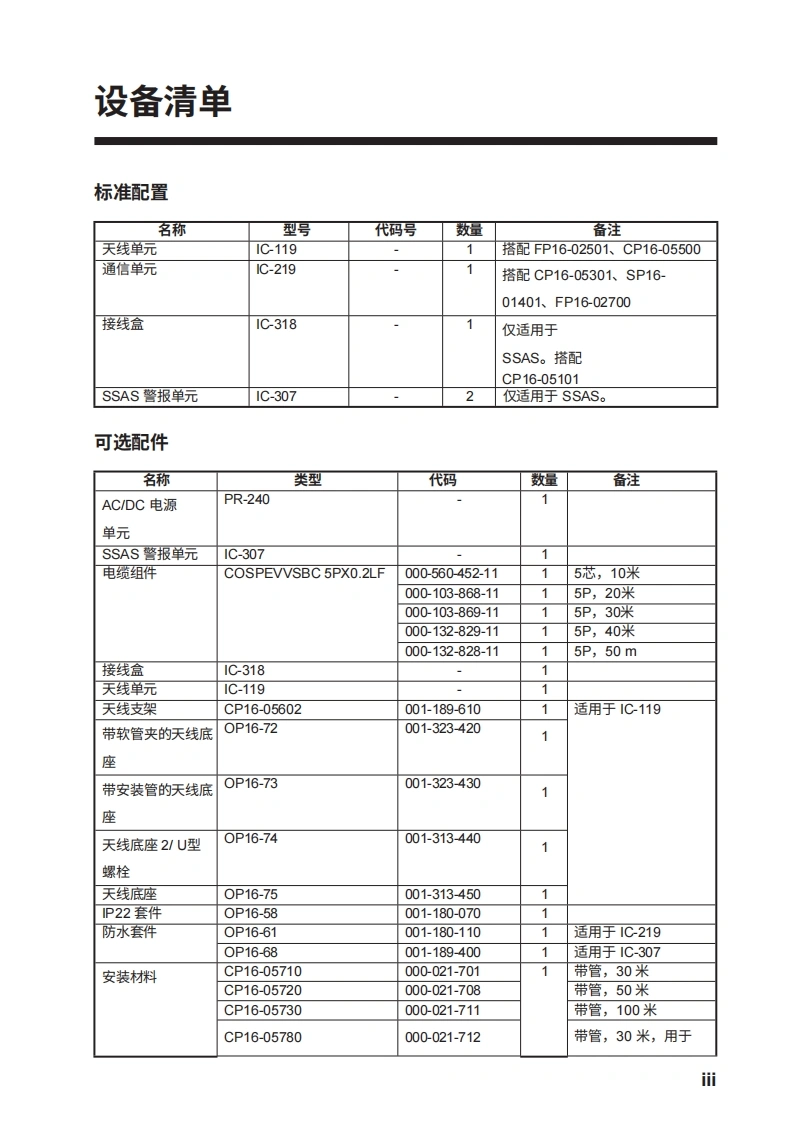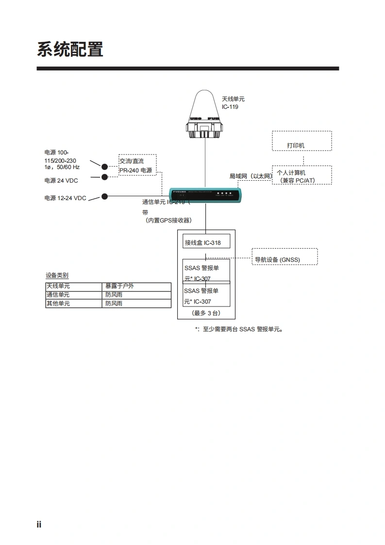 D安装手册INMARSAT MINI-C MES型号FELCOM19安全说明...f系统配置..设备清单…….i1.安装.1-11.1天线单元.1-11.2通信单元.1-31.3接线盒1C-318】.1-41.4AC/DC电源单元PR-240(选配).1-42.接线212.1通信单元上的天线电缆连接器2-22.2接线盒1C-318」2-73.初始设置….……..……3-13.1如何安装软件.3-13.2如何启动软件3-33.3如何设置MN(国际海事卫星组织移动号码)3-53.4如何设置AMS/BAM...3-63.5PC窗口设置.3-83.6如何设置俄语....3-123.7如何使用节省纸张功能..3-123.8如何输出EGC消息.......3-124.如何安装选装设备.………………….4-14.1IPX2套件OP16-58(线缆)/防水套件OP16-60(适用于IC-318)4-14.2防水套件0P16-61(适用于1C-219)4-24.3防水套件0P16-68(适用于1C-307)4-45.如何更改电源规格.5-1附录1J1S电缆指南..…......AP-1装箱单.…。A-1