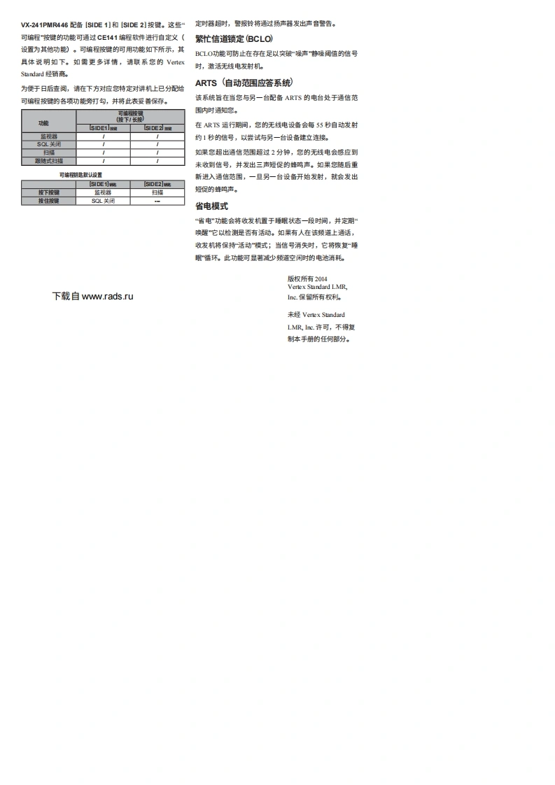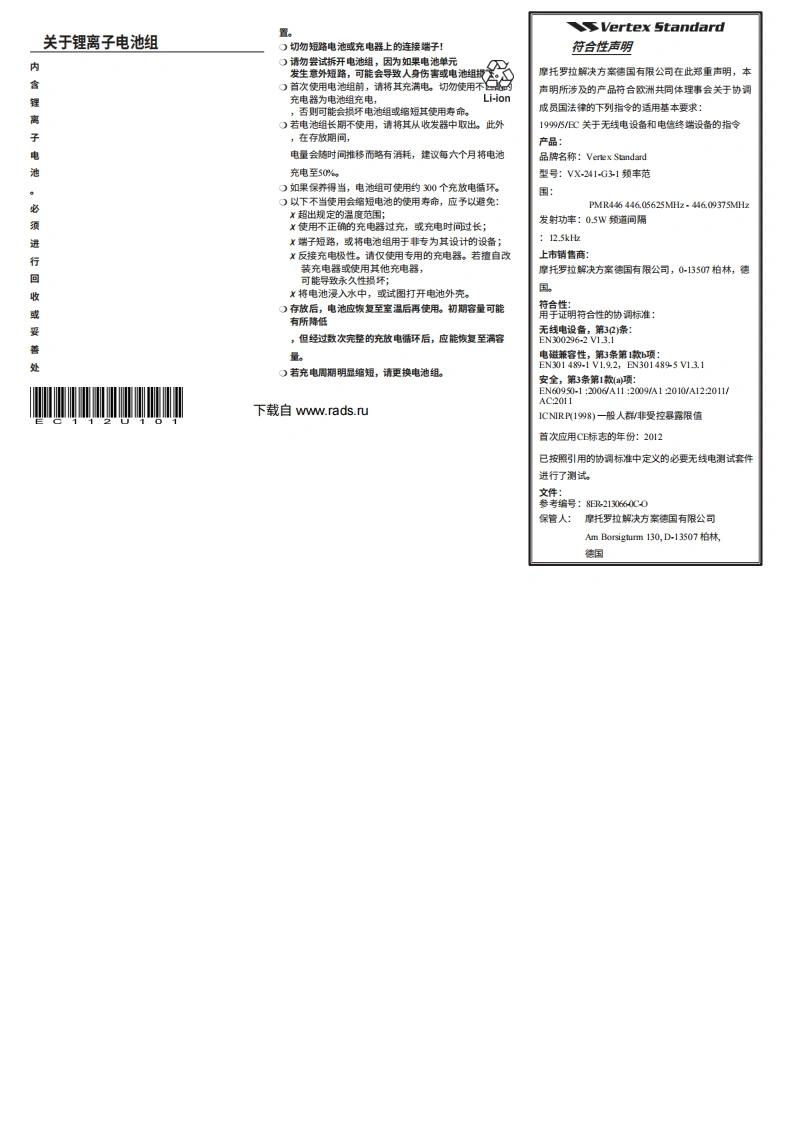 Vertex Standard可选配件随附配件VX-241PMR446FNB-VI03UA7.4V-二,130mAM锂离子电池FNBFNB-V103UA7.4V=,1380mA锂离子电池CD-34快速充电器(VX-241-G3-1)V104UA7.4V二,2300mAh锂离子电池CD-34PA42C或-Uw交流适配器(用于CD3)快速充电器CLIP-18腰带夹PA42CU×操作手册交流适配器(用于CD34)VAC-63006裙多用充电器MH-37A4B耳机废克风VX-241PMR446i认设置MH45848扬声器/麦克风(降燥)】军号丁CTCS8DCSW号MH-360S扬声器/麦克风(小型)MH450ST项通4600325HS1T476F若及0A75g1577】扬声器发克风(微9VC-253道44603125MH23604预通44604375团DCs256刊VOX头戴式耳机5项预通460562州aDCS 02662VCM-2车载充电器支架适配器6情44606875习DCS07172DCM-1桌面充电器支架7道a80825aDcs07273CLIP-18腰带夹通6075CE141编程软件T个002DCS 152(88FIF-12USB编程接口2预道80875aDCs15587CT-27无线电对无线电编程电缆HTRT【Hg可CT-42AC编程线缆(CT29UcS162阿5项面4805825MH2DCs18590+CT-28)6道460675团DCS 205(315H【446025NHs22I9】CT-106C编程线缆(适用于FF12】8通通44809375MHDCS22395※后最C"表示适用于230VAC(C型插头),后最U表示适用于230VAC(BF型插头)腰夹安装件的供应情况可能有所不同。部分配件根摇当地要求作为标准配置提供,而其他件在某些地区可能无法提供。有关这些瓷件以及任何新推出的选项的详细信息,请落询您的erwx Sundand经朝商。连接任何未经Vertex9ada批推的件,如果造成损坏,可能会使本设墙的有限保修失效。Vertex Standard LMR,Inc.电子及电气设备的处置带有此符号(带斜线标记的带轮垃圾桶)的产品不得作为生活垃圾丢弃。电子和电气设备应送至具备处理此类物品及其废弃副产品能力的设施进行回收。在家盟国家,请联系您当地的设备供应商代表或服务中心,了解您所在国家的废弃物回收系统下载自ww.rads.ru个重要通知不概述仅限职业用选,这意味着它只能由了解相关危险及如问最大限度降低此类危脸的人员在工作期问使用。本无线电不。请仔细阅读本手册,以熟悉本收发机的各项功能。适用于普通大众在不受控环境中的使用。。发射时,请将无线电设备垂直握特,麦克风距离嘴巴工作温度范围25至5厘米)工作:-25℃至+55℃,并将天线与头部保持至少25厘米的距离)电池充电:+10℃至+0CO在典型的按键通话”PT)配置下,本电台的最大工作占空比不得超过5%。请勿在电台总使用时问中超过5%的时间进行发射(5%占空比)。超过50%的发射时问可能会导致超过射频暴露合规要求。当无线电顶部的红色LED亮起时,表示正在发射。您可以通过按下PTT按钮或使用VC-25型号的VOX耳机来触发发射。)请务必使用FNB.V103LLA键离子电池。。请在环境温度为+10℃至+40C的范围内进行电池充电。超出此范围外充电可能会损环电池组。)电池组不得暴露在阳光、火源等过热环境中。O请务必使用Vertex Standard授权的配件。对于因非Vertex Standard配件故檬而导致的任何损怀或事故(如火灾、电池泄漏或爆炸等)概不负责。)本电台在发射模式下会产生射频电磁能量。本电台的设计用途及分类