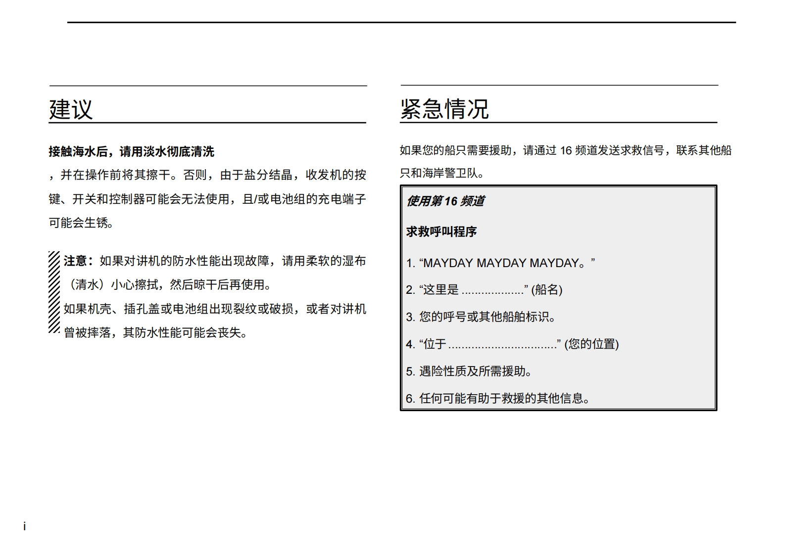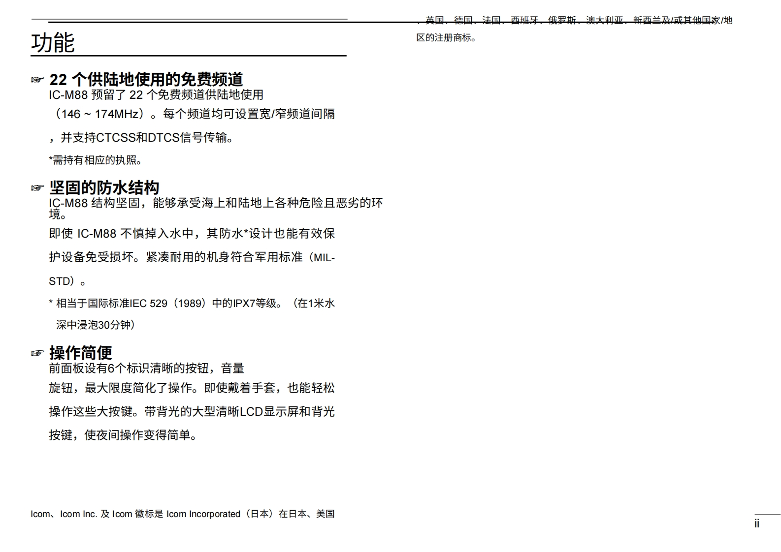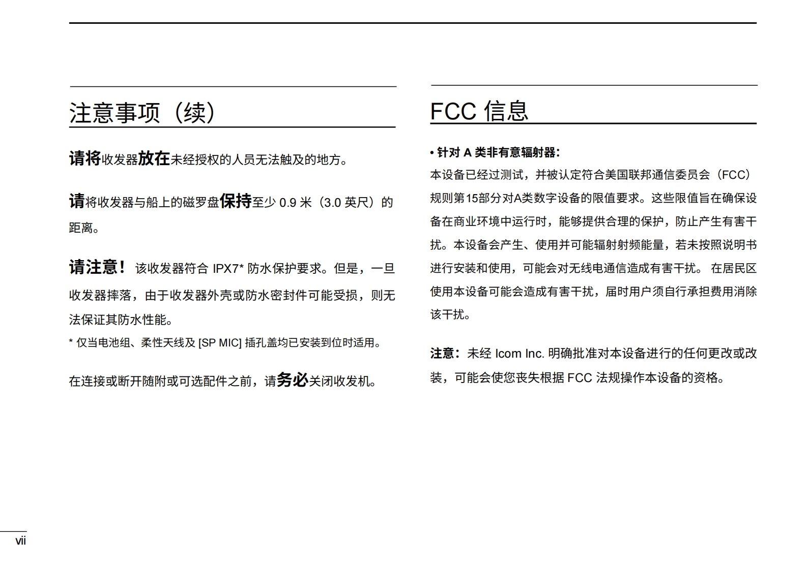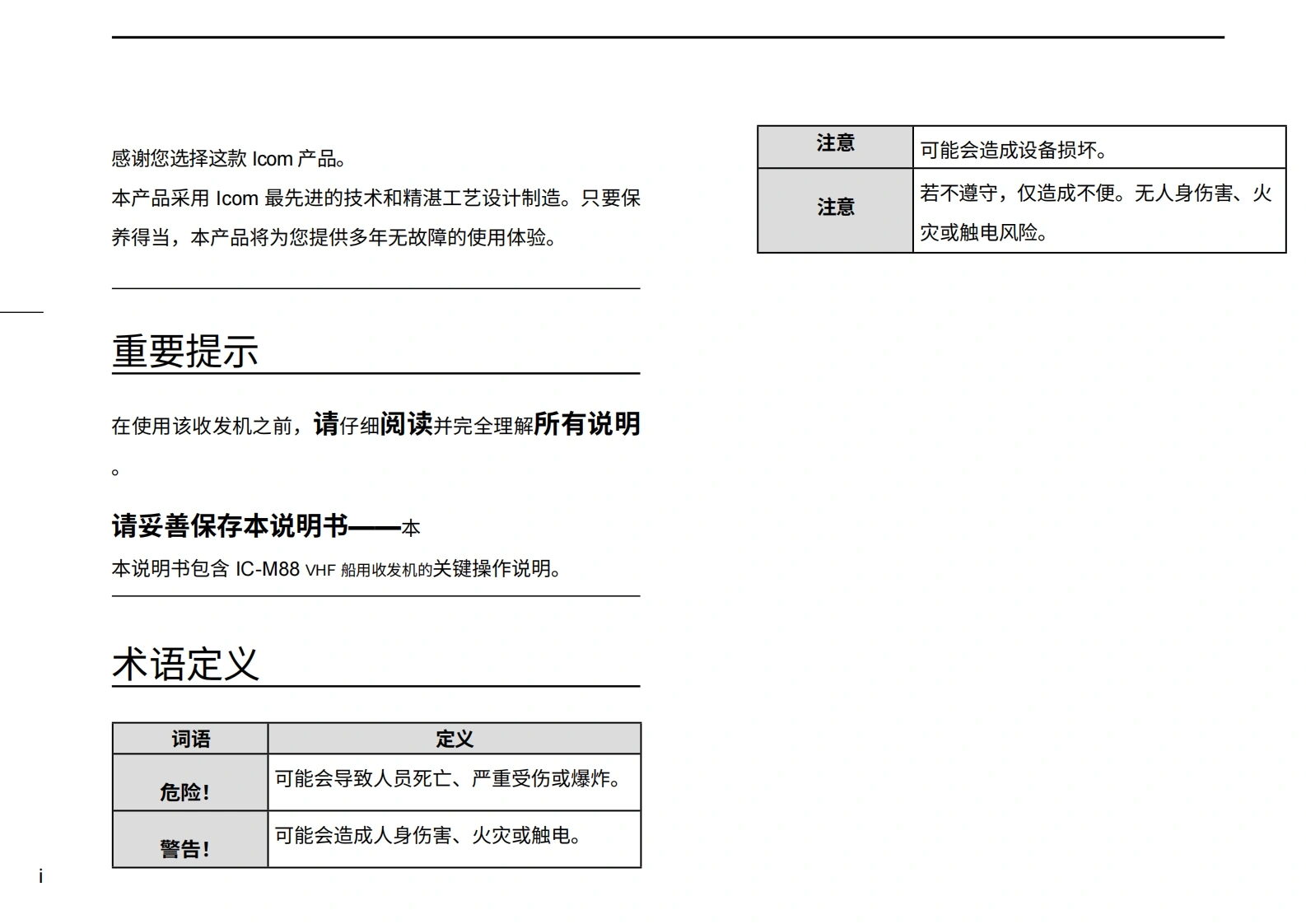 艾可慕IC-M88-Instruction-manual操作说明书手册20260331中文版找手册网前天发布关注私信3.80MB89页031艾可慕IC-M88-Instruction-manual操作说明书手册20260331中文版此内容为付费资源,请付费后查看¥19¥21黄金会员免费钻石会员免费登录购买付费资源 第1页 / 共89页 第2页 / 共89页 第3页 / 共89页 第4页 / 共89页 第5页 / 共89页 第6页 / 共89页 第7页 / 共89页 第8页 / 共89页 第9页 / 共89页 第10页 / 共89页 试读已结束,还剩79页,您可下载完整版后进行离线阅读 THE END艾可慕 文本预览 COM使用说明书VHF船用收发机iM88WATERPROOF本设备符合美国联邦通信委员会(FCC)规则第15部分的规定。使用本设备须确保6IC-M88不会造成有害干扰。AGU/I/C/LDUACH/WXSCNLOCKH/LCOMIcom Inc. 查看更多 收起部分 喜欢就支持一下吧收藏