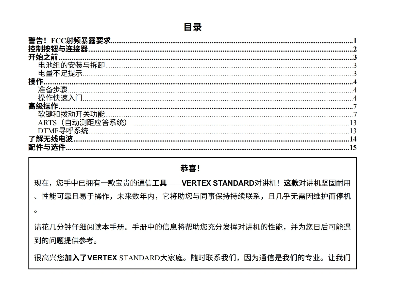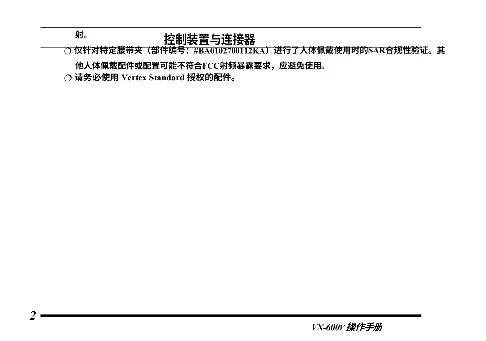 Vertex StandardVX-600V操作手册Vertex StandardVERTEX STANDARD CO.,LTD.日本东京都目黑区中目黑4-8-8,邮编153-8644VERTEX STANDARD美国总部美国加利福尼亚州塞里托斯市爱德华兹路17210号,邮编90703国际事业部美国佛罗里达州迈阿密市西北52街8350号201室,邮编33166YAESU EUROPE B.V.P.O.Box 75525,1118 ZN Schiphol,The NetherlandsYAESU UK LTD.英国汉普郡温彻斯特温纳尔克洛斯太阳谷商业园12单元,邮编:SO230LBYAESU GERMANY GmbHAm Kronberger Hang 2,D-65824 Schwalbach,GermanyVERTEX STANDARD HK LTD.香港九龙观塘海滨道139-141号海景中心20楼5室