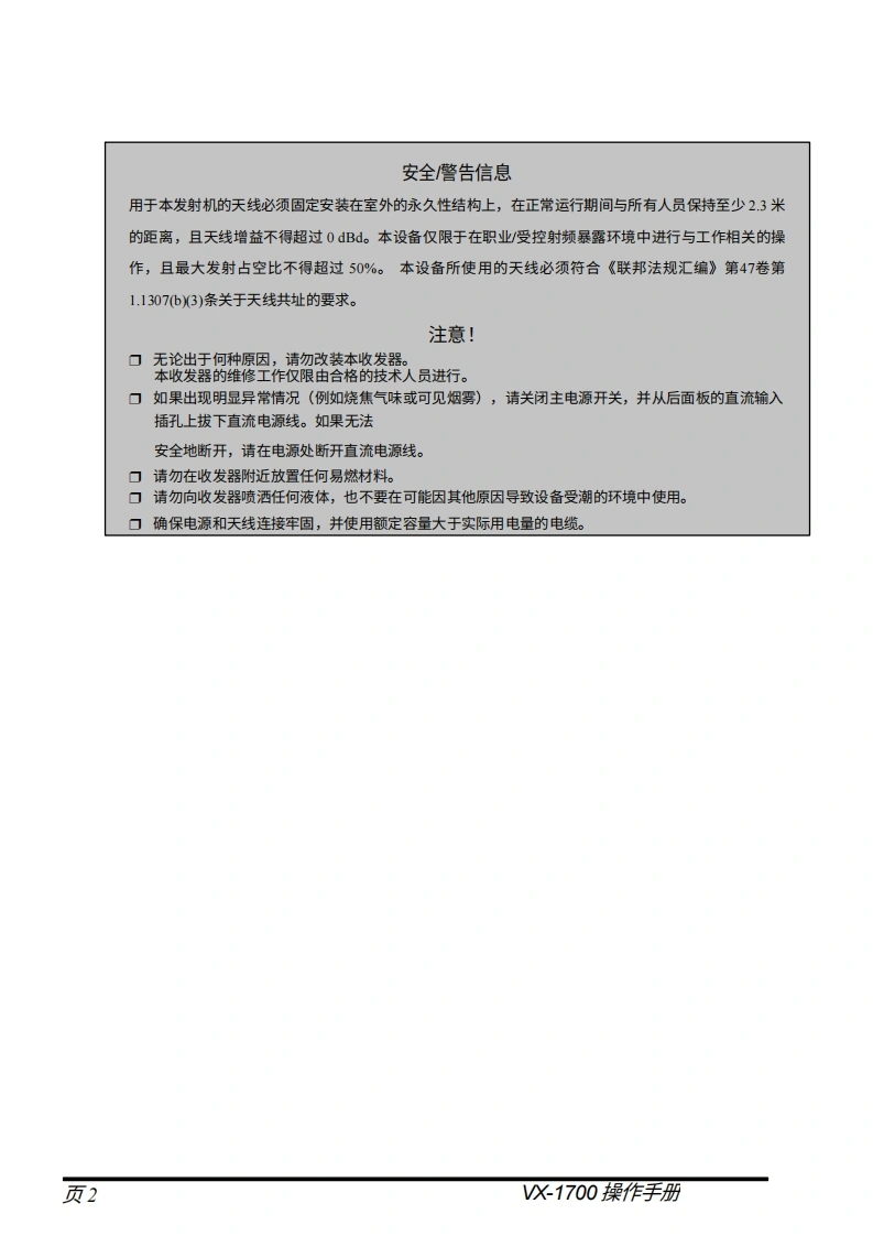 vertex-standard-威泰克斯Vertex_VX-1700_series_USA_version_user操作说明书手册-20260409中文版找手册网前天发布关注私信2.11MB49页036vertex-standard-威泰克斯Vertex_VX-1700_series_USA_version_user操作说明书手册-20260409中文版此内容为付费资源,请付费后查看¥19¥21黄金会员免费钻石会员免费登录购买付费资源 第1页 / 共49页 第2页 / 共49页 第3页 / 共49页 第4页 / 共49页 第5页 / 共49页 第6页 / 共49页 第7页 / 共49页 第8页 / 共49页 第9页 / 共49页 第10页 / 共49页 试读已结束,还剩39页,您可下载完整版后进行离线阅读 THE END威泰克斯 文本预览 SVertex StandardVX-1700操作手册Vertex Standard LMR,Inc 查看更多 收起部分 喜欢就支持一下吧收藏